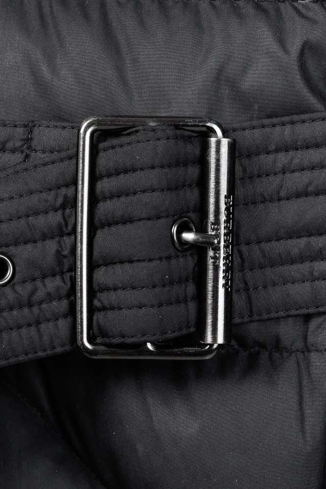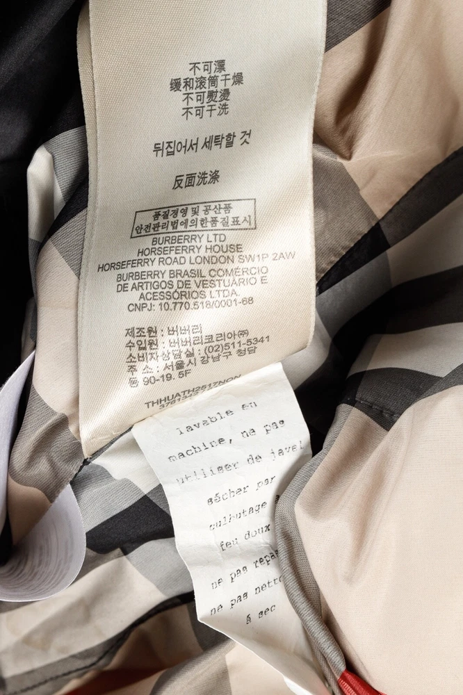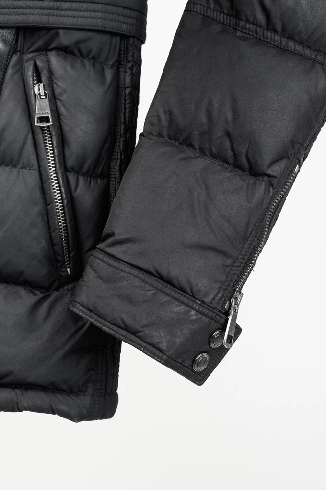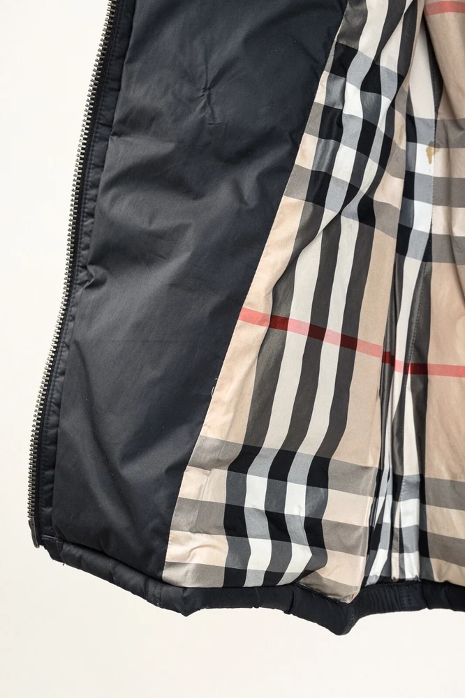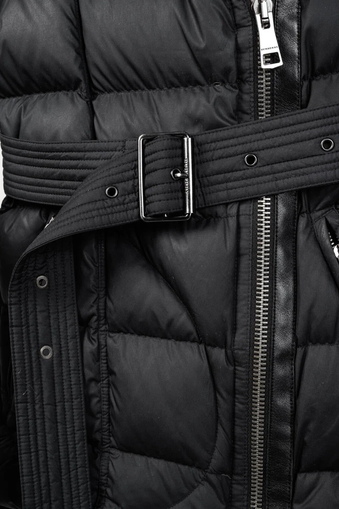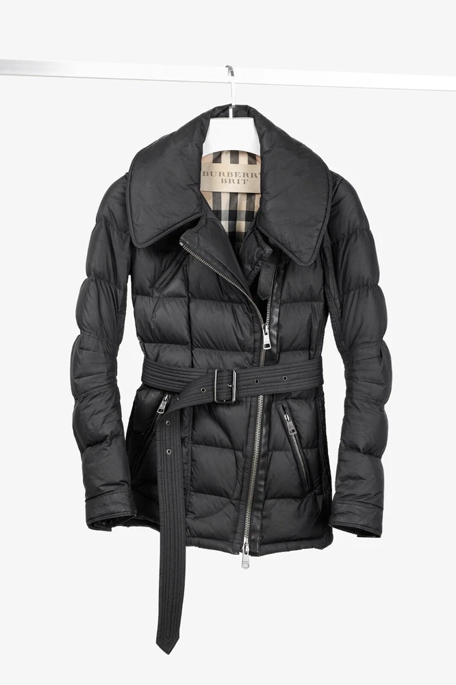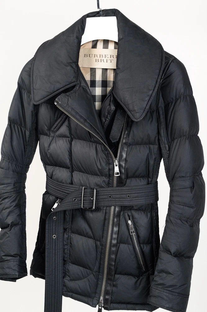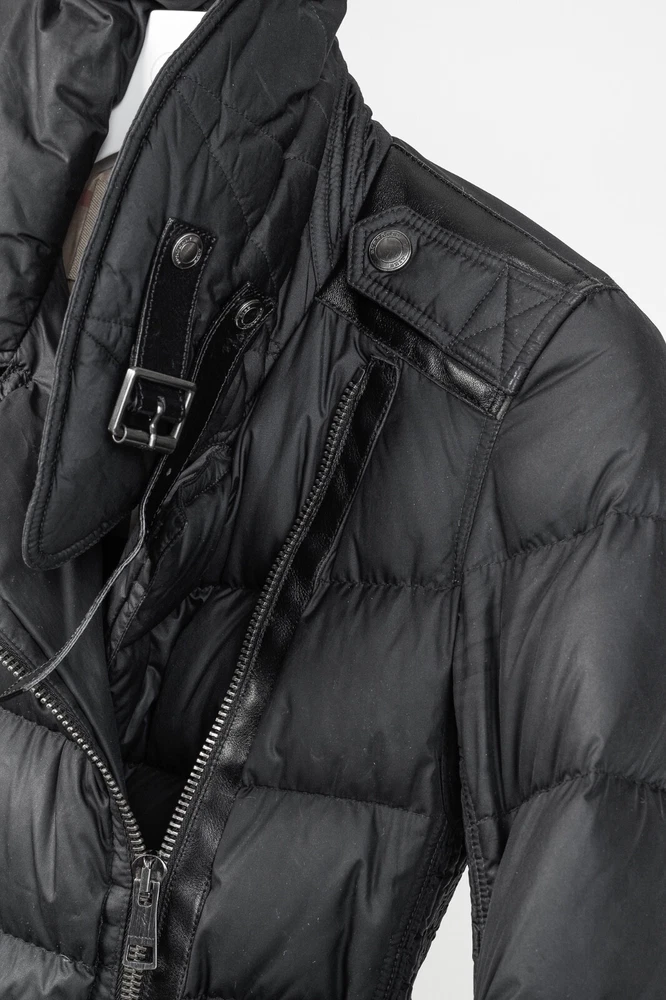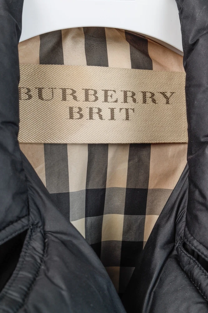 This puffer jacket from Burberry Brit is crafted in a quilted charcoal black synthetic insulated with goose down and feathers, and is trimmed with a tonal leather. It features long sleeves, zip and snap closures on the cuffs, snap-closure shoulder epaulettes, a collared neckline, a belted throat latch secured with snaps, an offset front zip closure with two pulls, a right zip chest pocket, a self belt, front zip pockets, shirring on the underarms and sides; and is lined in a check satin on the body, and a tonal satin on the sleeves. Size: XS Condition: Very good; tearing on armhole lining seams; some marking on neckline, sleeves, and back right hip; light discolouration on hardware. Approximate Measurements (laid flat): Shoulder: 14.5" (37 cm) Chest: 15.75" (40 cm) Waist: 13.5" (34 cm) Length from back: 26" (66 cm) Sleeve length: 23.75" (60 cm) Composition: Main fabric: 100% polyester. Lining: 100% polyester. Sleeve lining: 100% cupro. Filling: 85% grey goose down cluster, 15% grey goose feather.