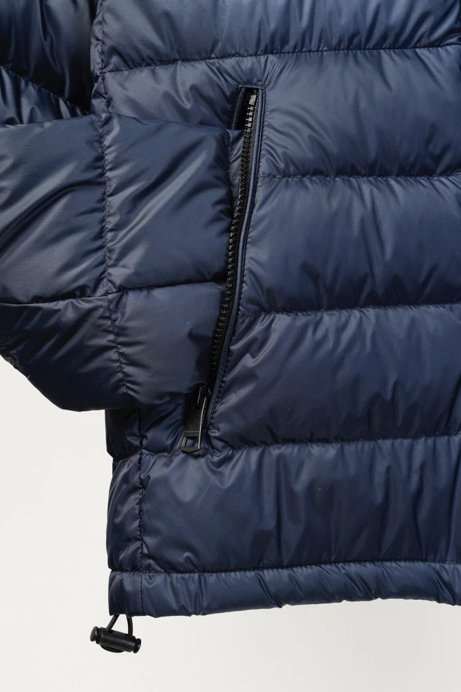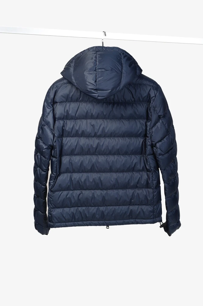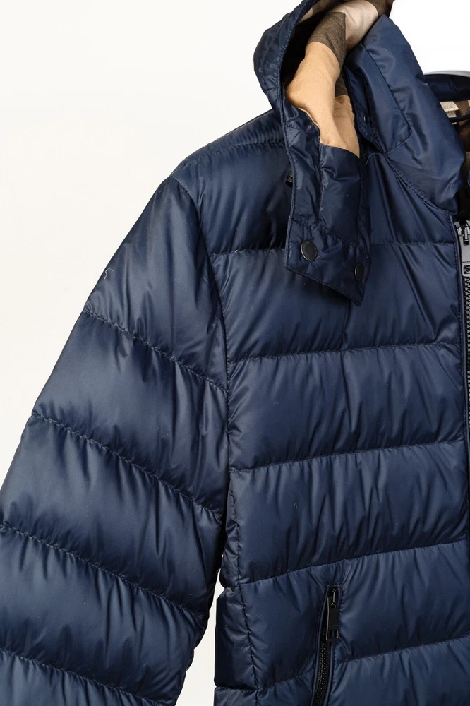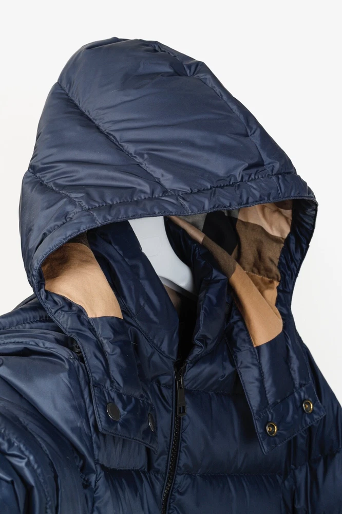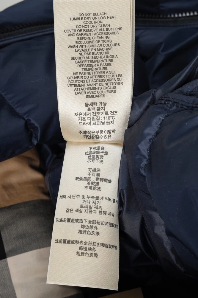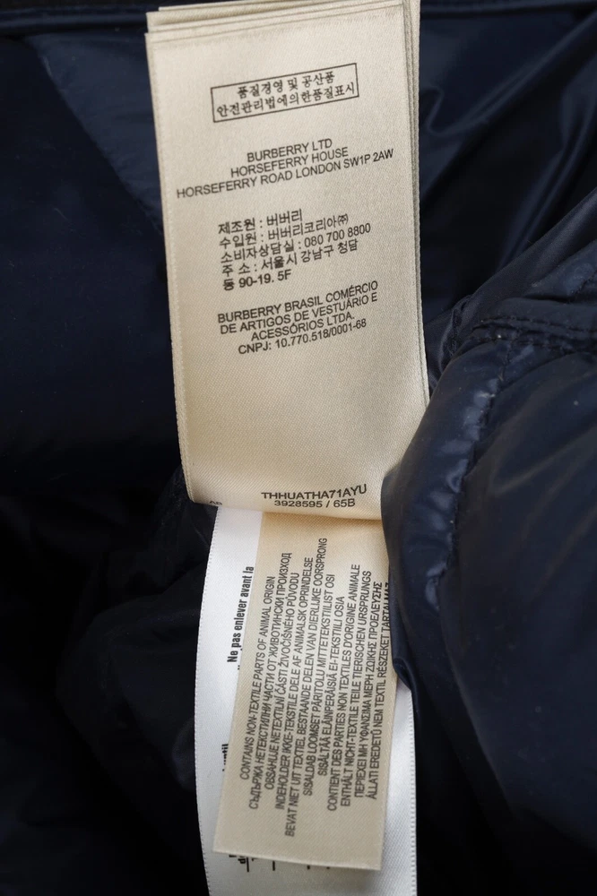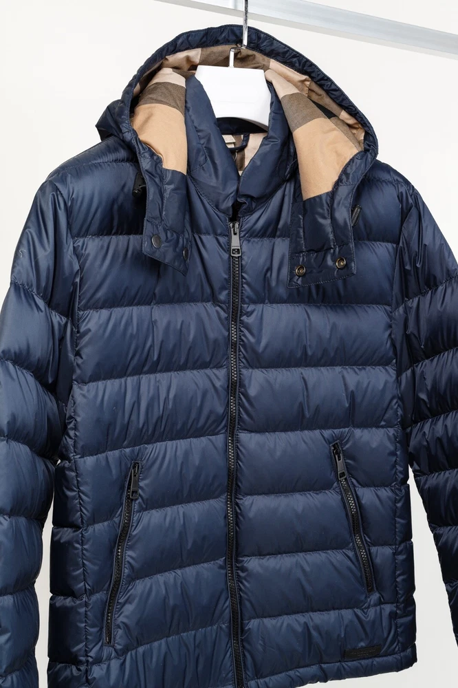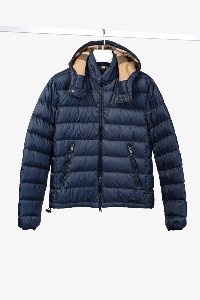 With a tailored fit and iconic Nova Check pattern, the Burberry Brit Mitchson Navy Blue puffer jacket is a stylish and functional choice. Made with lightweight quilted down, it offers excellent insulation for colder weather, and features long sleeves, elasticized cuffs, a stand collar with a detachable drawcord hood, a front zip closure, front zip pockets, and a drawcord hem. Stay warm and fashionable with this versatile jacket. Size: M Condition: New with tags. Approximate Measurements (laid flat): Shoulder: 18.5" (47 cm) Chest: 20.5" (52 cm) Length from back: 25" (63.5 cm) Sleeve length: 26.5" (67 cm) Composition: Outer/main fabric: 100% polyamide (nylon). Upper body lining: 100% cotton. Hood lining: 100% cotton. Lower body lining: 100% polyamide (nylon). Sleeve lining: 100% polyamide (nylon). Down content: 80% greylag goose grey down cluster, 20% greylag goose grey down feathers.