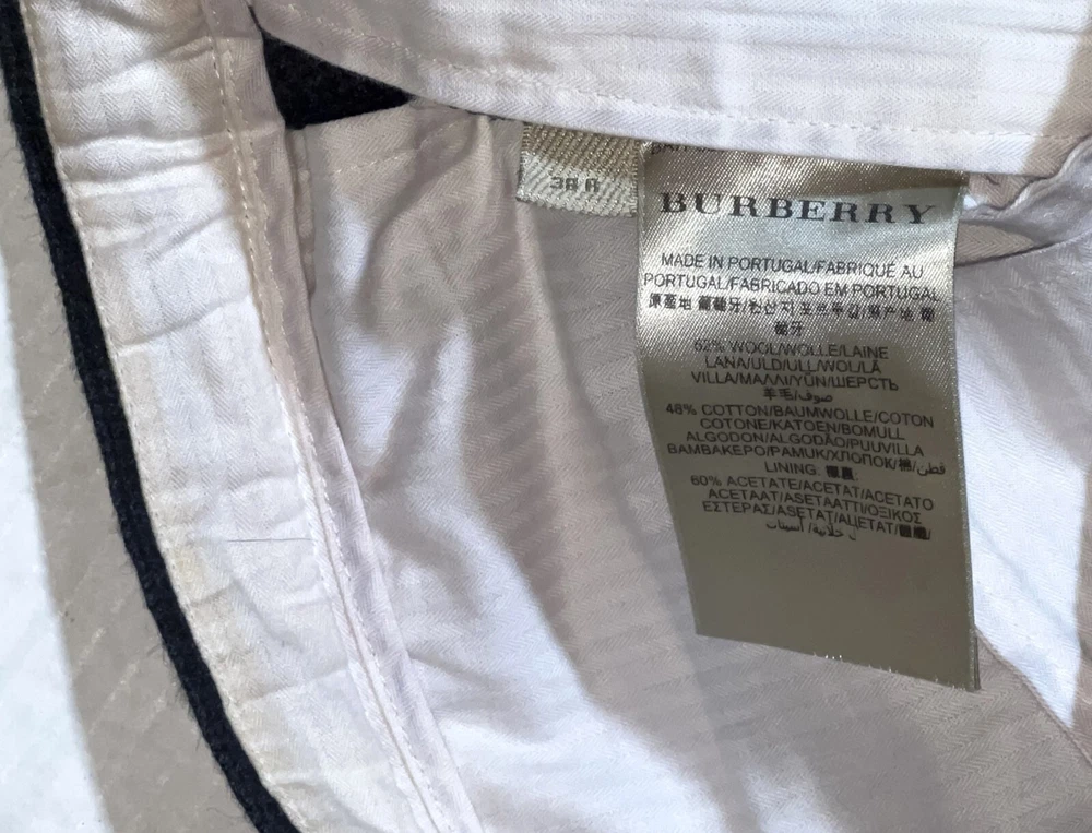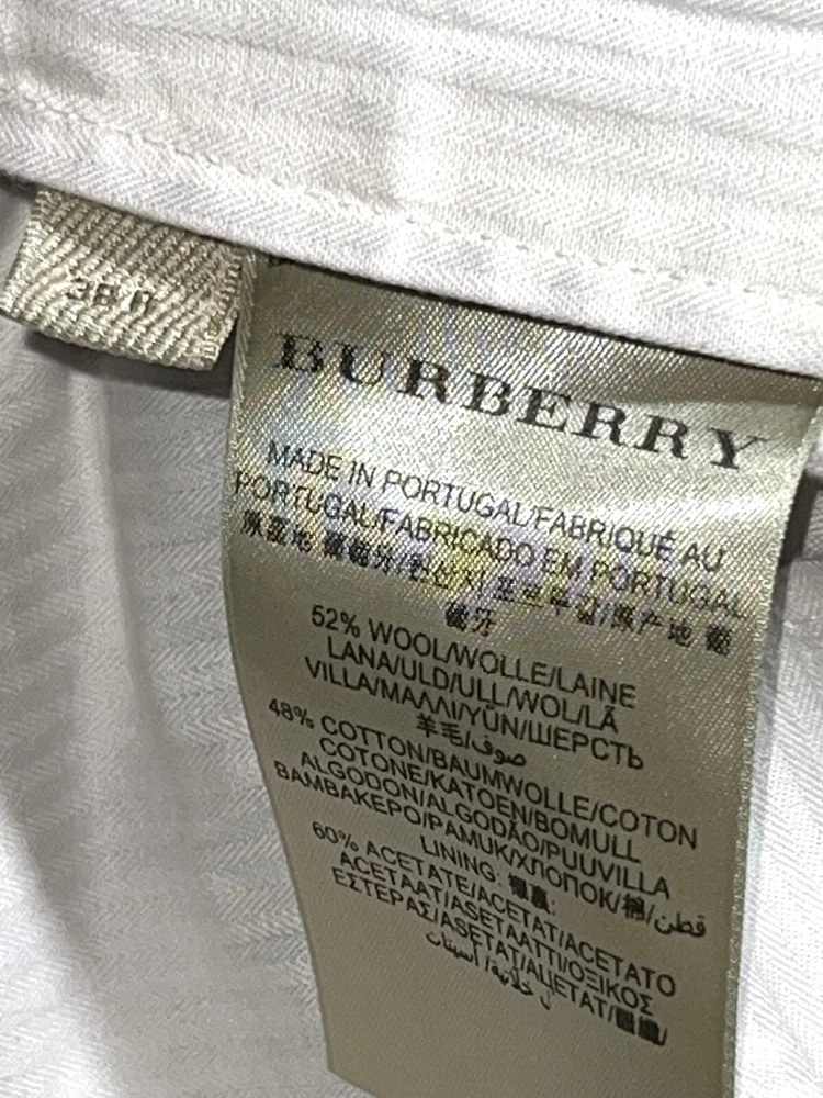 Style: Dress Pants Front Type: Flat Front Size Type: Regular Rise: Low (8-10 in) Department: Men Features: Adjustable Waist, Pockets Pocket Type: 4 Pockets Fabric Type: Wool Blend Waist Size: 38 in Pattern: Solid Occasion: Business Brand: Burberry Brit Type: Pants Accents: Logo Color: Blue Closure: Button, Zip Inseam: 33.5 Seller Notes: “Great gently used condition. Minor discoloration along inside lining rim, see pics.” Size: 38 Country/Region of Manufacture: Portugal Material: Acetate, Cotton, Wool