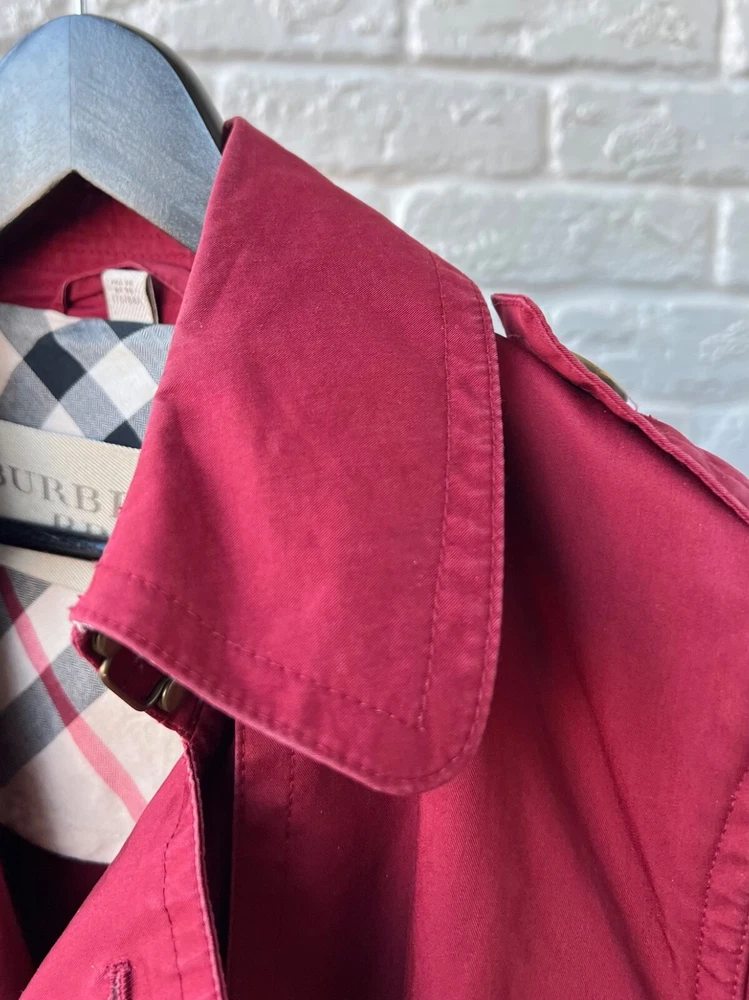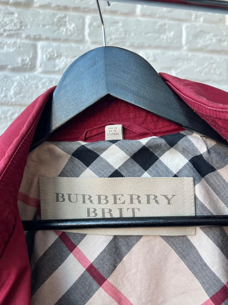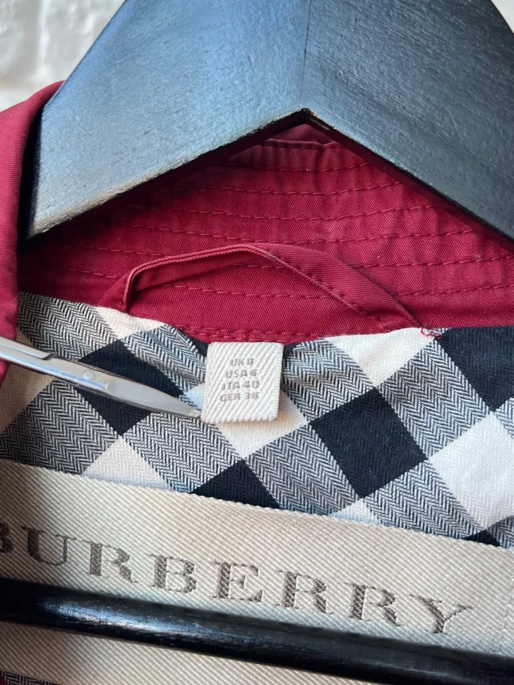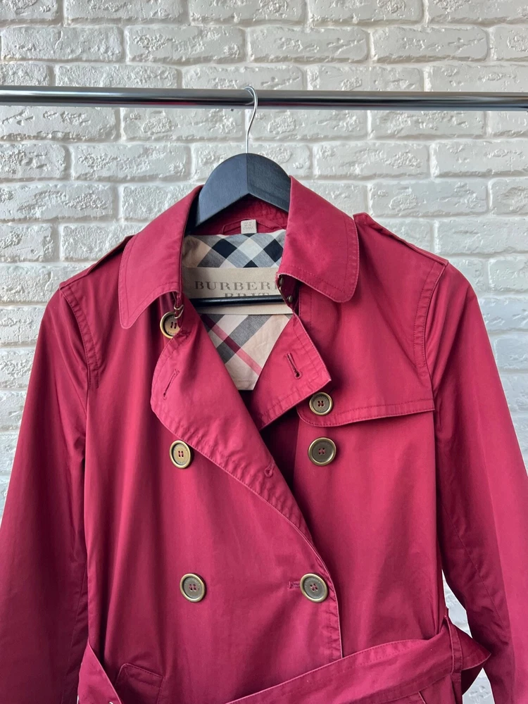 Size Type: Regular Brand: Burberry Size: 40 Pattern: Check Color: Red Outer Shell Material: Cotton Style: Trench Coat Features: Belted Department: Women Type: Jacket Model: Burberry Brit