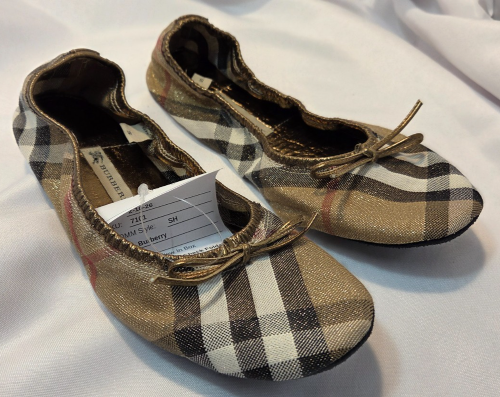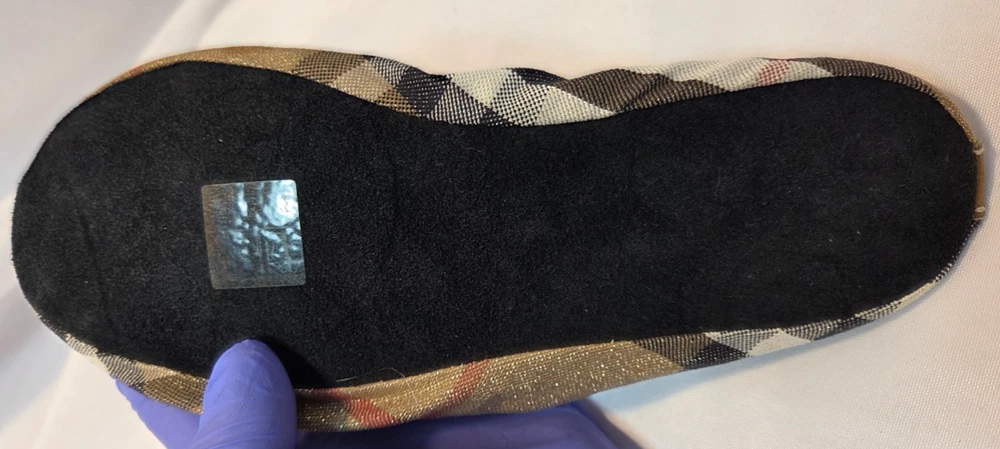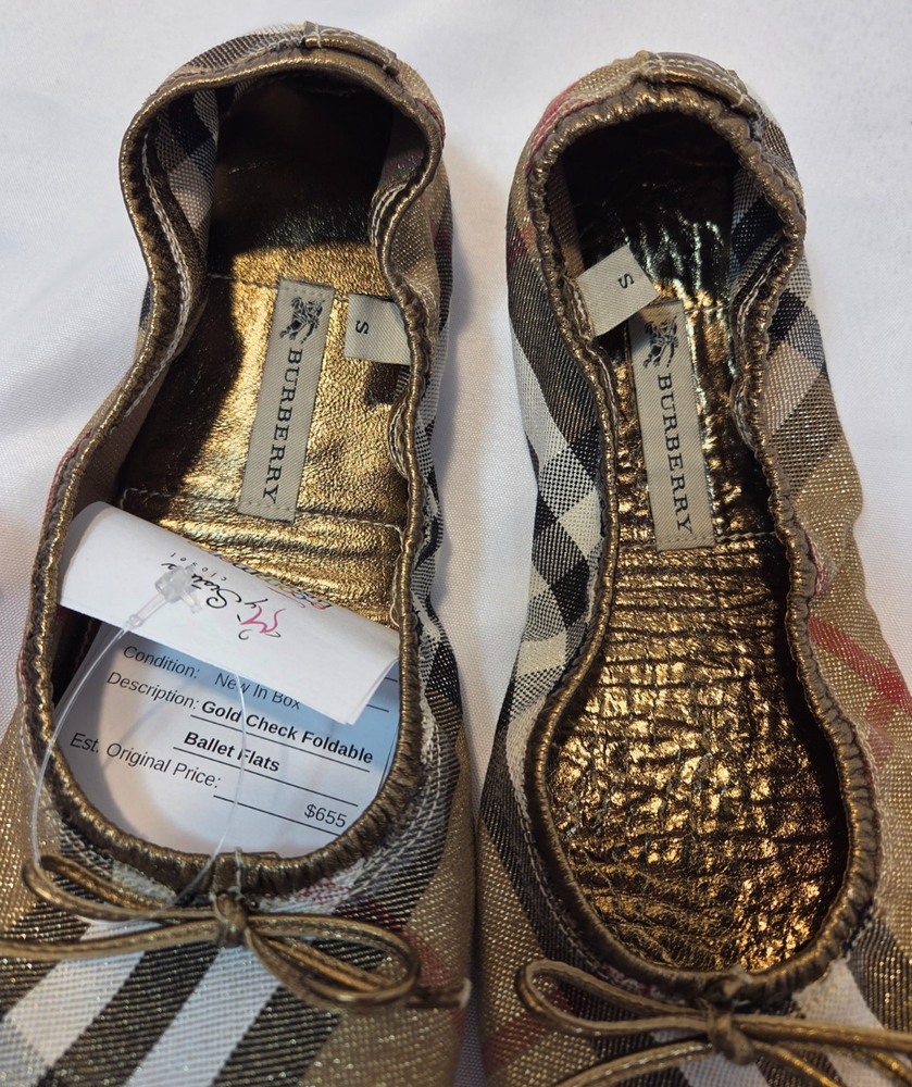 Burberry Gold Check Foldable Ballet Flats Size S Brand: Burberry Overall Condition: New in box. See pictures for details. Materials: Nylon and man made materials. Shipped with USPS Priority, Flat Rate or, when possible, First Class Mail. Description: Burberry gold check foldable ballet flats are luxurious, travel-friendly shoes often featuring the iconic Nova or House Check canvas paired with metallic gold leather trim. These slip-on, scrunched-silhouette flats typically feature a comfortable elasticated opening, a round toe, and a dainty bow detailKey details of these ballet flats include: Design & Material: A combination of durable Check canvas and metallic gold leather, designed with a flexible, foldable structure. Signature Style: Features the distinctive Burberry check pattern (Nova or Vintage), often trimmed with leather and accented with a small bow on the vamp. Comfort Features: A scrunched or elasticated topline ensures a snug, comfortable fit. Versatility: Designed as a compact, "travel" flat, suitable for easy packing. Details for Shopper Size: S Shoes Width: 3 inches wide Shoe Length: 9.5 inches Heel Height: Flat Heel Type: Flat Toe Style: Closed Round Toe Payment Policies We accept payment through PayPal, credit card, and debit card. Please note that the item may be relisted if payment is not received within the 10 day period. Shipping Policies Delivery estimates will be displayed at checkout. In-store pickup is also available if you would like to visit us in store. We ship to Continental United States only. Terms of Sale Each item we sell is unique. There are no exchanges for the same item available. All items are carefully inspected by My Sister’s Closet of Monroe County’s quality control team prior to shipping. Please carefully review item details. If you have questions, please message us regarding the item before purchasing. Note: Due to the different monitor and light effects, the actual color of the item shown might be slightly different from the color in pictures. Return Policy We strive to describe and measure our items accurately. If your order is not what you expected, we accept returns under the following conditions: The item was not as described as listed The wrong item was shipped. The item does not fit. If the wrong item was shipped, we will attempt to replace it with the item originally ordered. Please note - items not returned in the exact same condition, with tags attached, may be subject to a partial refund to account for loss of the item’s value. Please refer to eBay Return policy for more details. You are covered by the eBay Money Back Guarantee if you receive an item that is not described as listed. Return Requirements: The buyer must return the item within 30 days of receipt. Buyer is responsible for return shipping charges. The item(s) must be returned in the original condition, unworn, with tags attached. Thank you for shopping with us! A little bit more about us… My Sister’s Closet is a nonprofit serving women in poverty since 1998. Our mission is to help women move closer to economic self-sufficiency by providing essential career development tools. This includes job training, mentoring, advocacy services, and professional attire for job interviews to help them find employment. We have helped over 2500 women thus far. Most clients we serve have been dealing with homelessness, domestic violence, illness, divorce, job loss, economic recovery and/or lack basic education. Visit Our eBay Store