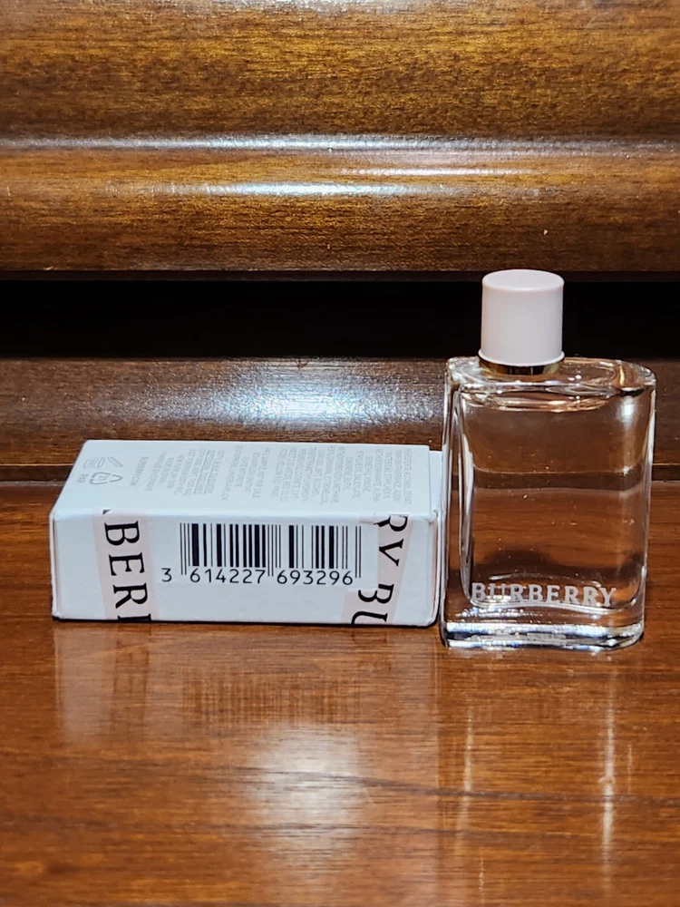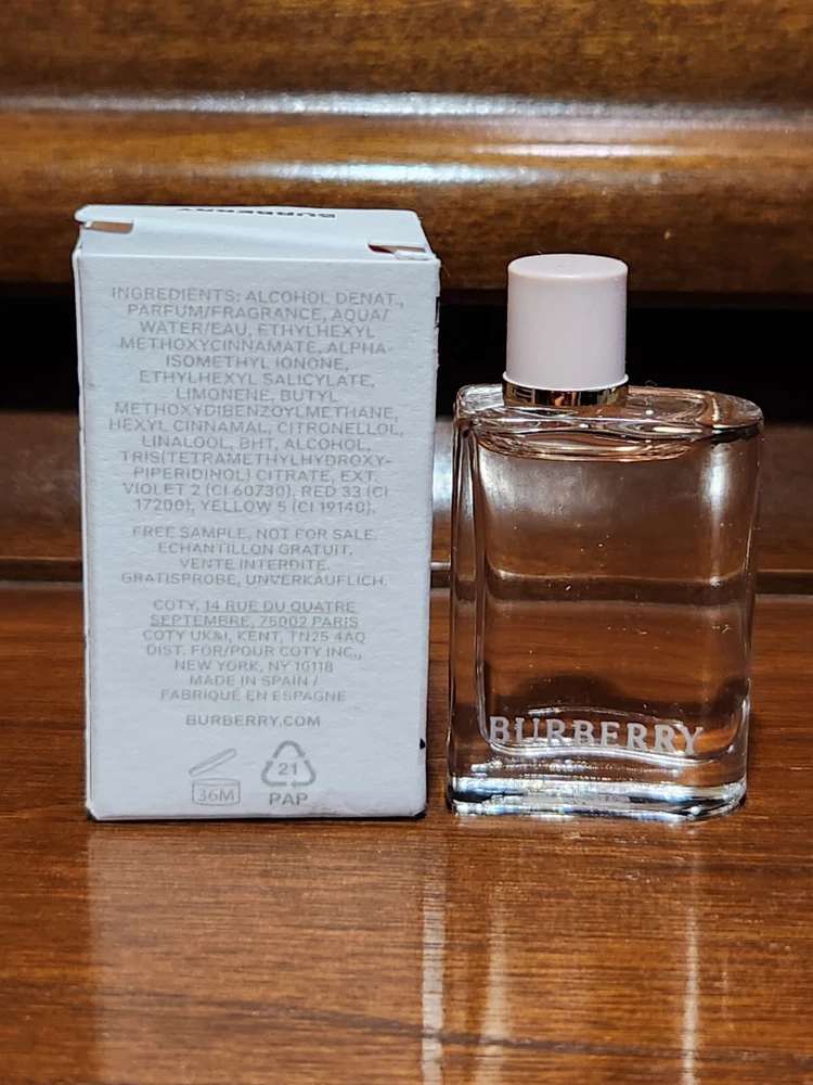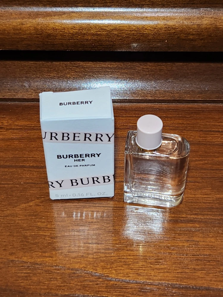 Type: Eau de Parfum Brand: Burberry Country/Region of Manufacture: Spain Fragrance Name: Her UPC: 3616304061967 gtin13: 3616304061967 Size Type: Travel Size Volume: 0.16 fl oz Features: All Natural Ingredients, Miniature Splash Personalize: No Formulation: Fluid