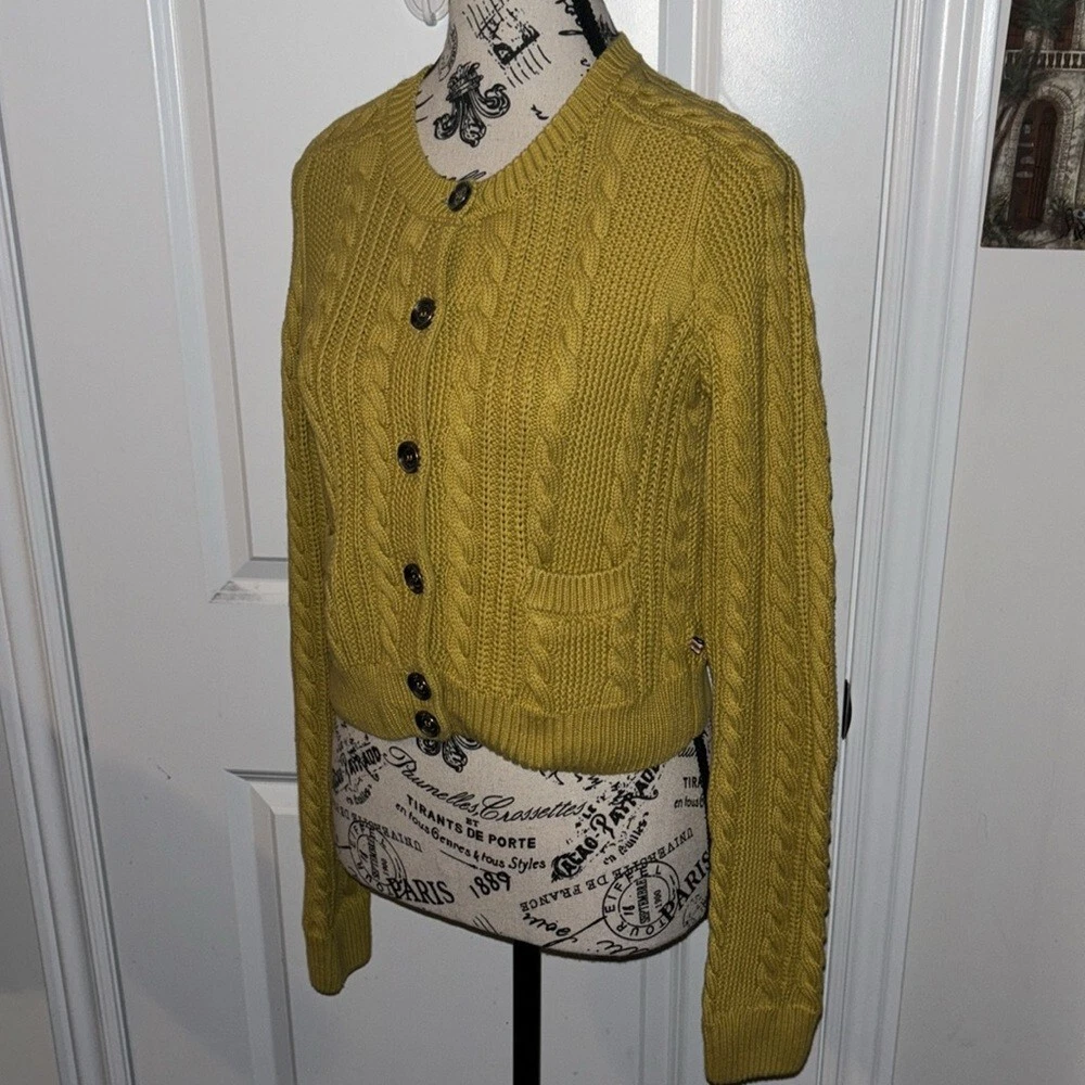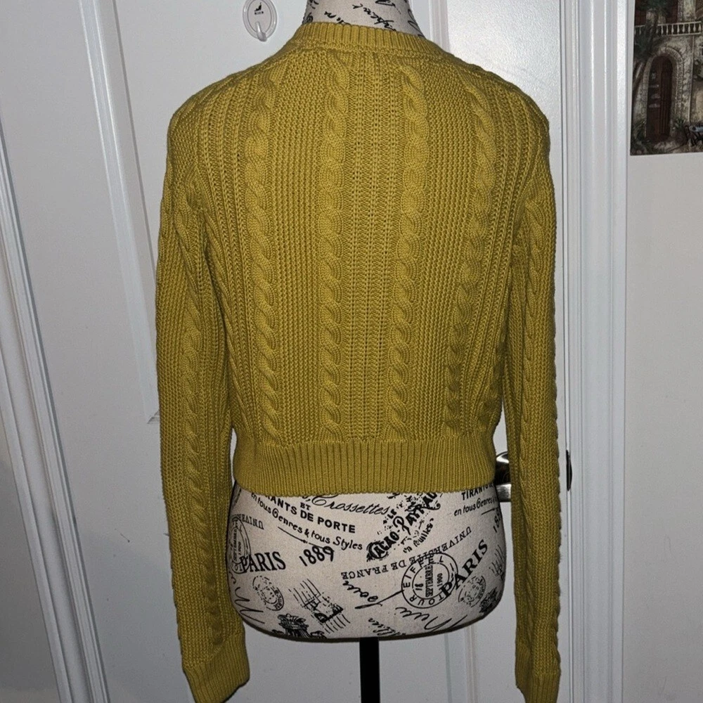 This vintage cardigan from Burberry London is an authentic piece that will add a touch of elegance to any outfit. The cable-knit design is beautifully crafted and the yellow color is vibrant enough to catch anyone's eye. The cardigan is of size M and is perfect for regular size types. It is made of high-quality material and is perfect for women who want to add a stylish touch to their wardrobe. The cardigan is versatile enough to be worn for any occasion and is a must-have for any fashion-conscious woman. Very good preowned condition. Runs small, I would say this is more of a size small than medium. 100% cotton.