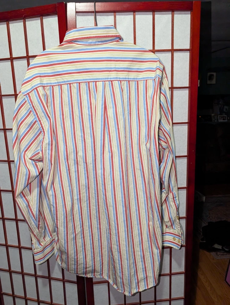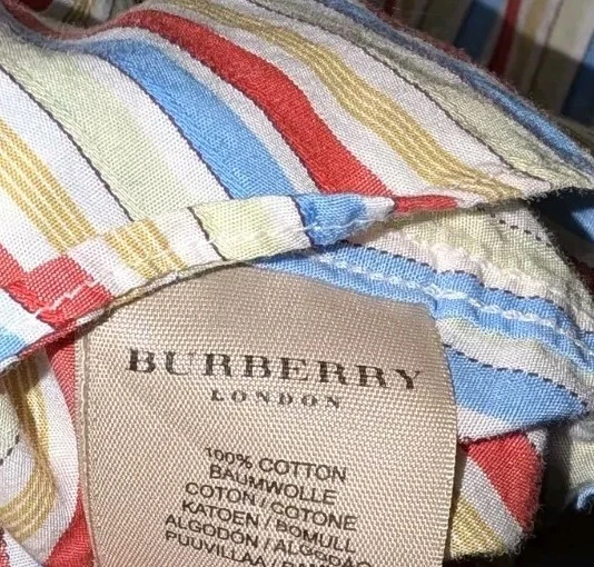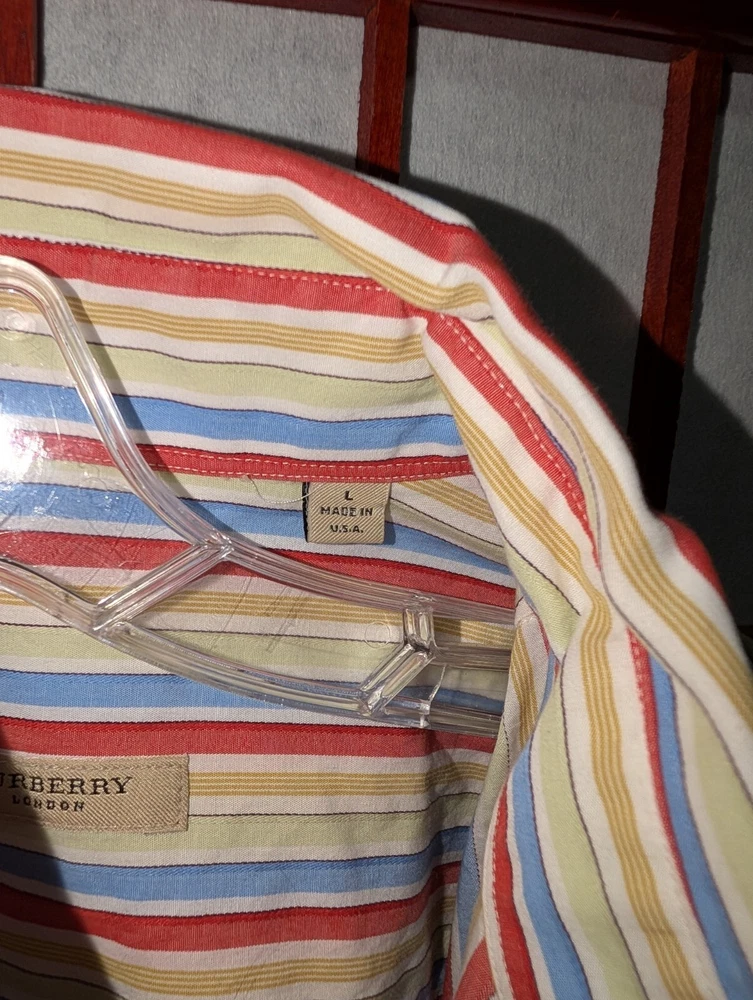Length 32.5" Chest 48" Crafted by Burberry London, this Large button-down shirt is a versatile addition to any wardrobe. Featuring a classic fit with long sleeves, it boasts a timeless striped pattern in a multicolor palette, suitable for a range of occasions from casual outings to business settings. The shirt is designed with a comfortable button-down collar and a neat button closure, ensuring a polished look. The shirt is made from high-quality woven cotton, allowing for breathability and ease of care—machine washable for convenience. With a chest size of 48 inches, it caters to a regular size L, fitting seamlessly into the everyday style of the modern man. Made in the United States, this piece maintains a sense of USA-themed sophistication without compromising on comfort.