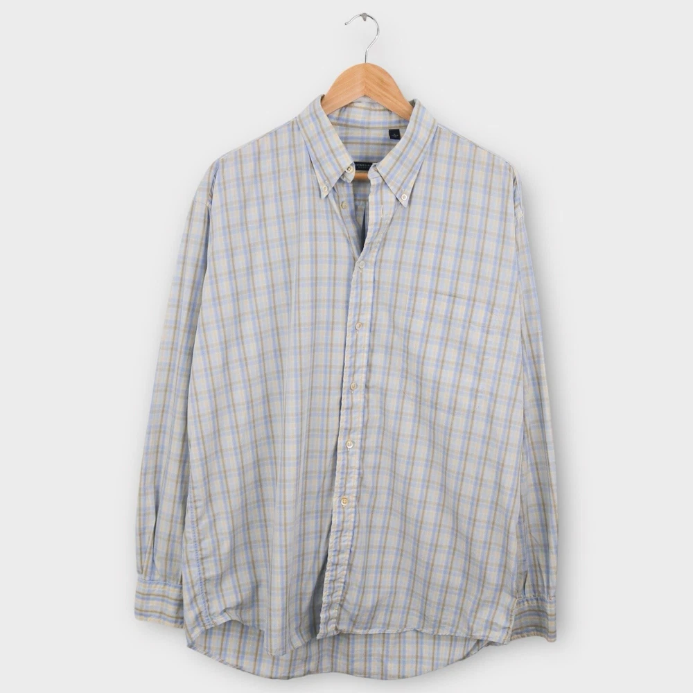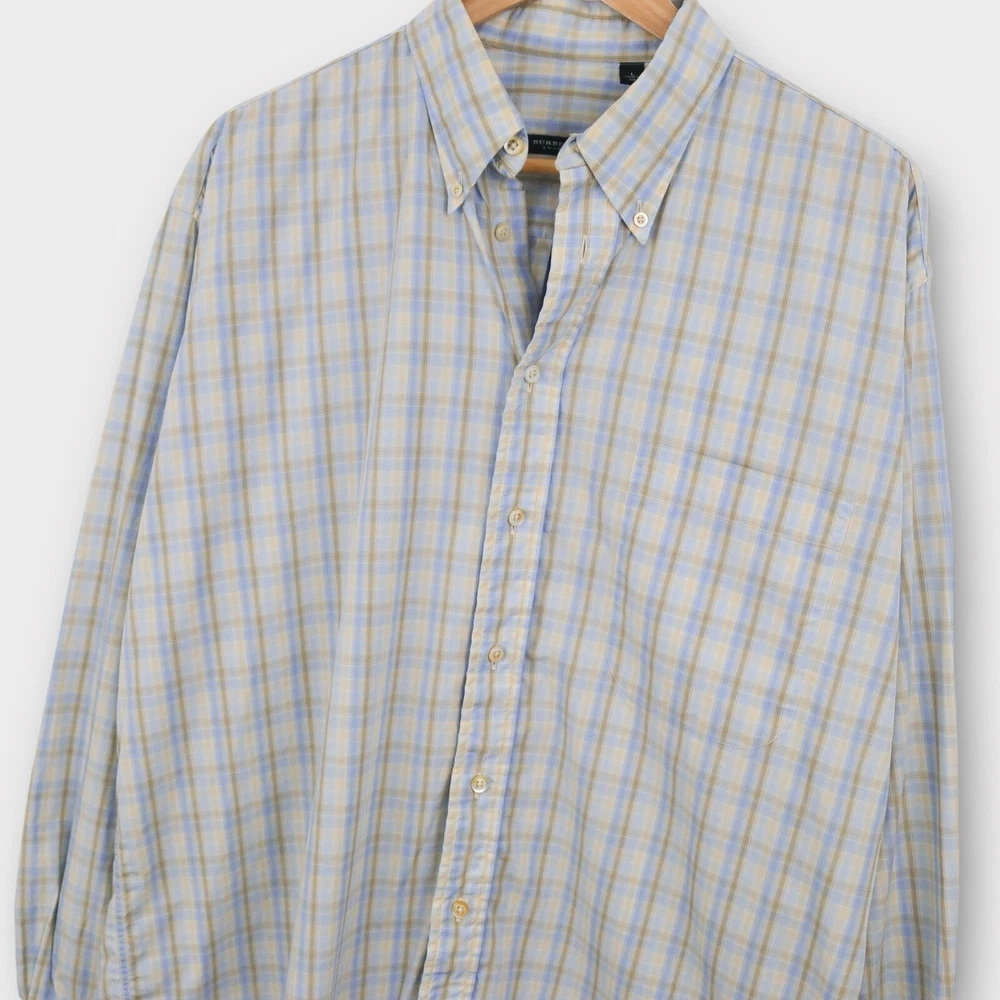 Elevate your style with this Burberry London Nova Check Plaid Button Shirt. The shirt features a collared neckline, button closure, and long sleeves. The plaid pattern in blue and beige adds a classic touch to the shirt, making it perfect for any occasion, whether it be a party, cocktail, business meeting, or casual outing. Made from 100% cotton, this shirt is easy to care for, packable, and suitable for all seasons. It also comes with pockets and is double-sided, making it a practical and stylish addition to your wardrobe. The shirt is a size large, with a chest size of 52 inches, and is a regular fit. Buy this designer shirt from Burberry London today and add a touch of London classic to your wardrobe. Tag Size: Large Best Fit: * Men: L Approximate Flat Measurements: * Chest: 26” * Length: 31” * Material: Cotton Condition: No Noticeable Flaws All items are second hand, many being vintage and may have small imperfections. Anything major is noted.