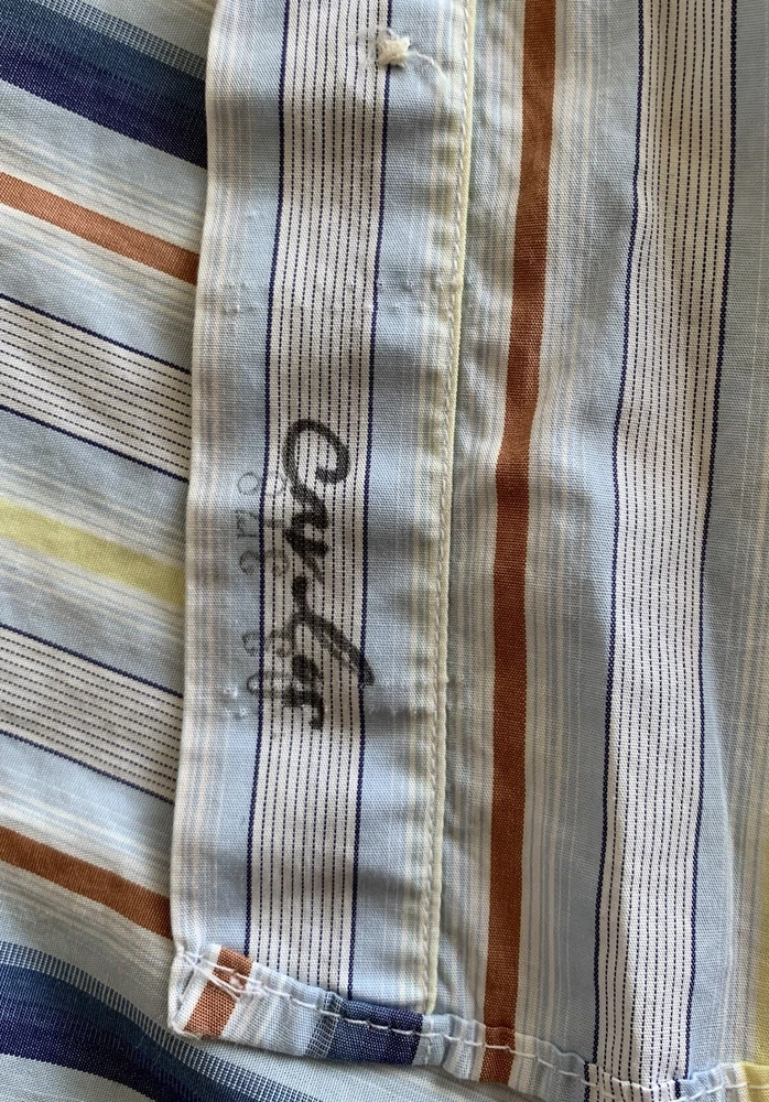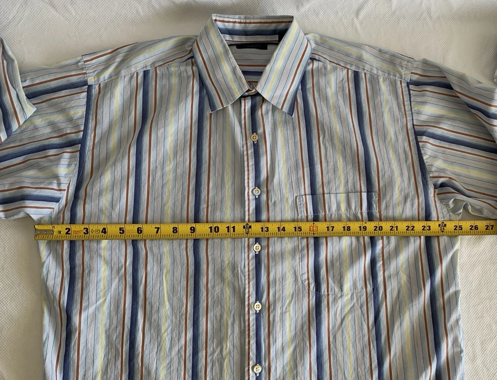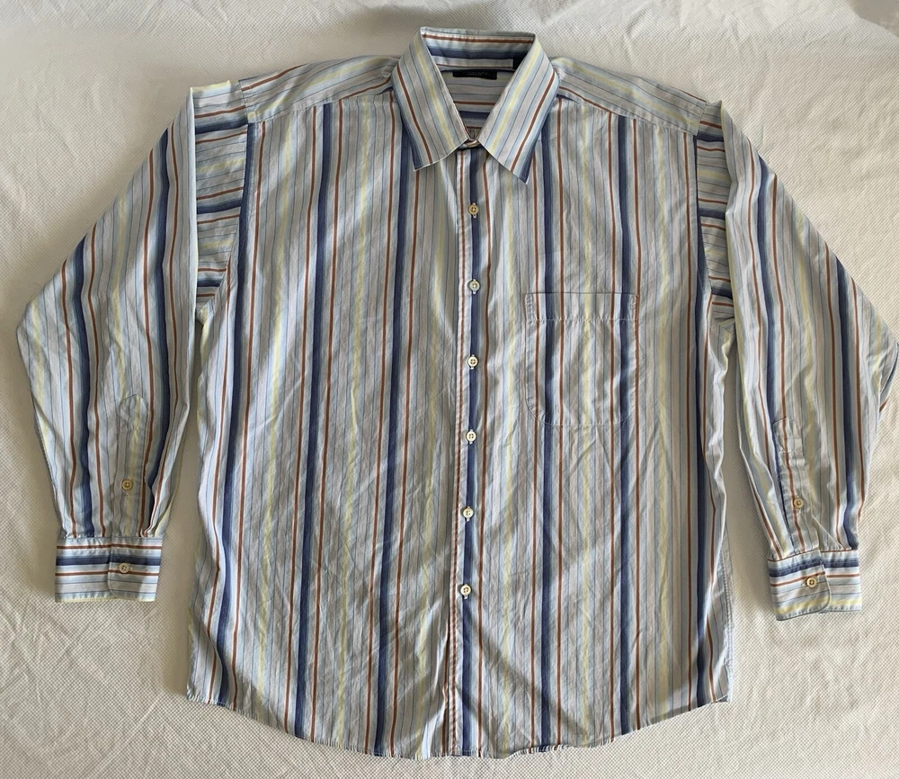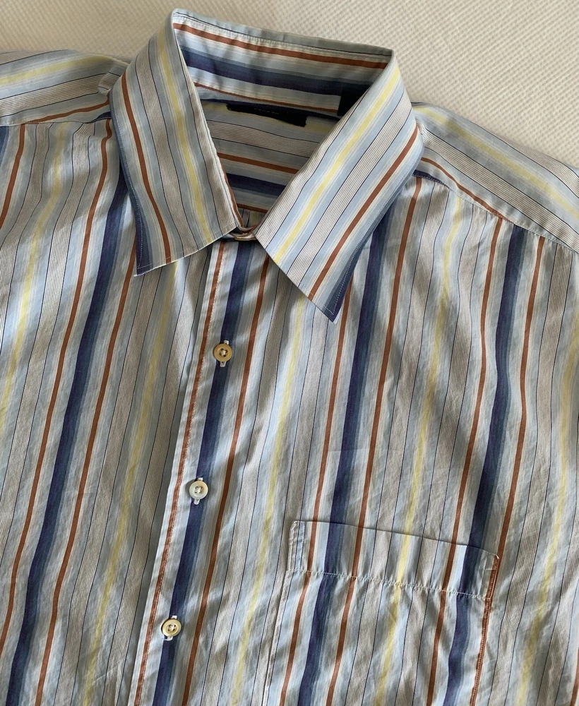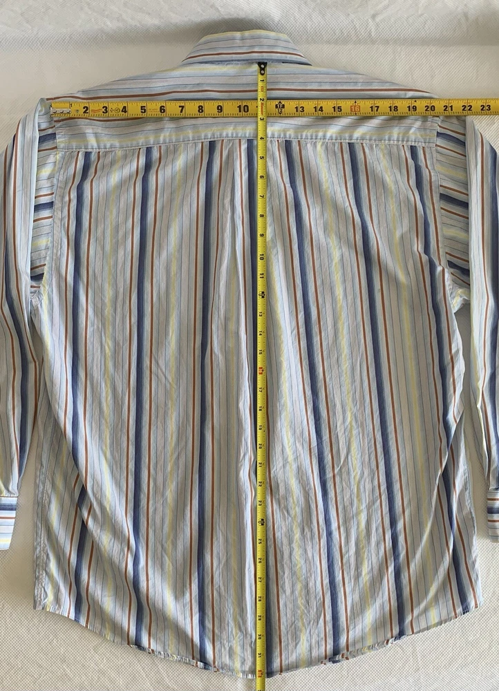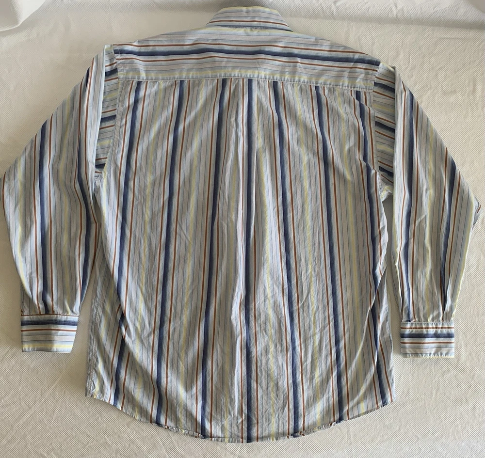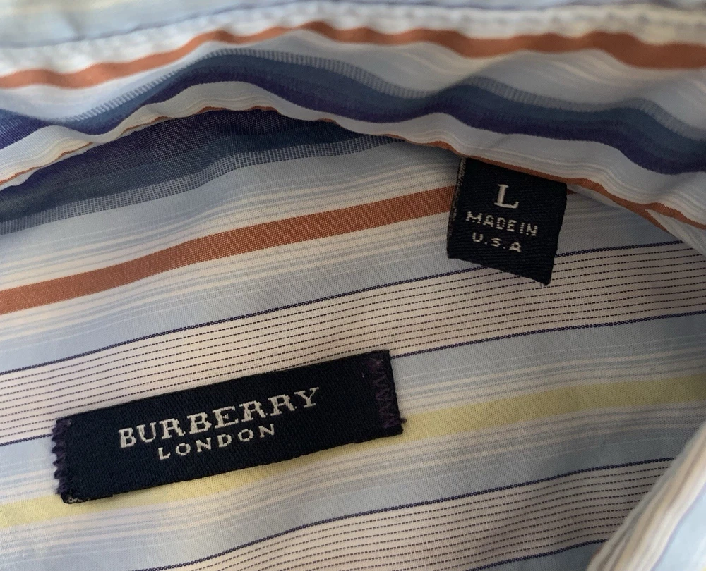 Burberry London Shirt Men's Size L Blue Multicolor Strip Button Up Long Sleeve Made in USA. Does not have a material or care tag see pictures. See pictures for measurements. Please use these measurements on something you own to compare before purchasing. The Item in the photo is the item that will be received. Please see the pictures for the condition of the item. Reasonable offers are welcomed. In hand and ready to ship. Thank you for showing interest in this item.