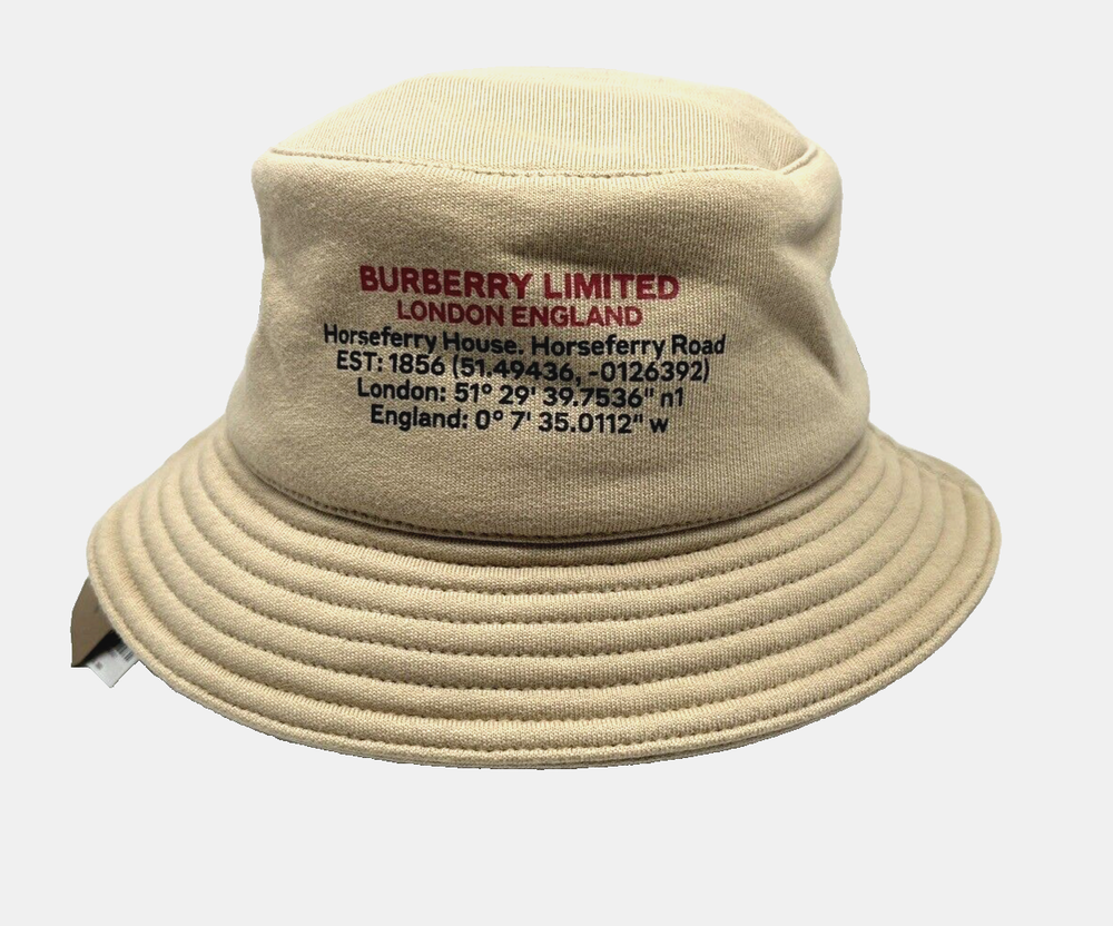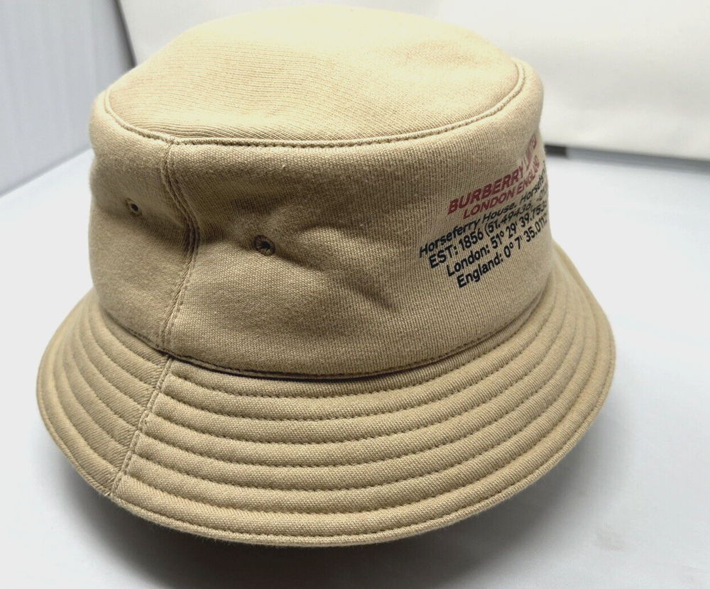 Burberry men's Logo Soft Cotton Bucket Hat size: Small color: Soft Fawn This jersey bucket hat features the Burberry logo on the front Cotton Lined retail $530