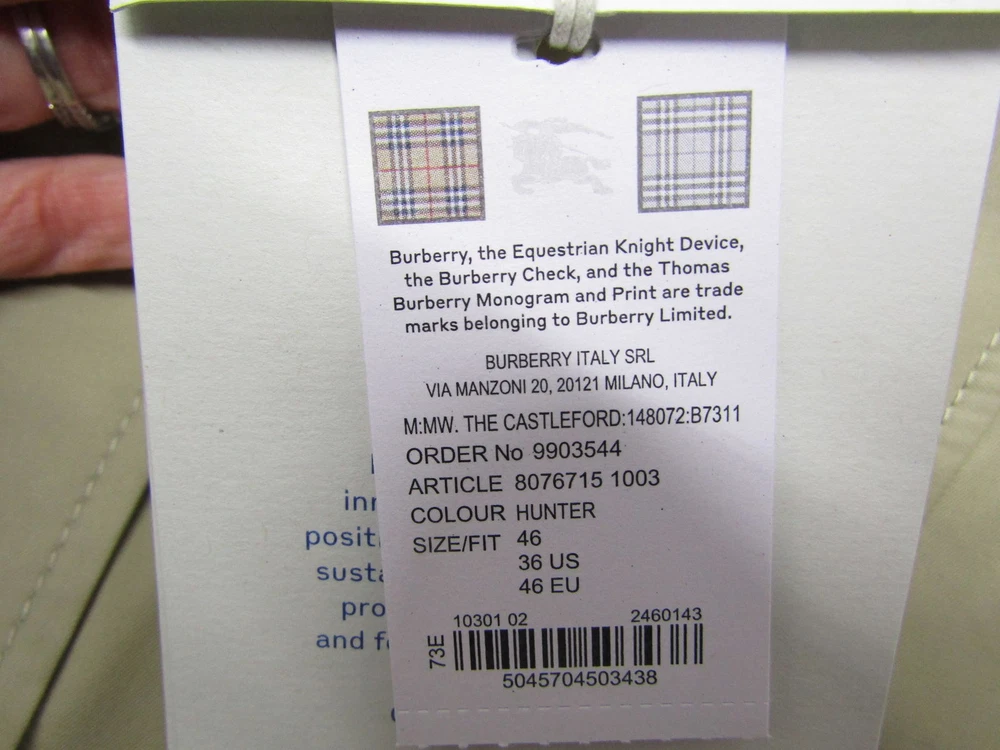 ebay template Burberry Mens Long Castleford Trench Coat Jacket Size 46 Hunter Brown Model: 9903544 Size: Men's US 46 Color: Hunter Brown UPC: 5045704503438 Retail Price: $ 3150 Condition: New with tags Cargo Largo is not sponsored by or affiliated with the brands associated with the products being sold. Packaging Condition: Original distressed packaging when applicable All dimensions are approximate This item cannot be shipped out of the United States! Cargo Largo is not sponsored by or affiliated with the brand associated with the product being sold. Contact Seller If you have any questions, please use the “Contact Seller” link in the upper right section of the listing. Our business hours are 8:00 AM - 3:30 PM Monday-Friday (Central Time). Sales completed and emails received after normal business hours may be handled the next business day. Shipping Policy We ONLY ship within the lower 48 United States. We ONLY ship to the address selected by the customer at checkout. Buyers MAY NOT arrange their own shipping. ALL orders with total value of $250 or more WILL require a delivery signature. For this item, we DO NOT offer combined shipping with other listings. Location We offer local pickup for all our eBay auction items. To request local pickup for items you have won, please send us a message asking for “pick up” and we will send you an eBay invoice with your total. All local pickup orders MUST be paid within 8 DAYS after the listing ended per eBay policy. The payment total will include Missouri sales tax AND a $4 handling fee per item. Non-Missouri residents will need to pay IN PERSON (credit/debit cards only) within 4 days after the listing ended. Buy It Now items are NOT eligible for local pickup. Paid items must be picked up within 10 DAYS after the end of the listing. If not, your order will be cancelled and refunded. Social distancing policies WILL be enforced during pickups. Local Pickup Location 7460 Stadium Drive Kansas City, MO 64129 Pickup Hours SUNDAY MONDAY TUESDAY WEDNESDAY THURSDAY FRIDAY SATURDAY CLOSED 11am-6pm 7:30am-4pm CLOSED 7:30am-4pm 7:30am-6pm CLOSED Return Policy We are not an authorized dealer of this product and any warranty included with the product may not be honored by the manufacturer. If you believe that the item purchased from us does not match the item description, or if your item was damaged during transit, please contact us to discuss return and refund options. In order to initiate the refund process, buyer must contact us within 30 Days of receipt of item. All returns will require a return authorization. Please note that we will only pay return shipping if our listing does not accurately reflect the specifications or condition of the item received. If you wish to return an item for any other reason, we will accept a return on MOST items, provided that the item is returned to us in the same condition and within 30 Days. This applies to both the item and retail packaging. Buyer will be responsible for both original and return shipping charges Seller will initiate this transaction and refund the buyer once the item has been received AND agreed to the mutual cancellation. We DO NOT accept any returns on swimsuits, undergarments, stockings, lingerie, or any item marked AS IS for any reason other than a grievous error in the listing. Please bid accordingly on all items listed AS IS. Payments Cargo Largo requires payment within four (4) days. (Please note that this is real-time, beginning when the auction ends.) If payment has still not been received by the fourth (4th) day after the end of the auction, Cargo Largo will relist the item. Most states require the collection of SALES TAX on online sales by remote sellers. We will abide by all local, state and federal tax codes and buyer should check their state and locality for tax liability. Residents of Missouri and all buyers who pick their item(s) up locally are required to pay Missouri sales tax on all items. Sell Smarter with Kyozou. Inventory and Ecommerce Management
