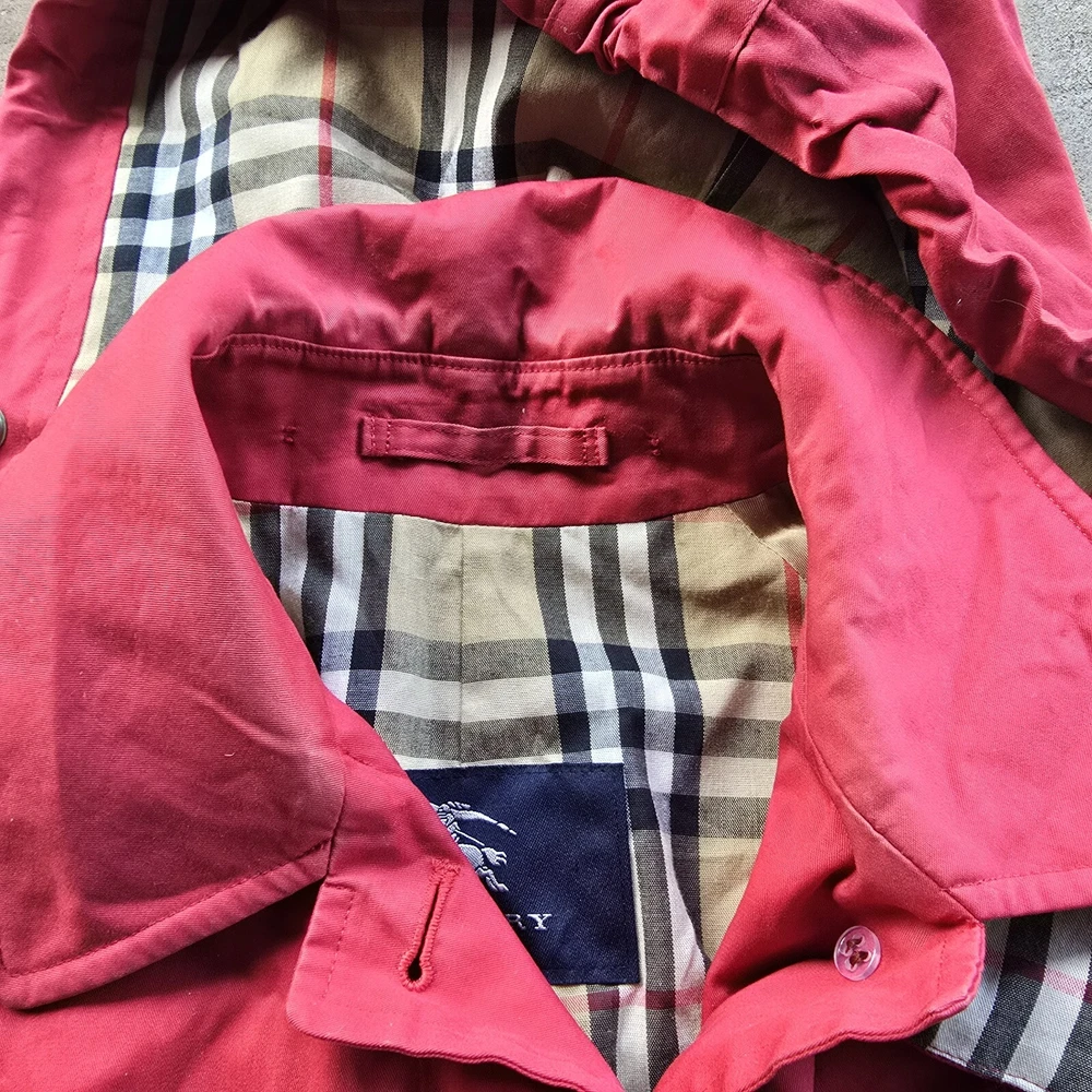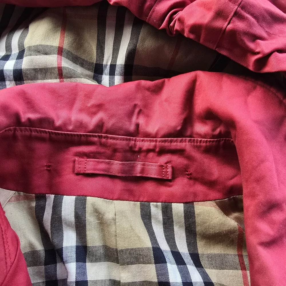 Burberry Nova Check Red Trench Coat Jacket Womens 12 In preloved condition This little cutie has cosmetic spots on inner button bed, wrist, hood and fading along opening Please check out photos for details/ flaws Chest: 22 Length: 37