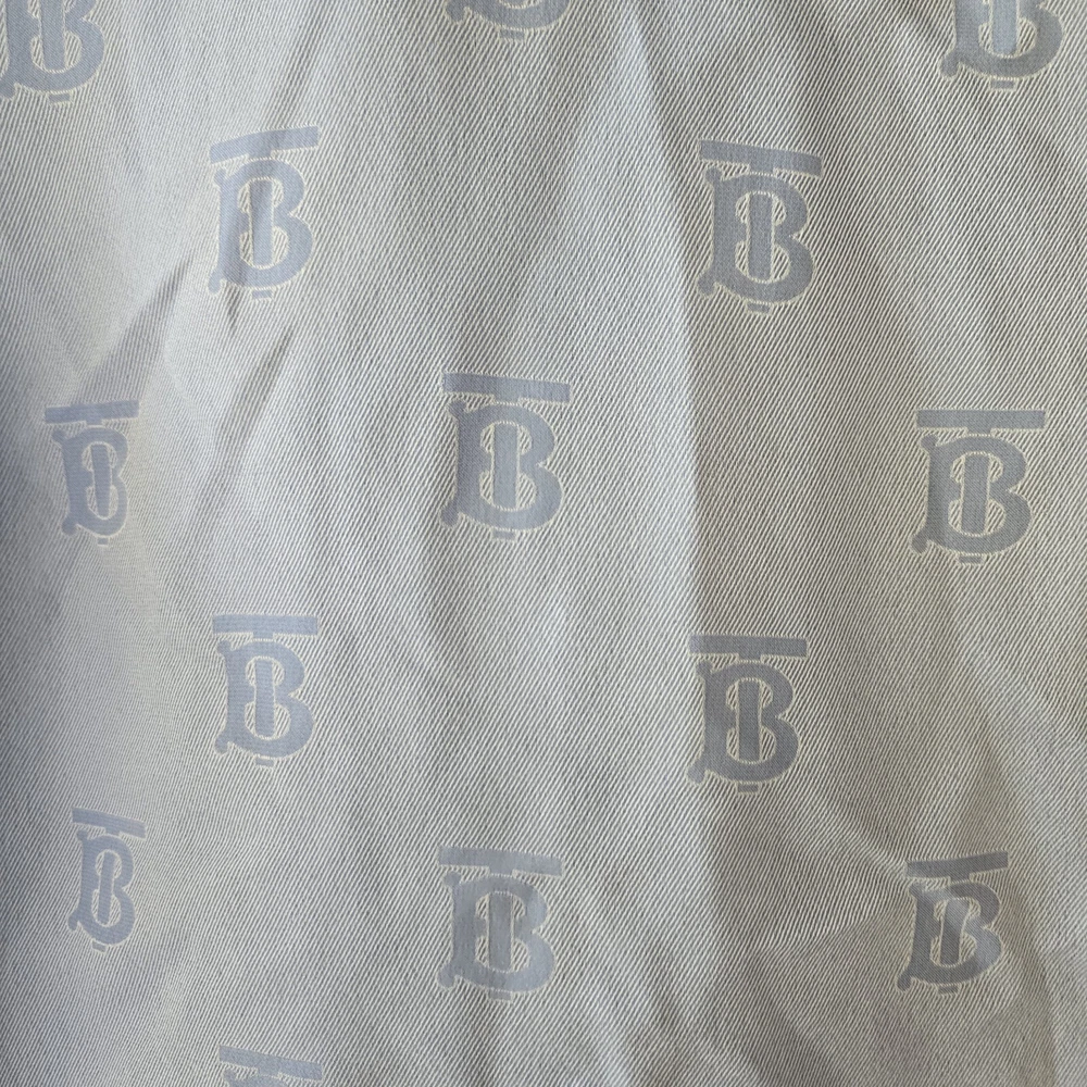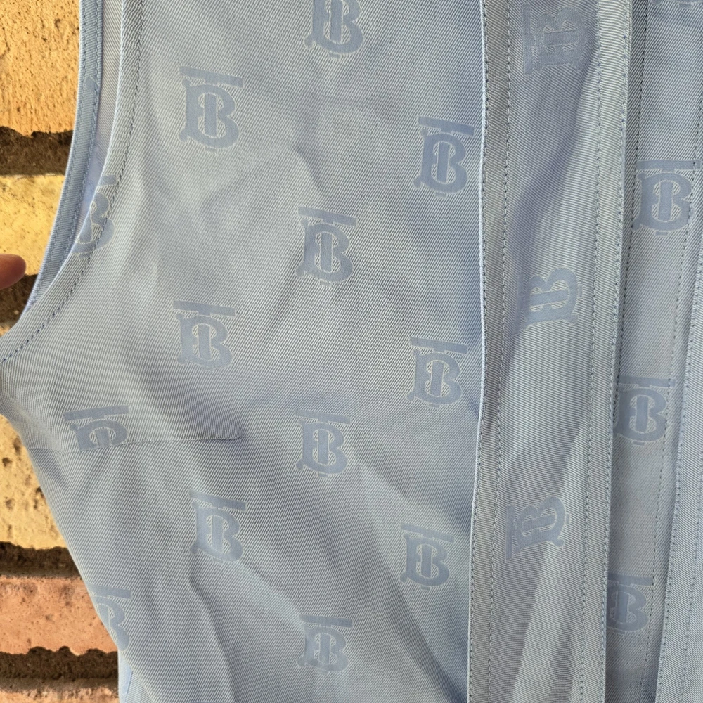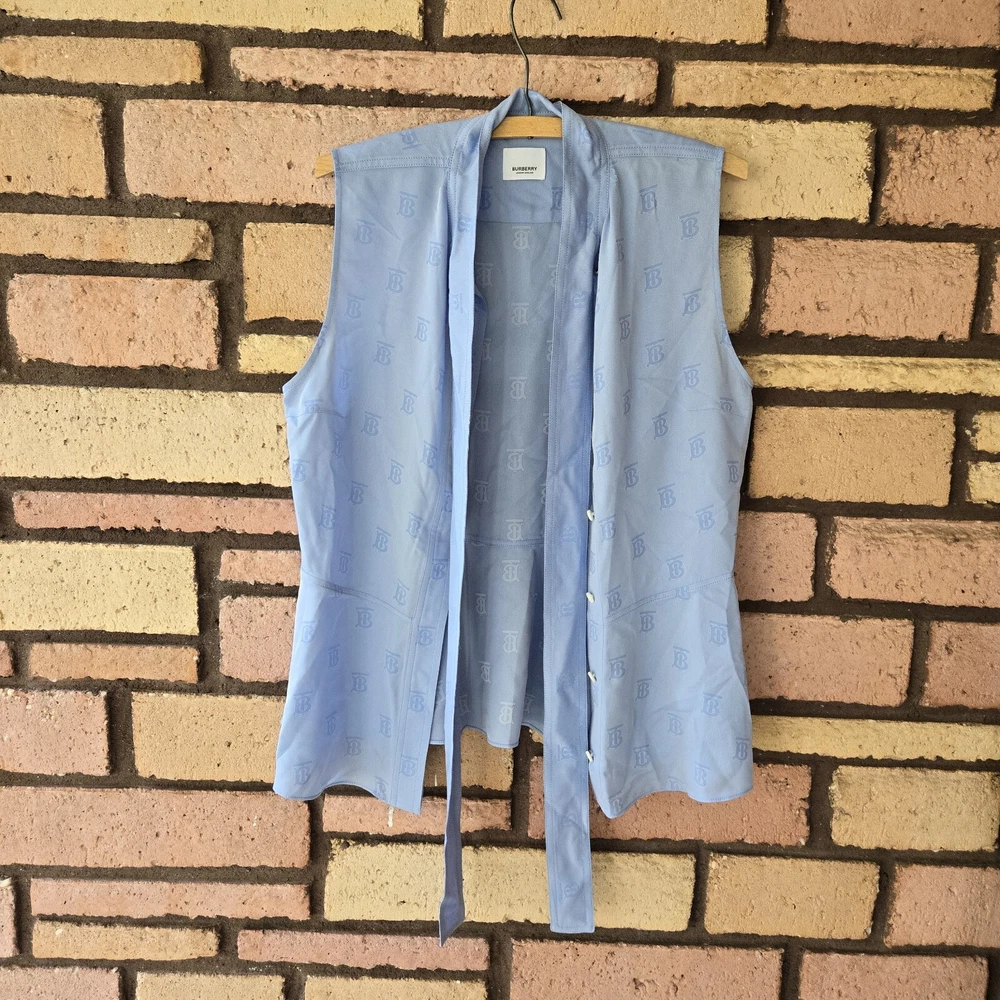 Burberry monogram jacquard sleeveless blue blouse US 6 Preowned excellent condition Burberry monogram jacquard sleeveless Blouse 40% silk Approx Pit to Pit 20" Length 25.5" Waist 17" . . Please note that all items come from a smoke-free pet friendly home. Items are stored away from animals.