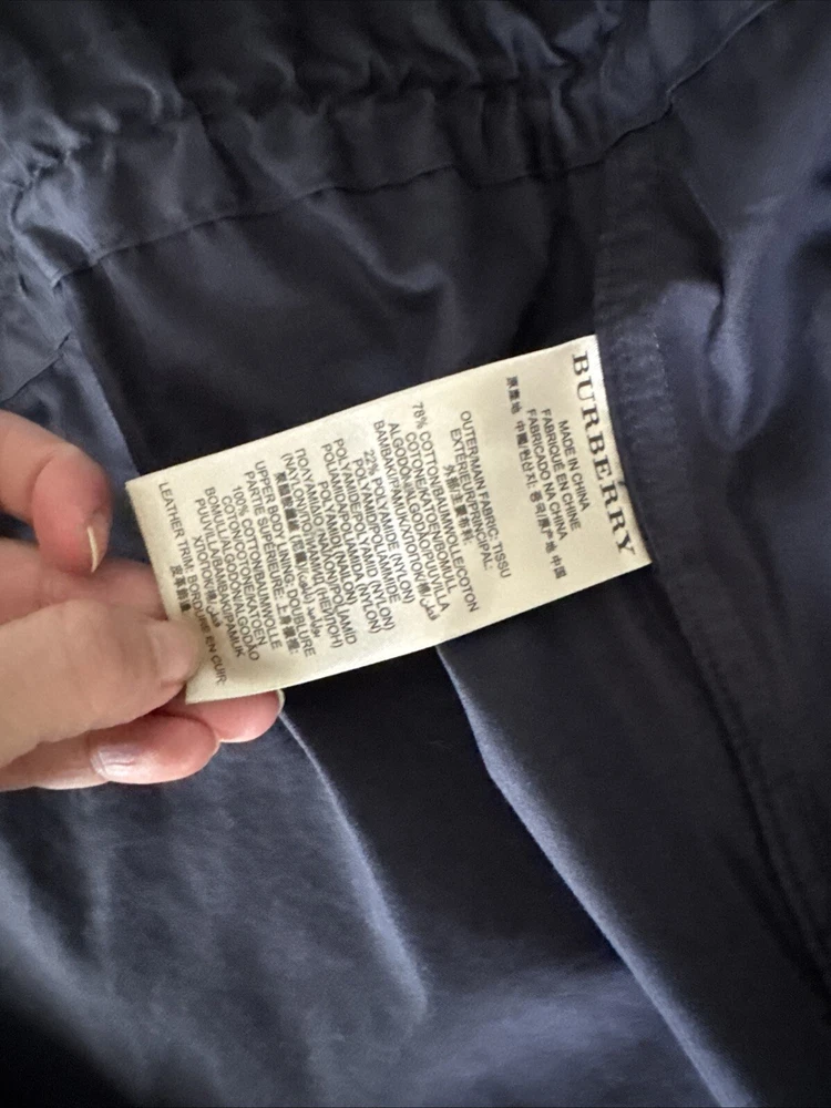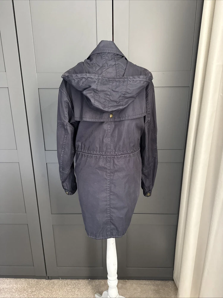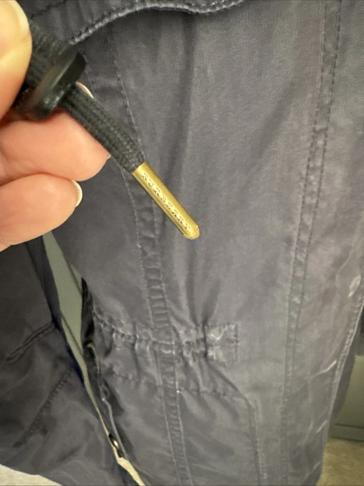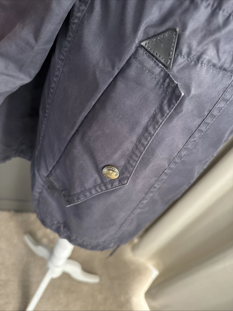 Nice lightweight cotton-blend parka, vents under arms, pockets, hood, adjustable waist and hem etc, lots of lovely details. All poppers and zips have Burberry engraved Its been worn and structurally its all good but the nature of the material means its sort of faded around things, such as where the poppers are So there are no actual faults that i can see but its just been worn and colour a bit faded Shown on a size smaller mannequin but pegged to fit