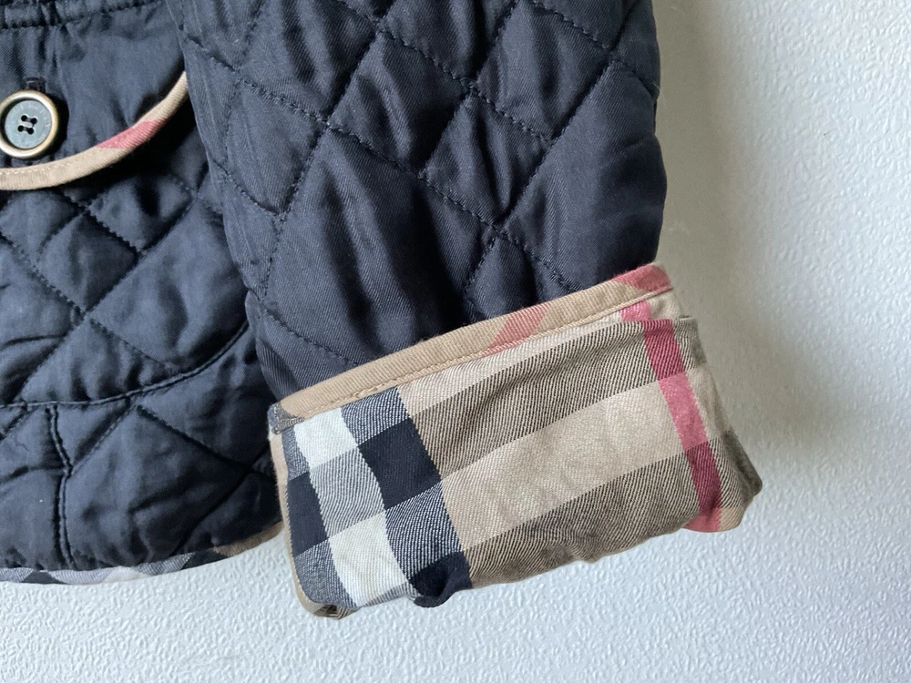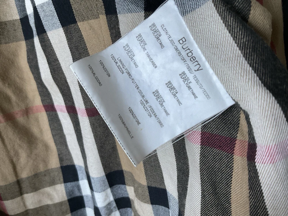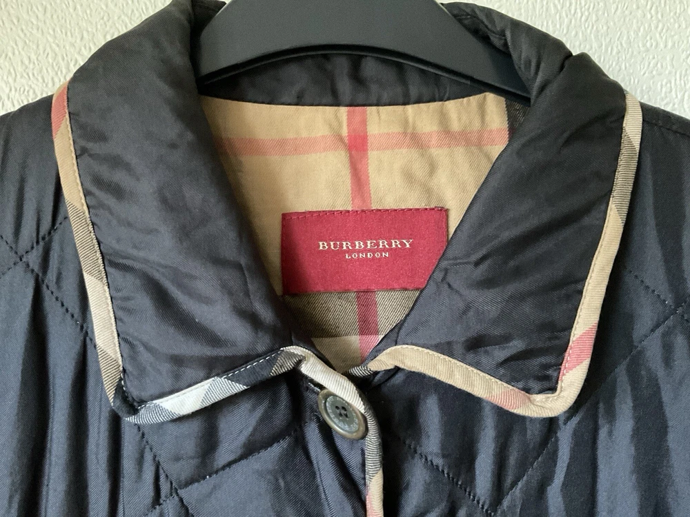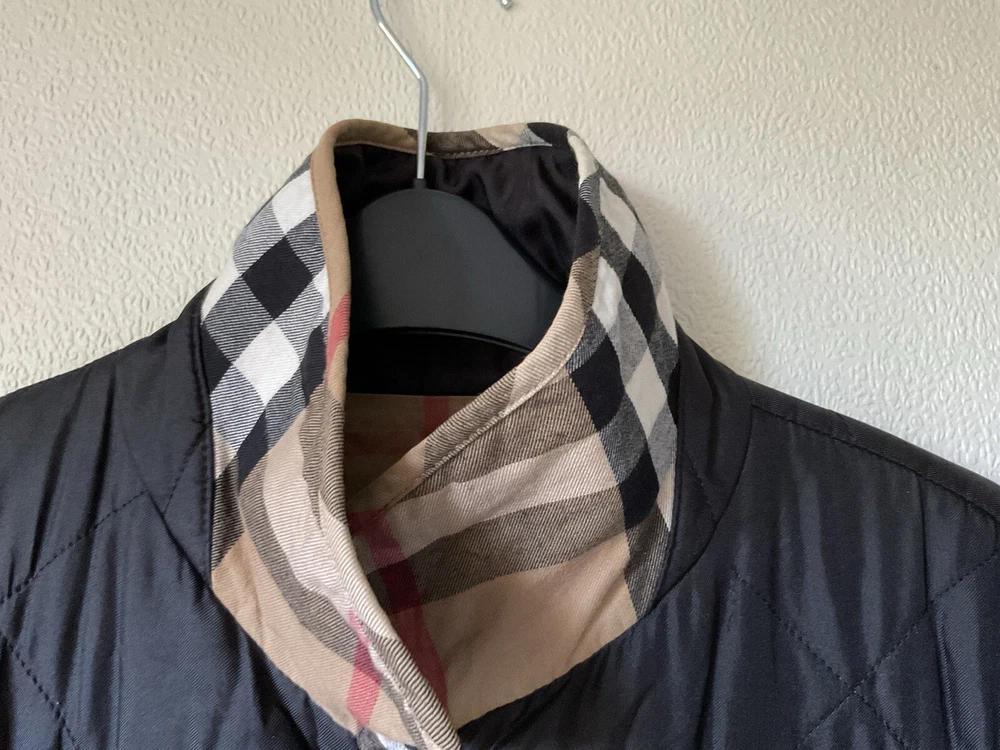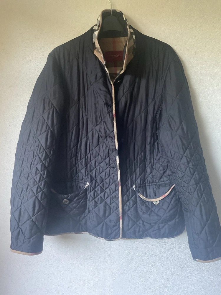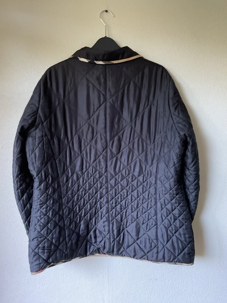 A black, with check trim Burberry ladies jacket. two front pockets and metal Burberry buttons. lining is 100% cotton check and outer material 95% silk and 5% polyurethane. size european 48. very good condition no damage. fits size 16 comfortably