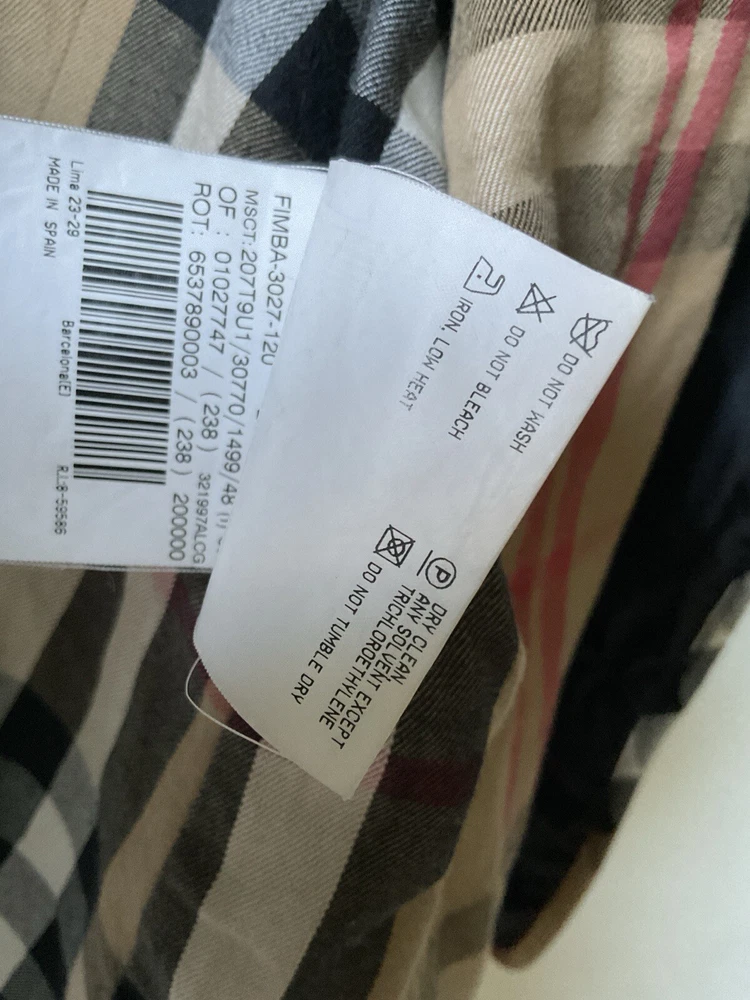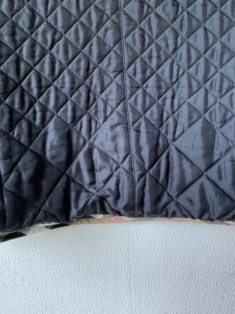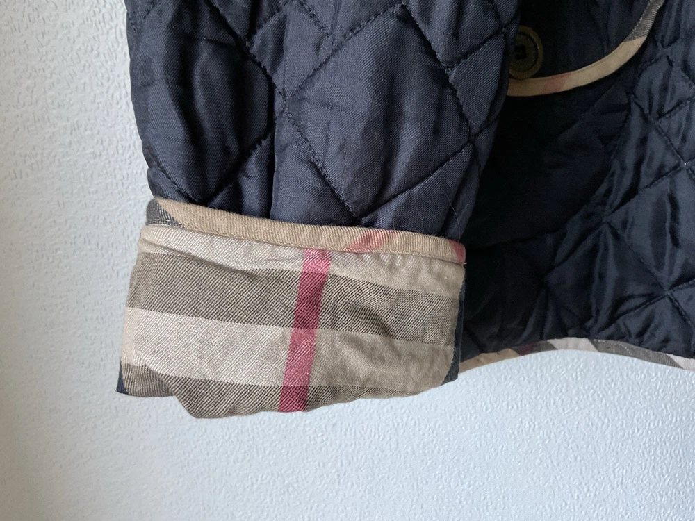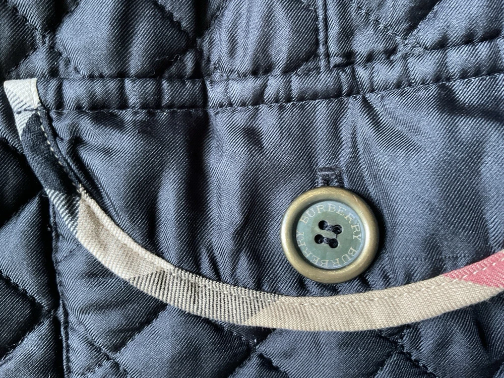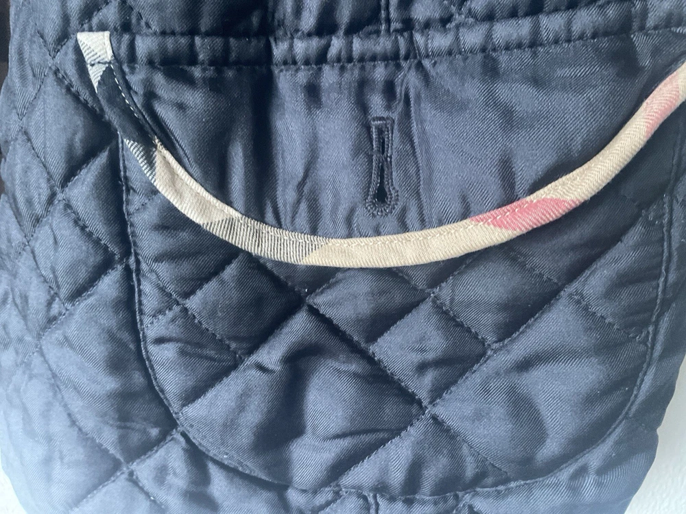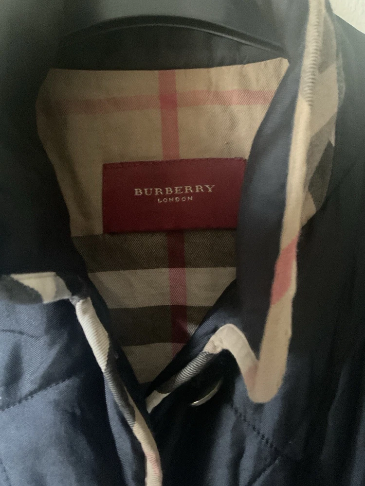 A black, with check trim Burberry ladies jacket. two front pockets and metal Burberry buttons. lining is 100% cotton check and outer material 95% silk and 5% polyurethane. size european 48. very good condition no damage. fits size 16 comfortably