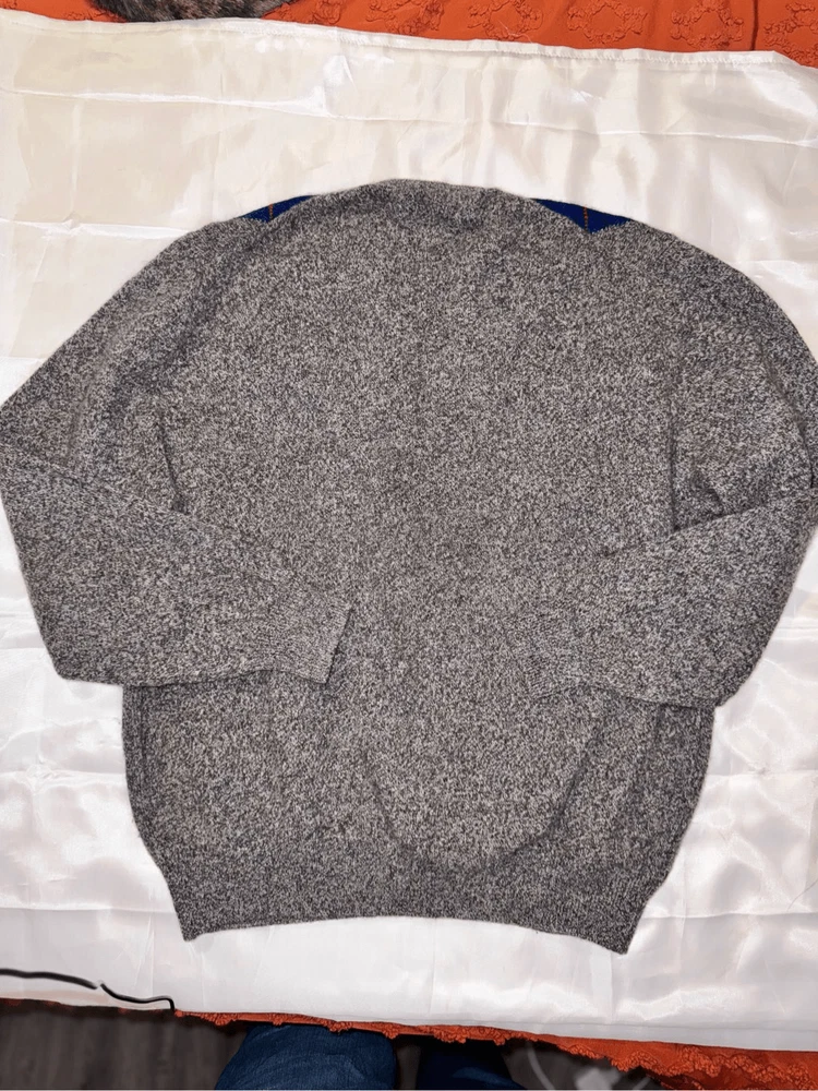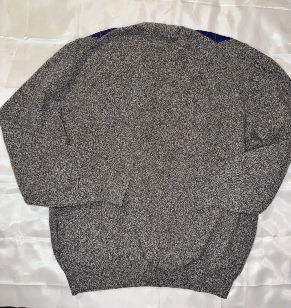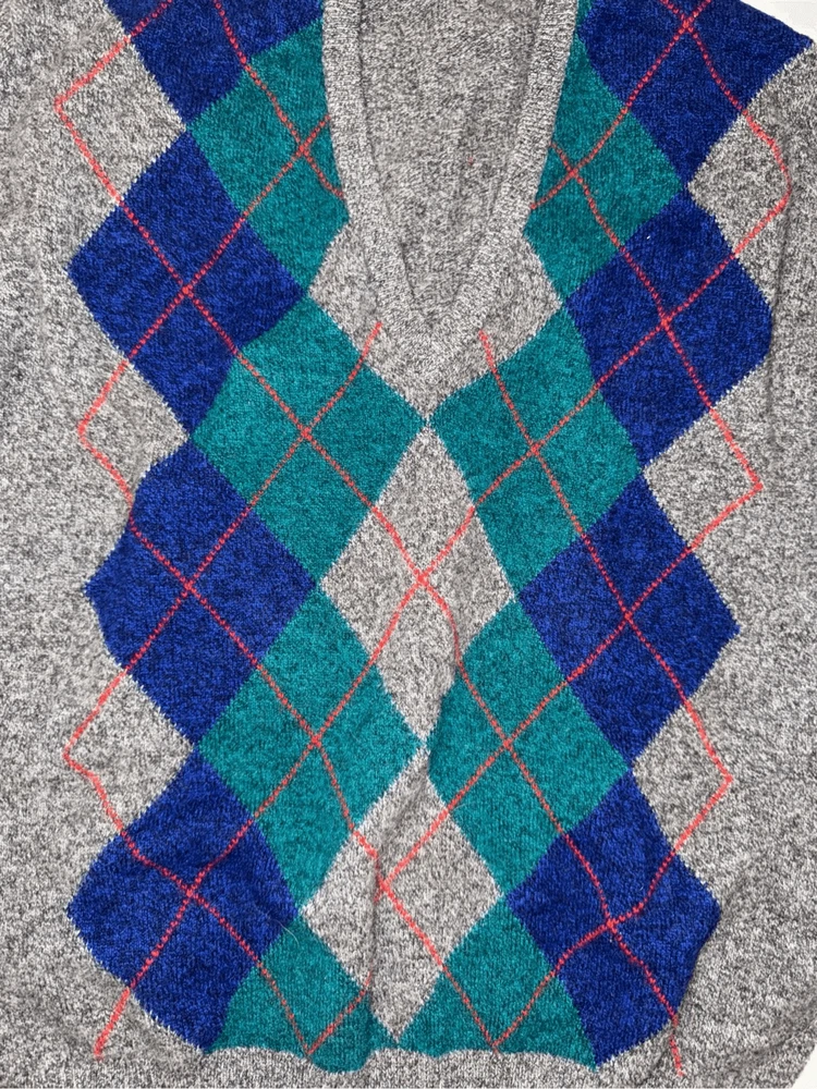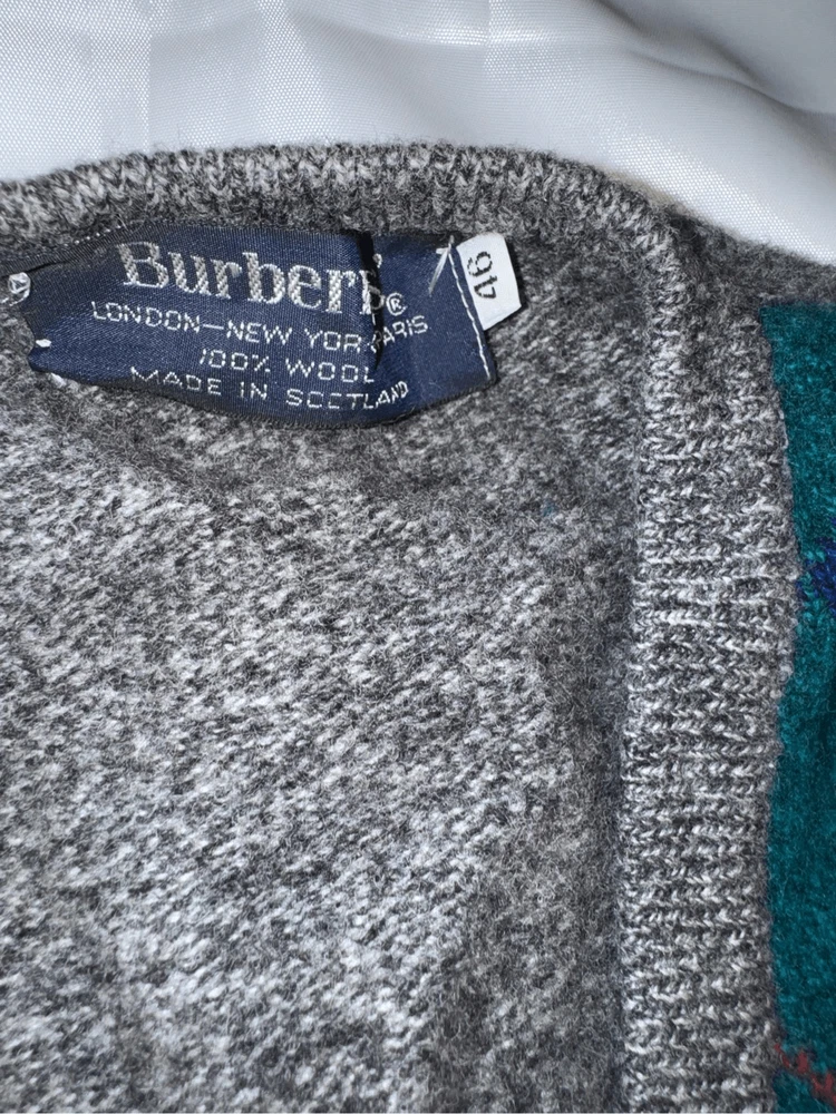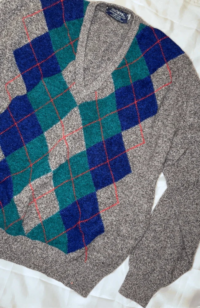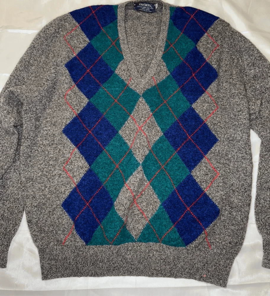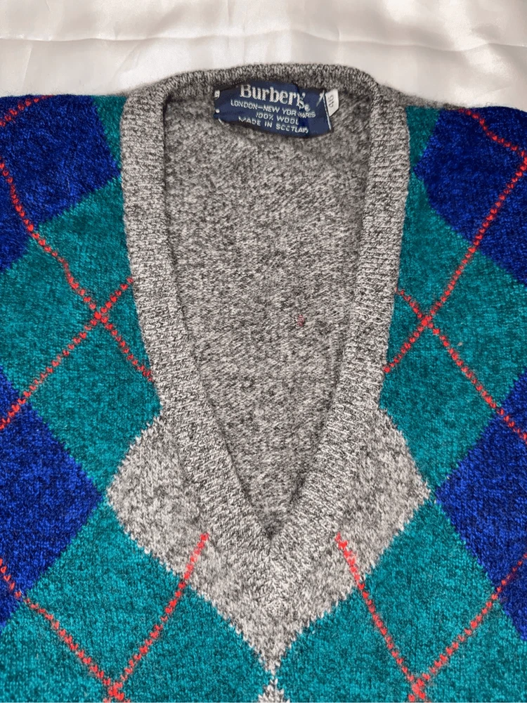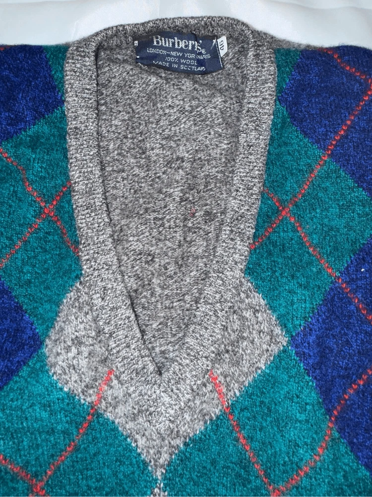 Look at this gem. The softest thing ever. Burberrys' London, New York Paris 100% wool made in Scotland. Size is 46. It is a V-neck argyle sweater long sleeves fabulous condition not a mark or snag on it. It is the softest ever. This has a liquid wool light tag. 100% lambs wool. Made in Scotland.