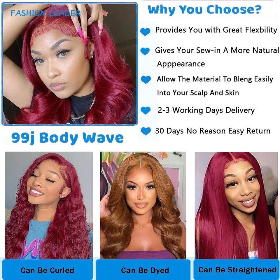 Colored Burgundy Lace Front Wig 13X4X1 Hd Lace Front Wig Human Hair 30 Inch Body Wave Lace Front Wig Curly Hair Hair Material:100% Remy Human Hair Wigs,Minimal Shedding, No Tangle, No Bad Smell Hair Color: 99j Red color Wig Density:180% Density Hair Length: 12inch - 30 inch are available Texture: Body wave Hair, Natural Hairline, Soft, Comb Easily, Can Re-style and Color well. Lace Net: 13*4*1 Lace T Part Wig, Natural Hairline