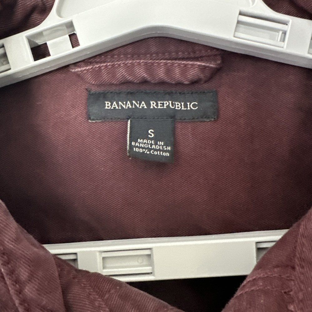 Collar Style: Point Type: Jacket Size Type: Regular Country/Region of Manufacture: Bangladesh Outer Shell Material: Cotton Closure: Button Style: Pea Coat Garment Care: Machine Washable Season: Fall, Spring, Winter Occasion: Casual, Travel Lining Material: Cotton Theme: Classic Color: Red Seller Notes: “The jacket is in good condition” Pattern: Solid Brand: Banana Republic Fabric Type: Cotton Size: S Features: Collared, Pockets Department: Men