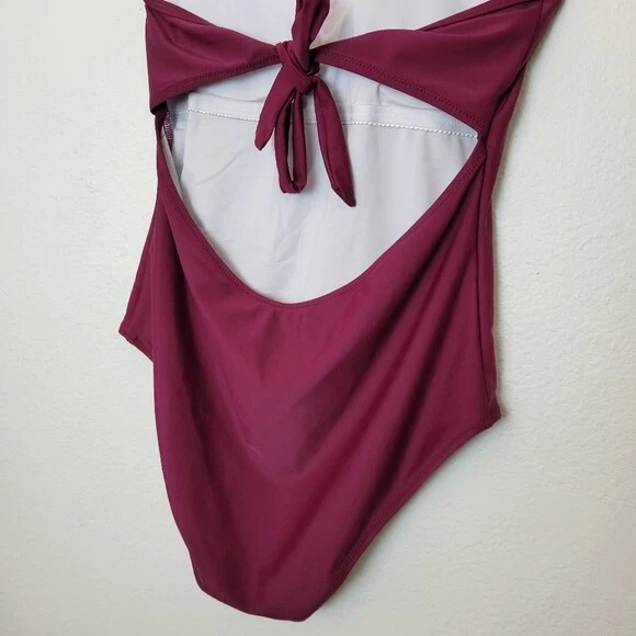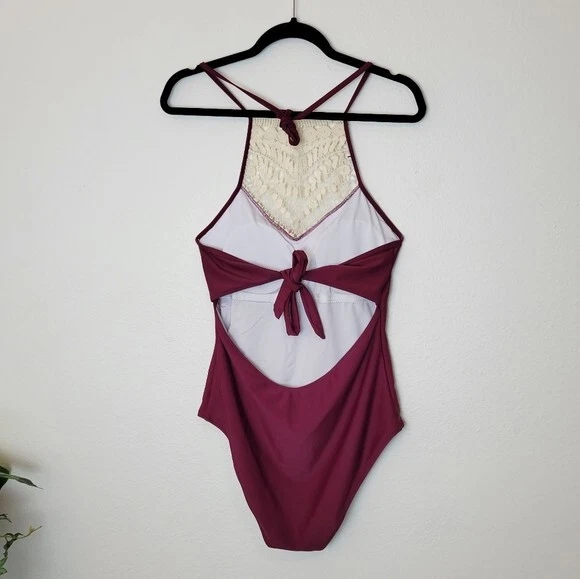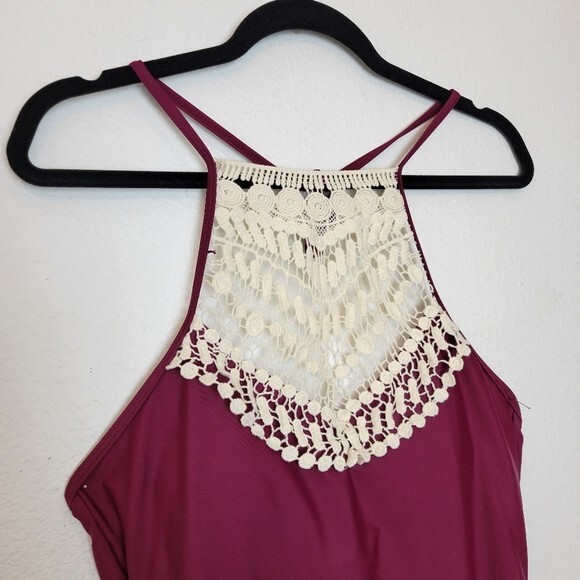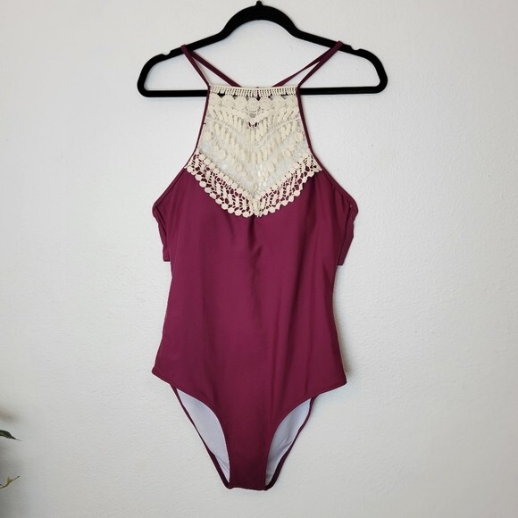 Cupshe Size Large Burgundy Crochet Accented Halter One Piece Swimsuit Boho. Ships With USPS First Class Mail -Adorable one piece swimsuit by Cupshe in a burgundy/wine colored shade with Ivory crochet detailing at the high neckline -Size Large -Halter neck -Shelf bra with padded removable cups -Lined -100% polyester -Measurements are approximately 16 in armpit to armpit 17 in across the hips 28 in from the top of the crochet to crotch -Preloved in excellent condition! ------------------------------------------------ Thanks for looking…have a GREAT DAY! @mandajane223