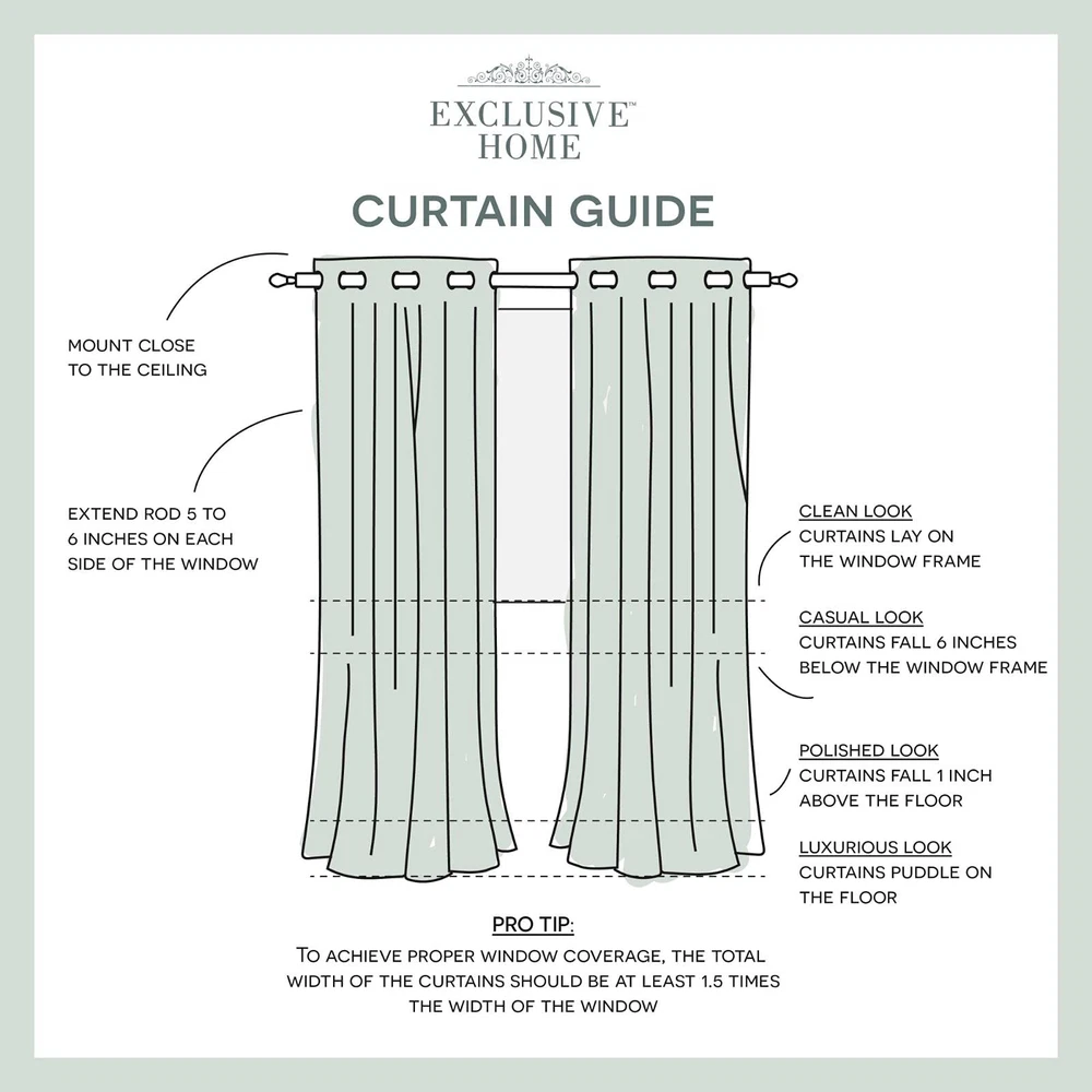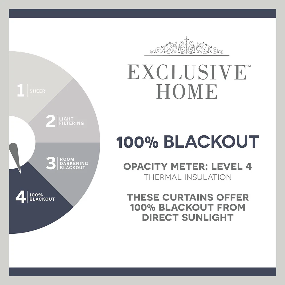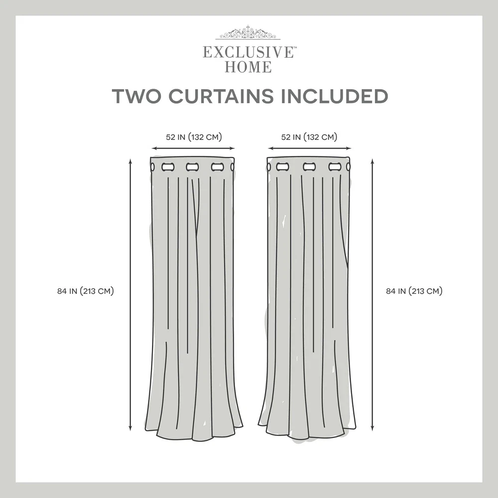 Dress up your windows with the Burke grommet top curtain panels by Exclusive Home. With a tonal slub texture fabric, these curtain panels will provide total blackout experience. Designed with Fused Thermax technology, they will block light, reduce noise, provide privacy and are energy efficient. These thermal insulated curtain panels are constructed with 8 matte silver grommets that can be hung on a curtain rod up to 1.25" diameter. INSULATED & ENERGY EFFICIENT FABRIC: The Burke curtain panels were designed with Fused Thermax technology to be 100% blackout, thermal insulated and energy efficient. 100% BLACKOUT: Created with Fused Thermax technology to eliminate exterior light, you can place your smartphone flashlight behind the fabric and no light will shine through. For a total blackout experience, the curtain panels should measure 2-3 times the width of your window/opening. GROMMET TOP FOR HANGING: These curtain panels feature eight (8) matte silver grommets per curtain panel and fits a curtain rod up to 1.25" in diameter. Each panel is sewn with a 3.5" heading, 1" side hem, and 3" bottom hem. SET OF CURTAIN PANELS: Includes (2) curtain panels, each measuring 52"W x 96"L. STYLISH, TONAL SLUB FABRIC: The tonal stub fabric has a rich, linen-look texture that provides a casual yet chic update to your bedroom, living room, den, or guest room.