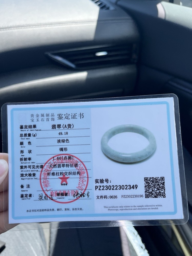 The product is a Jade Bangle Type A Burmese Jadeite bracelet made in China. It is crafted with high-quality green jade and is an antique original piece. The maker of this bangle is Guangzhou City Zhongwei Jewelry and Jade Quality Inspection Center Foshan Branch, known for producing exquisite jade jewelry. The age of this bangle is not specified, but it is a timeless and luxurious accessory that embodies traditional Chinese craftsmanship and elegance. HAS CERTIFICATION. never worn. market value