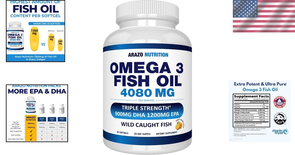 Brand: Unbranded Type: Vitamin Product Benefits: Heart Health Support Item Dimensions L X W X H: 2.48 X 2.48 X 4.39 Inches Item Form: Softgel Package Information: Bottle Active Ingredients: Omega-3, Fish Oil Expiration Date: Omega 3 Fish Oil Main Purpose: Heart Health Diet Type: Gluten Free Unit Count: 60.0 Count Ingredients: Fish Oil, Omega-3 Product Dimensions: 2.48 X 2.48 X 4.39 Inches; 4.97 Ounces Formulation: Softgel gtin13: Does not apply Special Ingredients: Fish Oil Number of Pills: 60 Item Weight: 4.97 ounces UPC: Does not apply Size: 60 Count (pack Of 1) Features: Burpless, Gluten-Free, Sustainable, Odorless Flavor: Lemon Primary Supplement Type: Omega 3 Dosage: 4