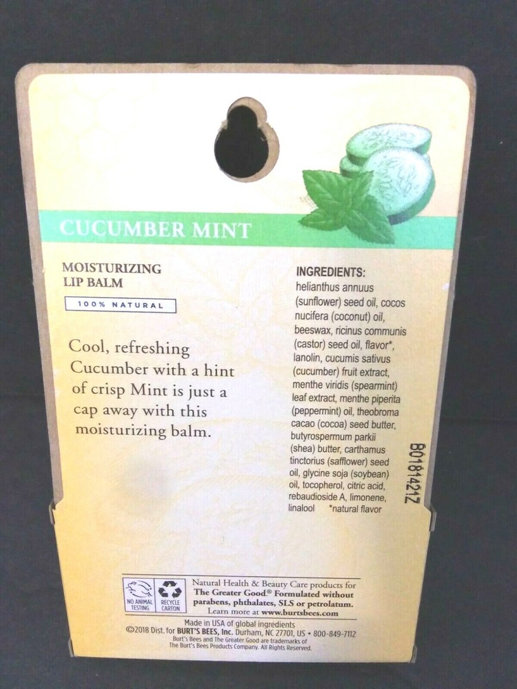 Burts Bees Lip Balm Beeswax 100% Natural Moisturizing Cucumber Mint 2 Tubes Please Read The Return Policy,Descriptions And 1 Day Handling Times Carefully Before Purchasing *** ATTENTION !!! My Best Offer Is Set At $3.00 To $10.00 Less Than The Fixed Price *** *** All Photo's Are Of The ACTUAL Item(S) That You Will Receive Guaranteed *** *** Ships From The U.S *** (1 Or Same Day Handling Time ) **PLEASE READ!! *** Saturday-Cut Off Handling Time Is 7 Pm Eastern Standard Time(Will Ship On Monday) Sunday - Cut Off Handling Time Is 7 PM Eastern Standard Time(Will Ship Next Day On Monday) Mon.-Fri. - Cut Off Handling Time Is 1 PM Eastern Standard Time(If Ordered After 1 PM Will Ship Next Day) *** If Order On A Major Holiday We Will Ship The Day When The Post Office Reopens *** *** Ships USPS Ground Advantage Mail Package Delivery (Reg.Env.10x10x1) *** (U.S) *** Ships EBAY International Standard Delivery (Reg..Env.10x10x1) *** (International) Item Description : Burt's Bees Beeswax Lip Balm 100% Natural Moisturizing Cucumber Mint 2 Tubes NEW **Be Sure To Inspect Your Item Immediately Upon Arrival Please Leave Positive Feedback If You Are Happy And Satisfied With your Purchase If By Any Chance That The Item Is Not As Described Please Contact Us So That We Can Fix It...Please Report The ERROR To Us. Condition- *** NEW *** *Location : From A Smoke Free And Pet Free Home ! *Payment : ALL TRANSACTIONS MUST BE HANDLED THROUGH EBAY ONLY!! *Shipping : We Ship All Items 1 Or Same Business Day Of Payments Clearing (Including Weekends And Holidays) We Ship Worldwide * Return Policy:Please Read Carefully !! IF WE OFFER FREE RETURNS !!! We accept a return for any reason during 30 days after receiving the item Undamaged,in resalable condition and original package for a refund less ALL shipping costs plus restocking fee 10%. Items That are Broken,Taken Apart,Scratched from a smoking environment will not get a refund. Please be gentle with the item. We Provide you with Descriptions; If you need more information about the item ..Please don't hesitate to ASK ! We will be more than happy to help you to make the right purchase. HAPPY AND SATISFIED CUSTOMERS ARE OUR # 1 PRIORITY !!! ***** Contact Us ****** Please Feel Free To Contact Us With Any Questions About The Item Thank You For Stopping By And Have A Great Day!!