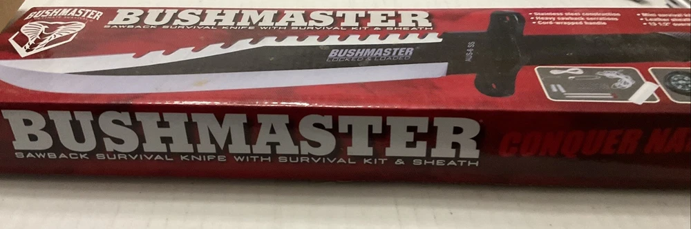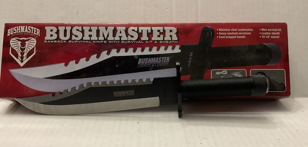 The Bushmaster BK2850 #753 is a modern fixed blade knife designed for survival situations. Known for their durability and quality, Bushmaster knives are a popular choice for outdoor enthusiasts and collectors alike. This specific model is designed to be reliable and efficient in various survival scenarios, making it a valuable addition to any knife collection. See photos. Never used. Taken from box for pictures.
