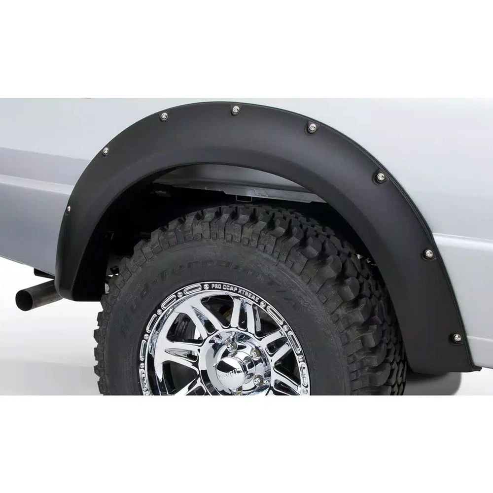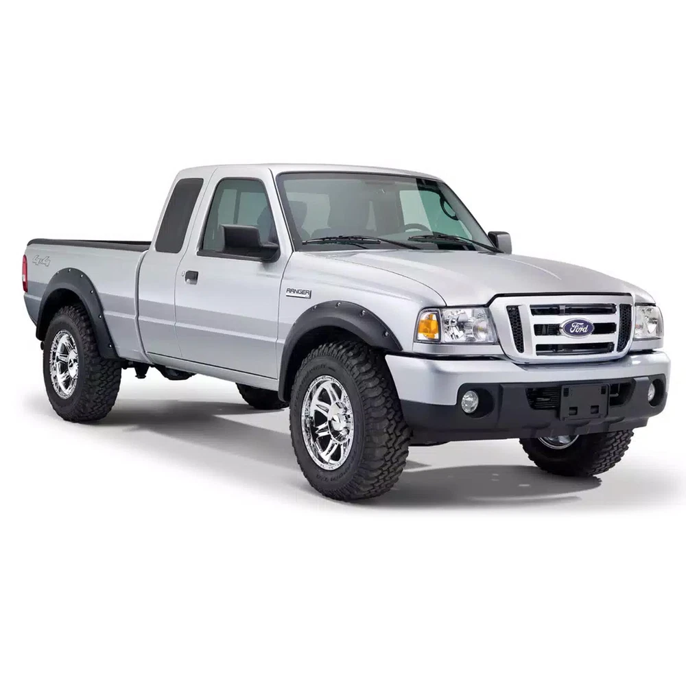 $ImageURL1$ Bushwacker Pocket Rivet Style Rear Fender Flares Set for 1993-2011 Ford Ranger PART NUMBER: 21038-02 BRAND: RealTruck Bushwacker DESCRIPTION Pocket / Rivet Style Rear Fender Flares Set Give your truck a rugged new appearance with a set of Bushwacker Pocket-Style Fender Flares! Ideal for applications running oversized tires and low-offset wheels, Bushwacker's Pocket Flares provide excellent tire coverage to prevent rock chips and conform to local laws. Bushwacker flares aren't only functional, but they're also highly durable! These fender flares are manufactured from Bushwacker's proprietary Duraflex 2000 ABS compound, resisting abrasions, chemicals, chips, and cracking. While Duraflex is UV-resistant, the compound can also be painted to match the finish of your pickup. Stylistically, Bushwacker Pocket-Style Fender Flares feature a rugged aesthetic. Recessed pockets line the entire diameter of the flare, which house stainless-steel simulated rivets for a bolt-on appearance. But don't worry; these flares don't generally require you to drill into the body! While the faux rivets may look real, Bushwacker flares are engineered to use existing holes in the body for mounting. Most applications feature a simple, no-drill installation; however, specific models may require minor trimming. These fender flares are made in the USA using global materials and come backed by a limited lifetime warranty. When it comes to style and tire coverage, it's tough to beat a set of Bushwacker Pocket-Style Fender Flares FEATURES Duraflex 2000 ABS construction Smooth finish Paintable Pocket style design with recessed faux stainless-steel bolts Rugged, off-road look Provides maximum tire coverage Designed to complement oversized tires UV-resistant to prevent fading, cracking, or chalking Sold in 2-piece set Simple bolt-on installation Includes all necessary hardware Made in the USA with global materials