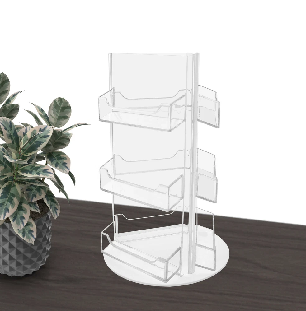 Business Card Holder 9 Pocket Rotating Countertop Display Spinner This nine pocket rotating business card holder provides an attractive desktop display for business cards or gift cards that complements any decor. Made of durable clear acrylic, the generous space between the card pockets provides full visibility of all nine sets of business cards access for card removal. Conveniently placed on desks, retail counters, tables or anywhere you want to leave your cards for the taking. Many retailers position an acrylic holder near the register, so customers can easily sign up for company cards or buy gift certificates. Advertising like this is one of the best ways to improve brand recognition and increase repeat purchases. This clear acrylic display stand is perfect for entrepreneurs who need to promote their business on numerous tables or counters to display your information in a clear and easily accessible manner, these are great for placement in restaurants, hotel reception areas, weddings, schools and other various venues such as Trade Shows, Flea Markets or Expos. In addition to business information, the clear acrylic holder can also be used to display other small media. Store credit cards or gift cards are often placed in the holder near the register or checkout stand to increase clientele and expand the customer base. Other times, simple gift certificates, and doctors appointment cards are placed in the pockets. Product Features : Perfect display solution for business cards and gift cards Space-saving design displays nine sets of cards in one convenient holder Freestanding and portable; display on desks, retail counters, or tables Angled, rotating design offers optimal view of cards Overall Dimensions: 4.5"w x 10"h with 6"W Base Pocket Dimensions: 3 11/16"w x 3/4"d Pocket Capacity Approx 50 Business Cards Premium High Quality Acrylic Return Policy 30 Day Return Policy: By purchasing our product you are agreeing to our return policy, so please read! Perfect returns (NO used merchandise) on stock items are accepted within 30 days of delivery. Any visual appearance that the product is used will result in 00 refund. All returns are subject to a 20% inspection, re-boxing and restocking fee. All returns must be repacked and returned in their original packaging for protection. (MUST return on pallet if received on Pallet) Packages being returned should be insured by you for your protection No credits are issued on shipping costs. Absolutely no returns accepted on custom order displays, including orders with custom text, imprinting or graphics