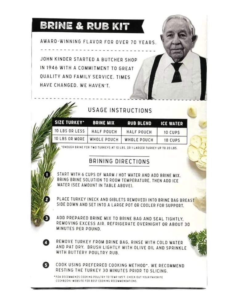 Includes brine mix (10 - ounce), brine bag that will hold up to a 20 pound turkey, and a buttery garlic and spice blend rub (1.25-ounces) Includes brine mix (10 - ounce), brine bag that will hold up to a 20 pound turkey, and a buttery garlic and spice blend rub (1.25-ounces) Organic Gluten Free