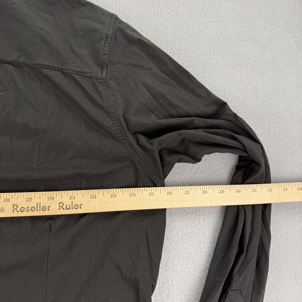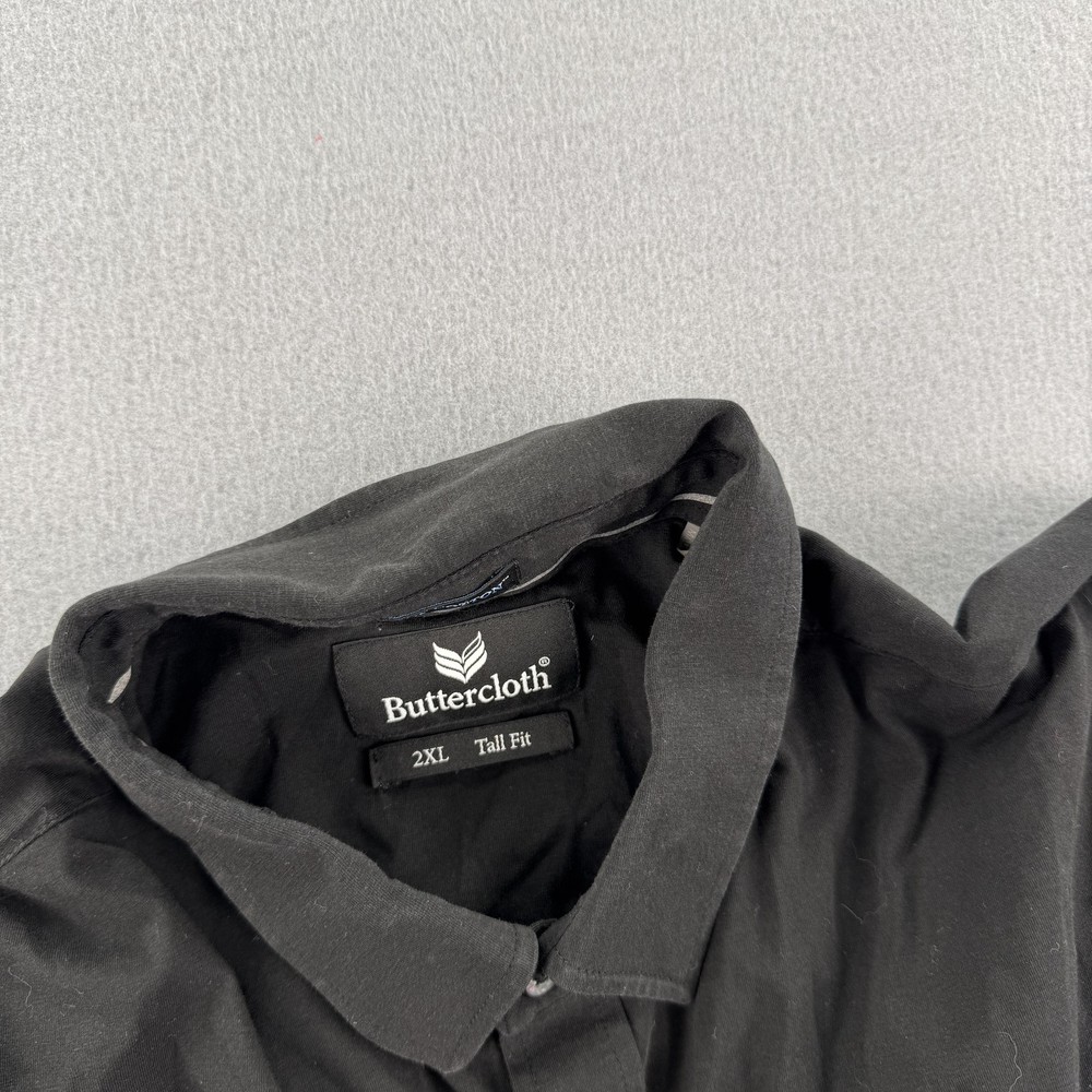 Buttercloth Shirt Mens 2XL Tall Black Icy Cotton Button Up Long Sleeve Dress Condition: Good used condition, some light wrinkling from storage, no visible stains or holes Tag size: 2XL Tall Fit Color: Black Brand: Buttercloth Button up front closure with black tonal buttons Collared neck style Long sleeves with double button cuffs Icy Cotton technology for enhanced cooling comfort Back yoke for added mobility and tailored fit Buttercloth logo on inner neck label Material: Not specified (typically a blend known for softness and stretch; see Buttercloth's standard materials) Pit to pit measures approx. 25.5 inches; back length from collar seam approx. 34.5 inches (see photos for measurements)