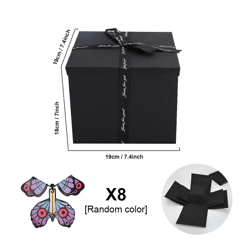 Features: 1. Box material: paper, ribbon 2. Butterfly material: plastic+paper 3. Butterfly color: Random 4. Butterfly size: 11 * 12 * 0.5cm 5. Box size without unfolding: 23.9x23.9x17cm 6. Box unfolding size: 54x54x0.5cm 7. Minimum gift box size: 10 * 10 * 9cm Gift surprise: The pop-up butterfly gift box can be used to wrap the gift. When the recipient opens the box, the butterfly will suddenly fly out, giving a surprising effect, increasing the uniqueness and memory of the gift. Celebration activities: On special occasions such as birthdays, anniversaries, and marriage proposals, popping up a butterfly gift box can serve as a unique way of celebration, adding joy and festive atmosphere to the occasion. Stage performance: The butterfly pop-up gift box is also used in stage performances, magic performances, or entertainment performances as a visual effect element to increase the excitement of the performance. Package Include: Gift box * 1 set Ribbon * 1 Butterfly * 8 Double-sided tape * 1 About Shipping 1. If you choose to ship from China, we ship by the AliExpress Standard Shipping; if you choose to ship from overseas warehouses, we will ship by the local logistics delivery. 2. Your order is generally shipped within 24-48h, please kindly be more patient to wait. 3. Anything please feel free to let me know,we will solve it for you as soon as possible. About Service 1. If you have any questions, please feel free to contact us. And we will reply in 24 hours except weekends. 2. If any problems comes to you, please don't worry. You can contact us first. We promise we will try everything possible to help you. 3. Please pay attention to the time difference between us. We work in China. About Feedback Your confirmation will be highly appreciated after receiving the items. Once you have received the product, hope you could leave us a positive feedback(4 or 5 stars). -BEFORE you leaving the negative feedback. PLEASE contact us at first, and we can help you solve the problem. We strive to do better and make you feel satisfied!