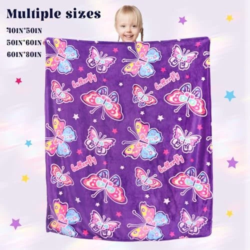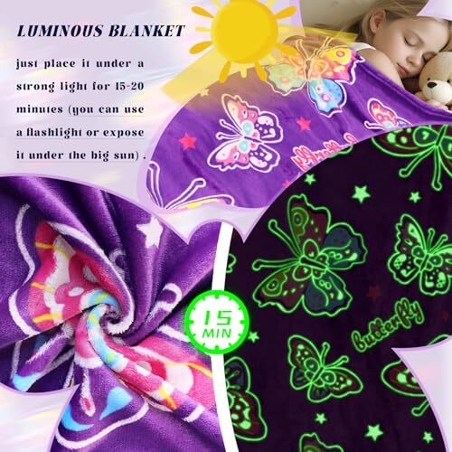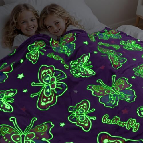 Glow In The Dark Blanket Butterfly Blanket Girls Blanket Girls Gift BIRTHDAY GIFTS FOR GIRLS-it can be a surprise gifts for girls who love butterflies.the glow in the dark cute stuff blanket can light up at night which can inspire funny ideas for kids to enjoy the magical glow.it can be a butterfly gifts ,girls gifts for birthday, halloween, christmas,easter, thanksgiving,mothers day or any other party.it's also can be Girl Toys Butterfly Blankets for all age,a choice for girl birthday gifts,little girl gifts,presents for girls,gifts for girls 4 5 6 7 8 9 10. GLOW IN THE DARK BLANKET-make your child's nights magical with our plush light up blanket.our butterfly throw blanket is mysterious and interesting.it can shine in the dark.just place it under a bright light source or sunlight for about 15 to 20 minutes.you will see many butterflies shining in the dark.the brighter the light,the stronger the blanket will be in the dark.create a magic atmosphere for your bedroom and watch the magic happen. BUTTERFLY BLANKET FOR KIDS-glow in the dark butterfly blanket are made of soft,silky microfiber material that breathable and warmth.the unique design of butterfly pattern blanket is that it glows in the dark.this warm blanket are long-lasting,resistant to shrinkage and wrinkling, and retain their shape over time. SOFT COZY BLANKET- glow in the dark kids blanket is made of skin-friendly material,unique design of the blanket is that it can glow in the dark.the unique design provides you with a different sense of softness,you will feel warmth and comfort in the bed.whether it's a cozy night on the couch, sleeping in the room, or traveling in the car, this lightweight warm blanket can use for all seasons and ages.If you want a blanket that can be used all year round, this would be a good choice. CUTE BLANKET FOR TEENS-this fleece blanket uses new luminous technology, comfortable fabrics and cute patterns. these unique designs make this blanket not only look cute, but also decorative. our luminous blanket has many patterns and styles for you to choose from, and we hope you can choose your favorite pattern.when you're done cleaning this adorable blanket, we recommend machine washing it separately on the gentle cycle in cold water and tumble drying on very low.