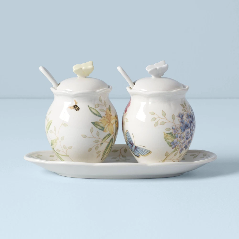 The most popular casual dinnerware collection in America, Butterfly Meadow is truly a contemporary mix and match classic. Inspired by the artistry of Louise Le Luyer, there are many delightful pattern varriations to choose from, each offering an exquisite array of butterflies, blooms and other wonders of nature, all rendered in a soft color palette. Crafted of the finest porcelain, Butterfly Meadow is the perfect choice for today. All of the dinnerware is safe for use in the dishwasher. Designed for chip-resistant durability, Butterfly Meadow will take a cherished place in your home for many years and offers the opportunity to expand your collection with the incredible range of dining, decor and gift giving choices available. Best of all, this versatile, stylish and fun collection is created by , America's first name in home entertaining. Known around the world for offering a unique combination of design, artistry and superior quality for over 125 years. Pretty as a picture! Your Butterfly Meadow collection is not complete without this 7 piece condiment server. Use it for sauces, dressings, mustards, honeys, jams and jellies. Giftboxed set includes 8.25" scalloped tray with 2 condiment jars, 2 slotted lids and 2 porcelain spoons. Made of chip-resistant white porcelain Microwave and dishwasher safe Florals and butterflies in exquisite colors adorn each scalloped piece Giftboxed 7 piece set includes an 8.25" tray with 2 condiment jars, 2 lids and 2 spoons