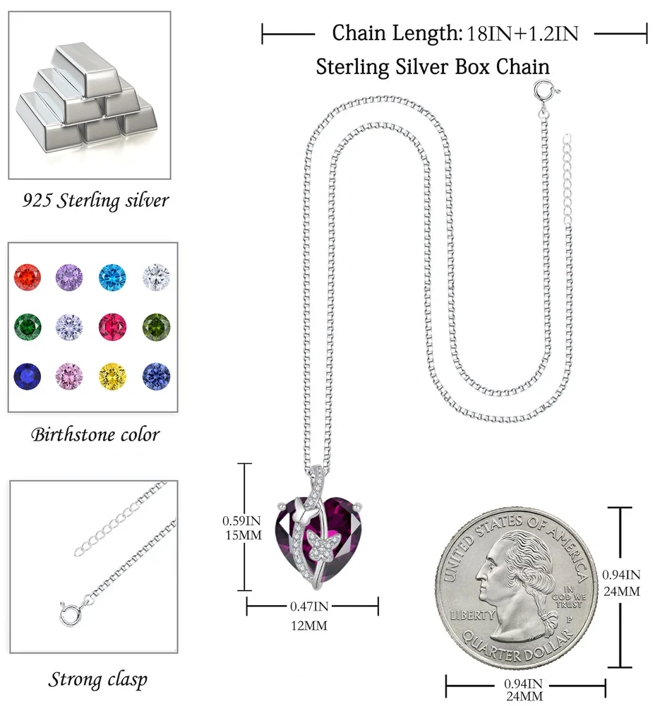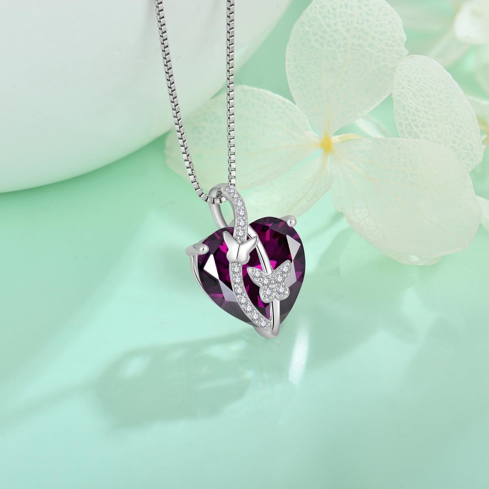Butterfly Necklace 925 Sterling Silver Heart February Birthstone Amethyst Butterfly Necklace Created Gemstone Pendant Jewelry Gifts for Women 🎁This butterfly pendant petting with heart-shaped created zirconia.Both pendant and chain made of solid sterling silver. 🎁The butterfly necklace made of 925 sterling silver ,pendant size:0.59inches(L),0.47inches(W);chain Length:18 inches+1.2inches(extension) 🎁Unique heart design can better convey the feelings between you and her.She will be reminded of your love and all of the laughter you've shared.You express sweet love to each other. 🎁A special gift for women.Attractive,charming,sparkle and fashion.You can wear it in any occasions,such as souvenir,christmas day, engagement,valentine's day,birthday,anniversary,graduation,prom,carnival,banquet or a particular party. 🎁1 * necklace,1 * gift box. We can guarantee that this is a high-quality necklace.If you have any questions, please feel free to contact us at any time.