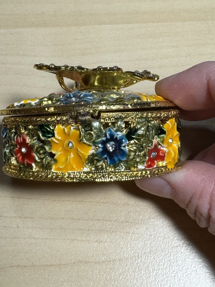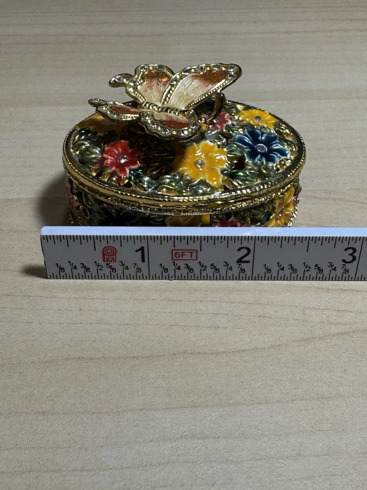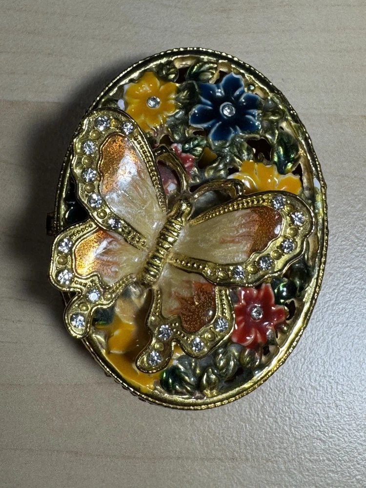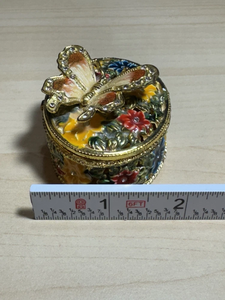 Shape: Butterfly Subject: Butterfly Original/Reproduction: Original Size: Mini Collection: Keepsake Boxes Finish: Jewelled Country/Region of Manufacture: United States Type: Trinket Box Department: Adults Style: Traditional Pattern: Floral Color: Multicolor Item Length: 2.5 in Occasion: All Occasions Features: Boxed Closure Type: Magnetic Time Period Manufactured: 2020-Now Packaging: Box Brand: Butterfly Theme: Butterflies Material: Metal