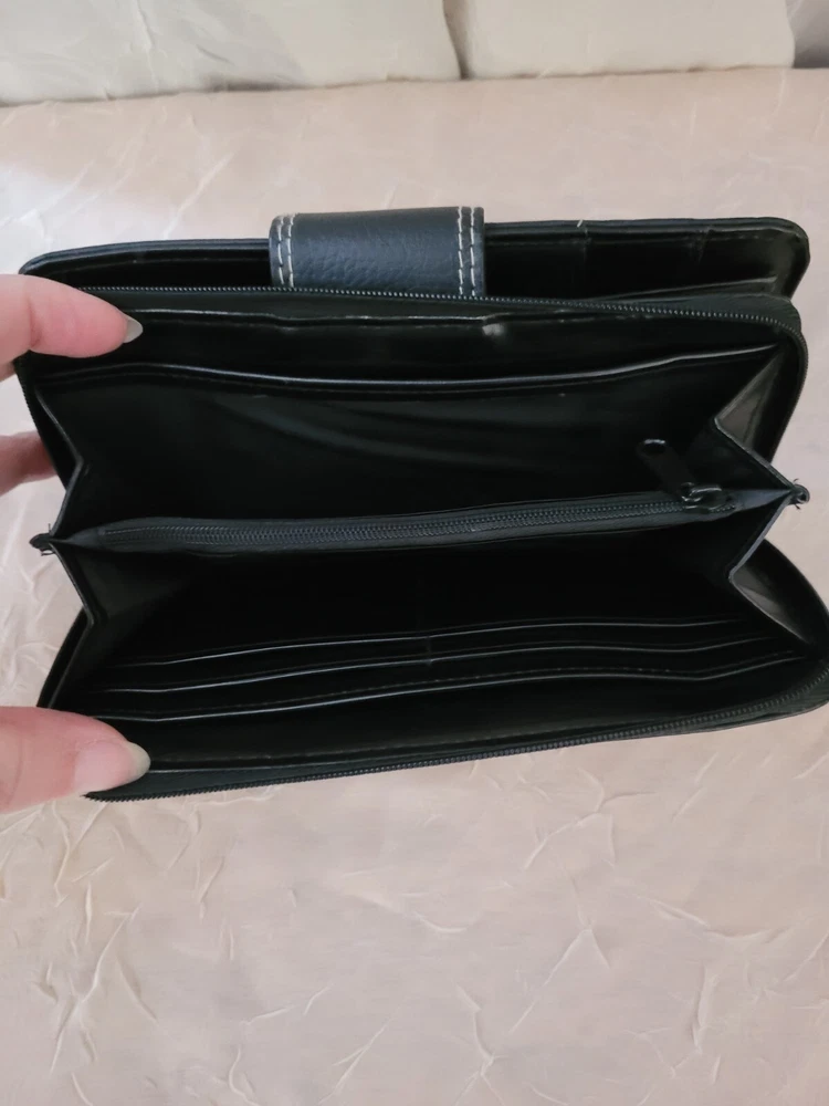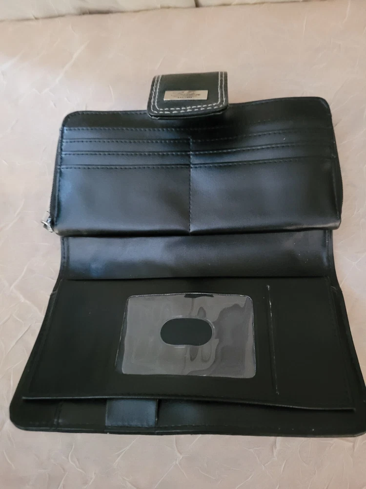 Color: Black Type: Wallet Size: M Brand: Buxton Pattern: Solid Vintage: No Item Length: 7” Features: Credit Card, Folding, Picture Holder, Drivers License Pouch, Pen Pouch, Coin Keeper Material: Leather Style: Zip-Around Handmade: Yes Item Width: 4" Department: Women