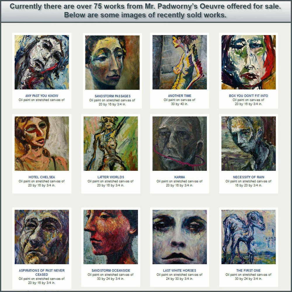 https://www.linkedin.com/in/padworny x7 Title: UNTITLED x7 Oil Paint on Gallery Wrapped Stretched Canvas Has paint drips on the bottom of the canvas, see images below 20 by 16 by 3/4 in. (50.8 cm by 40.6 by 1.9 cm.) [Please allow me a few days to package and ship these oil paintings -- thank you!] signed on front and back Note: I am very happy to entertain all offers on paintings. Every offer received is always considered a compliment. - DP Note: I am very happy to entertain all offers on paintings. Every offer received is always considered a compliment. - DP S C R O L L D O W N T O V I E W M O R E D E T A I L I M A G E S To sign up for the weekly newsletter of new auctions and paintings in the eBay store CLICK HERE Title and Provenance This painting is entitled UNTITLED x7 , and includes the original signature of artist on front of painting and verso, with painting catalogue series and number applied on verso. Painting also includes a Certificate of Authenticity documenting chain of title and provenance for this work. Painting number x7 may be included in forthcoming Catalogue Raisonné of the works of DAVID PADW0RNY. Medium and Dimensions Oil Paint on canvas of 20 by 16 by 3/4 in. , including hanging clip. This painting is pre-stretched and sides of the canvas are painted (see images below). Each of the sides are painted differently, to read more about why each is painted in a unique manner please click here . The staples holding the canvas to the stretcher bars are on the back so the painting is ready for immediate display. Shipping notes: We are pleased to combine shipping. If you intend to buy/bid on additional works, please send email to let us know your preferences. If you would prefer overnight or expedited shipping we will be happy to accommodate your wishes - please email for a specific bid. If you wish to combine shipping -- please request that the future invoices be changed to reflect combined shipping. For more details on combined shipping please visit these links based on your location: United States , Canada , all other International . Payment: PayPal is preferred. Paintings will ship upon bank clearing your funds. Please make payment within 5 days of sale. If there are special circumstances that might prevent this -- please email prior to sale. Thank you. Guarantee: If for any reason the actual painting does not meet your full expectations, please return it upon receiving it in its original condition and packaging materials. We will refund the full cost of the painting, less shipping costs. Additional Images and Materials (All links below will open in a new window) To sign up for the weekly newsletter of new auctions and paintings in the eBay store CLICK HERE About The Artist DAVID PADW0RNY was born in Norristown Pennsylvania. He is a graduate of the Maryland Institute College of Art and is currently working full time as a professional artist in Chelsea, NYC. Awards and Honors Scholastics Portfolio Award, New York, New York Ed Lindgren Memorial Scholarship, Sponsored by Artworks Orlando Orlando, Florida Fanny B. Thalheimer Scholarship, Maryland Institute College of Art Baltimore, Maryland First Place and Honorable Mention in Painting, Maitland Arts Festival Maitland, Florida Best of Show and First Place, "Enjoying Our Lakes" Photography Contest Windermere, Florida Three Gold Medals, Scholastics Competition, University of Central Florida Orlando, Florida Additional Paintings Offered other ebay auctions (opens in a new window) Collector Comments Please feel free to email your opinions and comments of the paintings. We look forward to hearing more from you, our Valued Collectors, Gallerists and Curators. -- D.P.