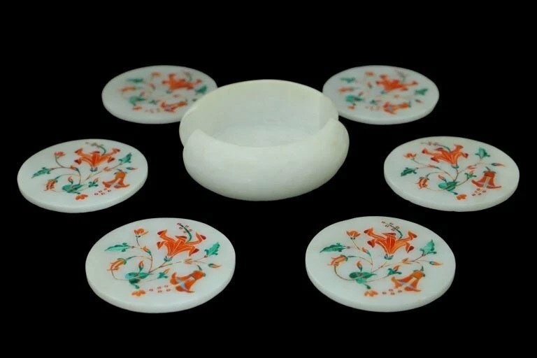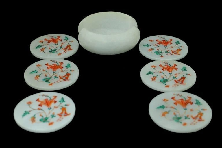 Product information Coaster Holder Size: 4"x4" Inches Coaster Plates Size: 3.5"x3.5" inches Material: Marble & Semi Precious Inlay Stone Shape: Round Finished- Polished Process of Making Marble Inlay We are inlaying semiprecious stones in three different colors of marble White Marble,Black Marble & green marble. The Marble used to inlay the semiprecious stone comes from city of Makrana, Rajasthan India. First we cut the marble in different shape example Round,Octagonal,rectangle,oval & square shape. After cutting the marble we paint the surface of marble with Hina(red Color) so we can sketch the geometry on the surface of Marble. With the Help Of emery wheel we cut,polish & shape the semiprecious in different forms of flowers,buds,leafs & stems all the cutting of the semiprecious stones are manually cut by the artisans. After cutting the semiprecious stones we assemble them to complete the motif & then the semiprecious stones are placed on the surface of marble so we can trace them on the surface of marble to make the exact size of the cavities once the stones are traced we remove the stones from the surface of marble & then manually we chisels the marble with the diamond chisels & tungsten carbide chisels once the cavities are completed we place the semiprecious stone in the cavities to check the depth of the stones. When we are fully sure that the stone fits well in the cavities we use special kind glue to fix the semiprecious stones into the marble. After completing the inlays into the marble we first rub the surface of marble with sandstone & then we polish the surface of marble with sandpaper which brings the natural shine on the surface of marble & to the semiprecious stone & we use wax polish to make the surface shiny. Most interesting expect of this pietre dure( marble inlay with hard stone) all the designs are made by the artisans are purely an imagination of artist once made they cannot make another one exactly the same it will look similar but will not be the same. This beautiful art is a dying art of Agra,India the artisans those make this beautiful art are the descendants of those families who built the Tajmahal in 17 century Tajmahal is a monument of love & you can easily see the artwork done with the same technique on the walls of the Tajmahal. I Invite you to come to Agra,India & visit the beautiful Tajmahal & you will surely be impressed & we request you give us a chance to show you the true handmade art of Agra by our artisans. When you are purchasing this beautiful handmade Marble inlay art you will always be happy because all the pcs made by our artisans with love,hope & happiness. You will always be enjoying the beautiful handmade marble inlay artwork secondly you will be supporting the local artisans of Agra,India to keep this beautiful dying art Alive. All the purchase benefits the artisans & the buyer as there is no middle men in selling & buying. USE OF THE PRODUCT It is beautiful for Kitchen & Home decorative handmade Inlay Art add Royal Ambiance to your Home. You can use this as a Hotel, villa, home use & interior decorations,Wedding Occasion & Corporate Gifts. Note We welcome your personalization request (custom request) as per your size, shape and design but you have to pay spare money. Buyers are liable for any customs and import taxes that may apply. I'm not liable for delays due to customs. Marble inlay handicrafts & other natural marble products are handmade products, colors of semiprecious stones & marble used may slightly vary from the image shown. Equipment & accessories are used only for photography purpose which do not ship with the product. We are unable to ship to a PO Box address & for Russia, Brazil country we need firm entity name or business name parcel will not go to individuals name. If you have any query please feel free to contact us. Shipping & Packaging For shipping we use DHL & FedEx Export packing sealed wooden, crate with foam plastic straps outside. If there is any Local Tax, Custom Duties or Vat at the destination, it will be paid by the buyer Inspiration/Story Behind This Product This beautiful art is a dying art of Agra,India the artisans those make this beautiful art are the descendants of those families who built the Tajmahal in 17 century Tajmahal is a monument of love & and one of the seven wonders in the world you can easily see the artwork done with the same technique on the walls of the Tajmahal. Wish you a very happy day & Happy shopping