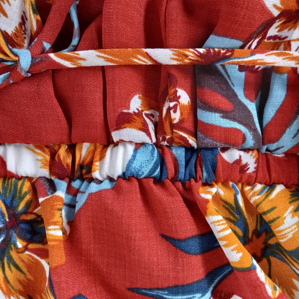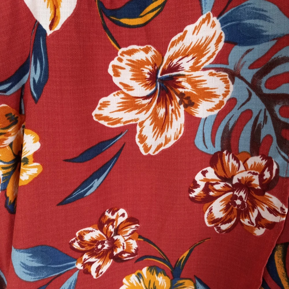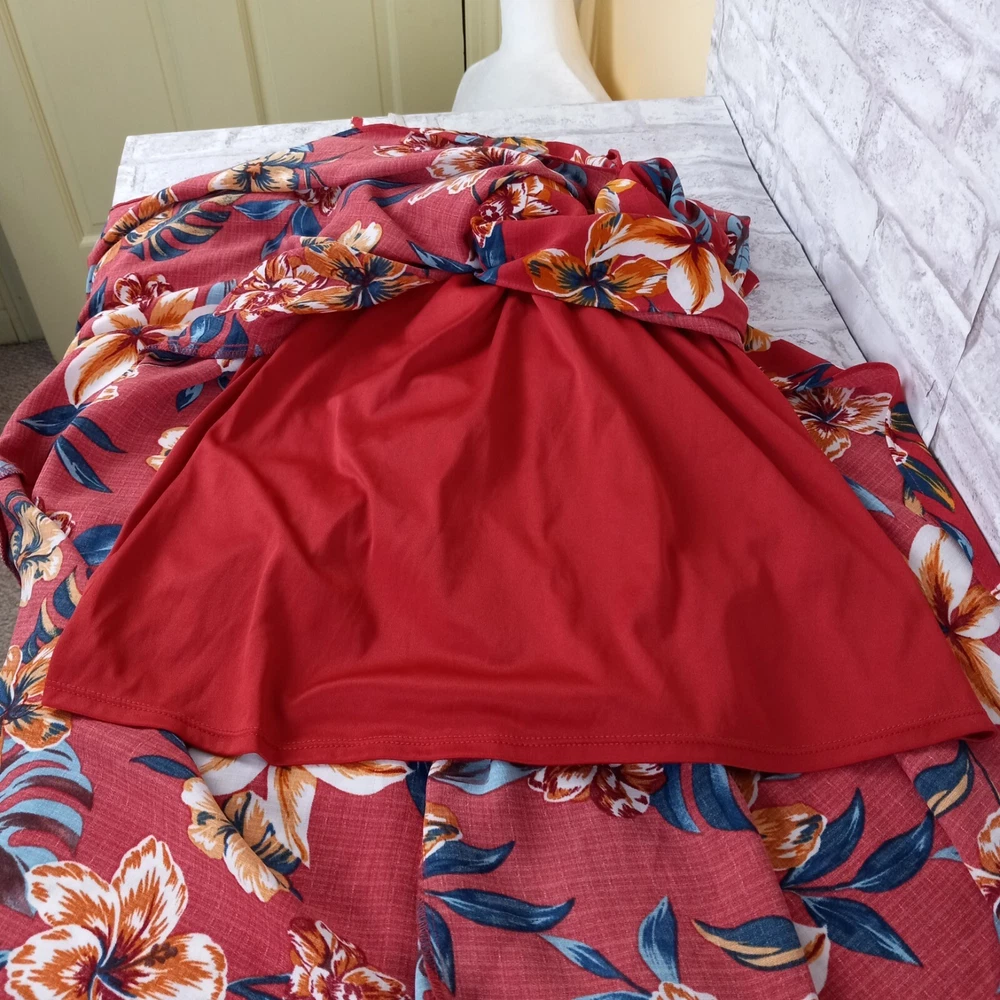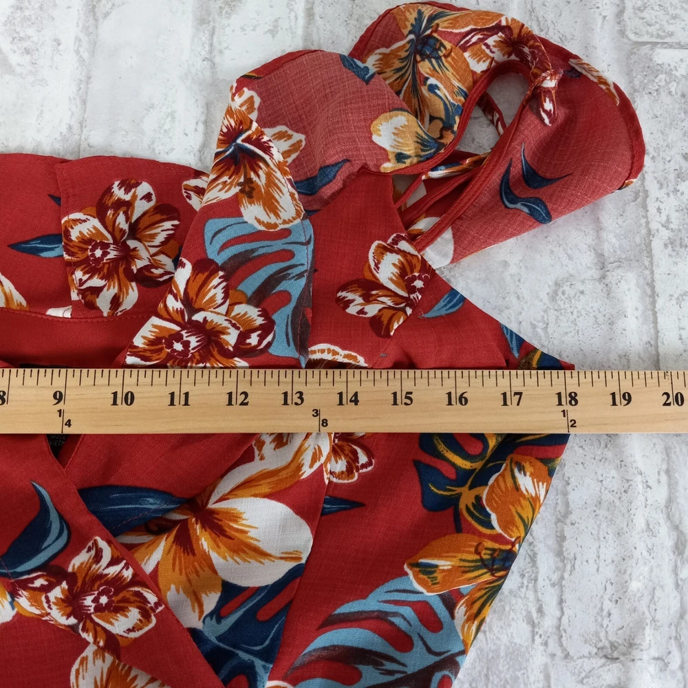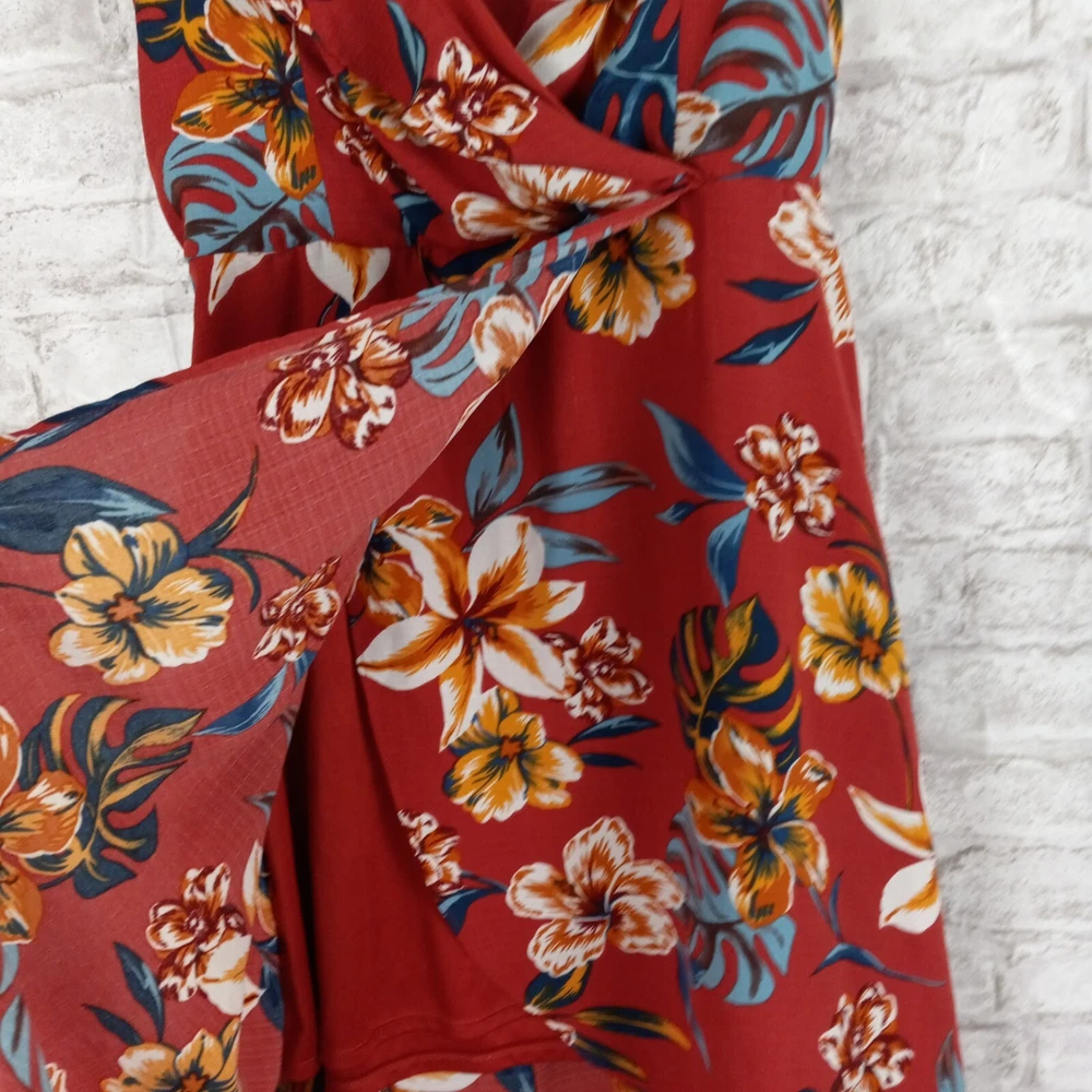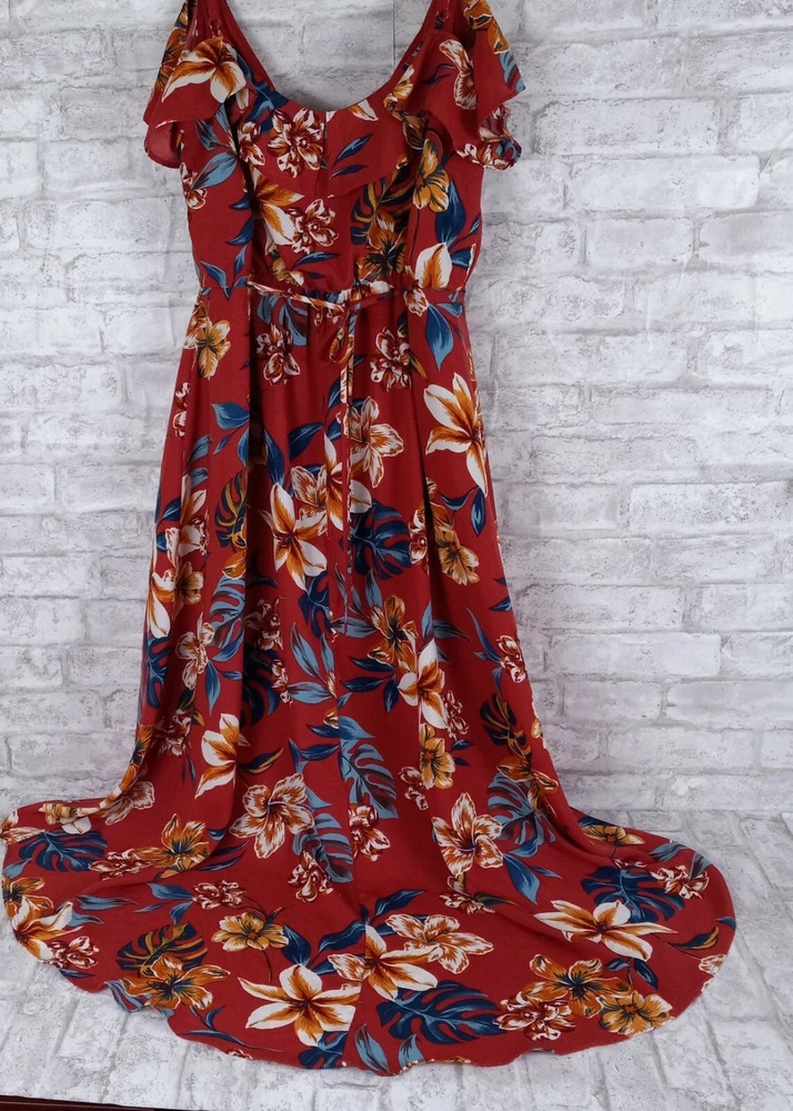 Get ready for your next tropical adventure with this stunning By & By Maxi Faux Wrap Dress. The dress features a vibrant floral pattern that is perfect for any Hawaiian or resort-themed occasion. The dress is made from high-quality polyester material and is machine washable for easy care. The dress comes in a size L and features a sleeveless design, V-neckline, and pullover closure. The elastic back waist and ties in the back provide detailed accents that add a touch of elegance to the dress. The dress is lined and has a hi-low hem that adds a stylish touch to the overall look. Perfect for summer, fall, or spring, this dress is a must-have for any fashion-conscious woman who loves to look her best on any occasion. Length is 54 inches in the back-shorter in the front. See pics for other measurements and details.