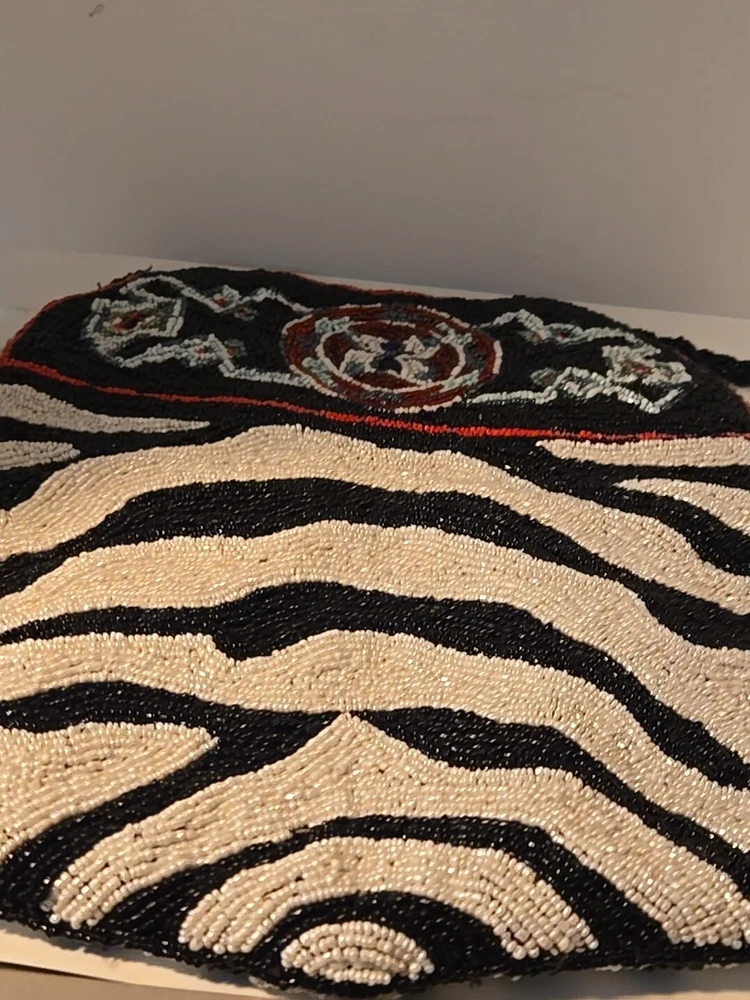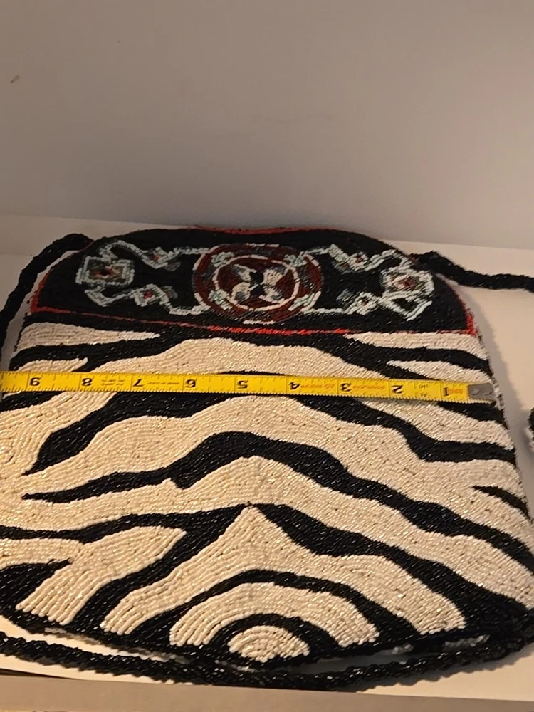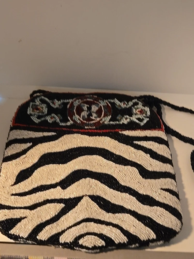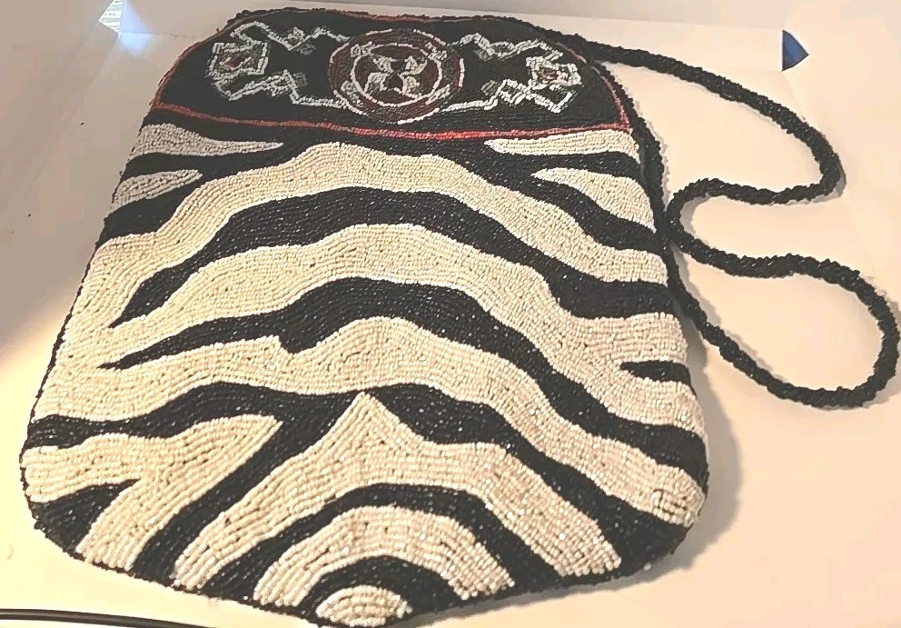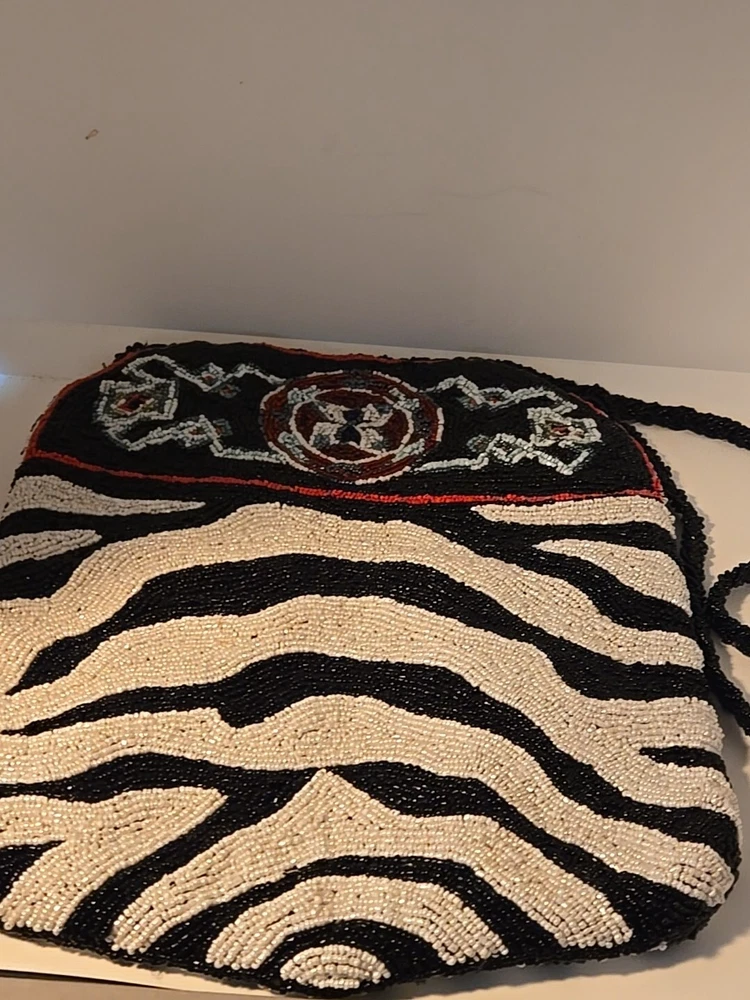 Add a touch of bohemian elegance to your outfit with this stunning By Kate Geddes TALISMAN Beaded Purse. This medium-sized shoulder bag features a striped pattern and is made of soft viscose material with a satin lining. The bag has a magnetic and snap closure, with a black handle drop of 18 inches and a strap made of glass beads. The Aztec-themed bag has inner pockets, and the beaded accents add a unique touch to the design. The TALISMAN model is a must-have for any fashion-conscious woman, and this purse is perfect for any occasion. Made in India, this purse is a great addition to your collection. Beautiful ZEBRA and Butterfly Designs. Great quality