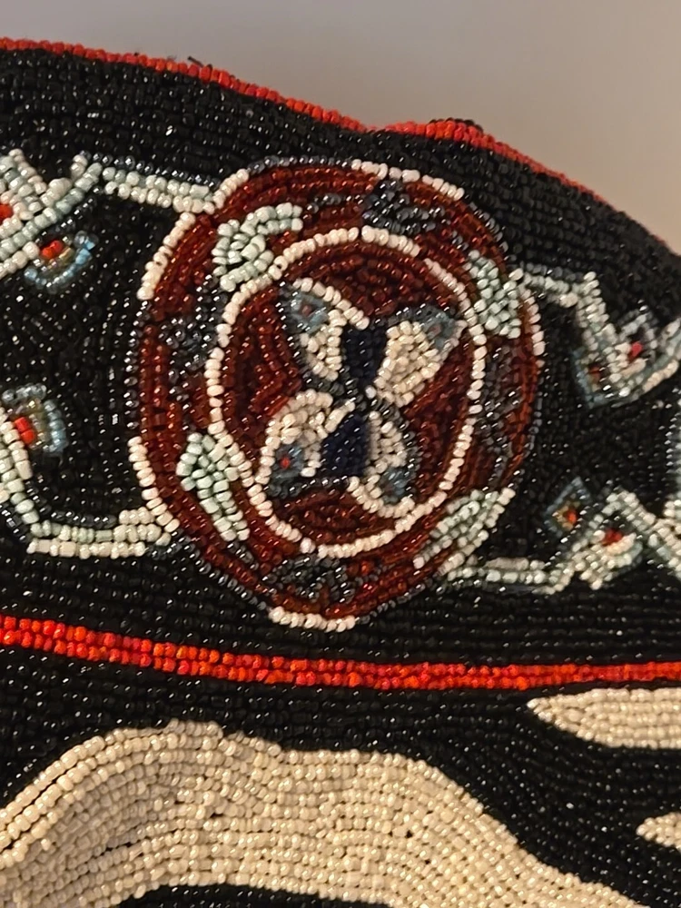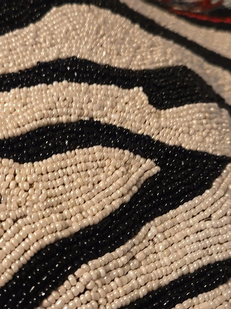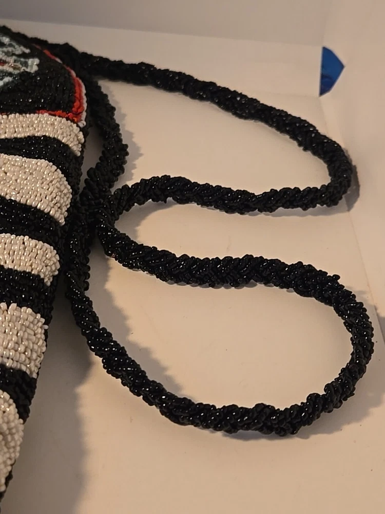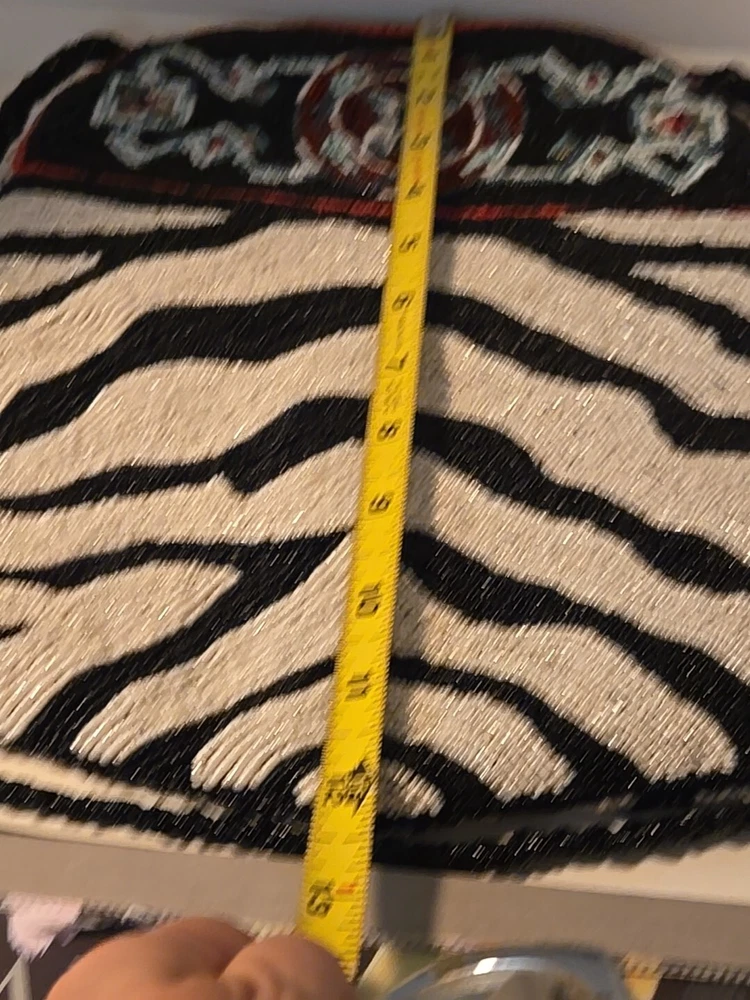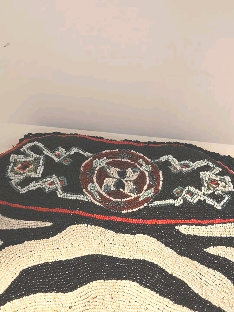 Add a touch of bohemian elegance to your outfit with this stunning By Kate Geddes TALISMAN Beaded Purse. This medium-sized shoulder bag features a striped pattern and is made of soft viscose material with a satin lining. The bag has a magnetic and snap closure, with a black handle drop of 18 inches and a strap made of glass beads. The Aztec-themed bag has inner pockets, and the beaded accents add a unique touch to the design. The TALISMAN model is a must-have for any fashion-conscious woman, and this purse is perfect for any occasion. Made in India, this purse is a great addition to your collection. Beautiful ZEBRA and Butterfly Designs. Great quality