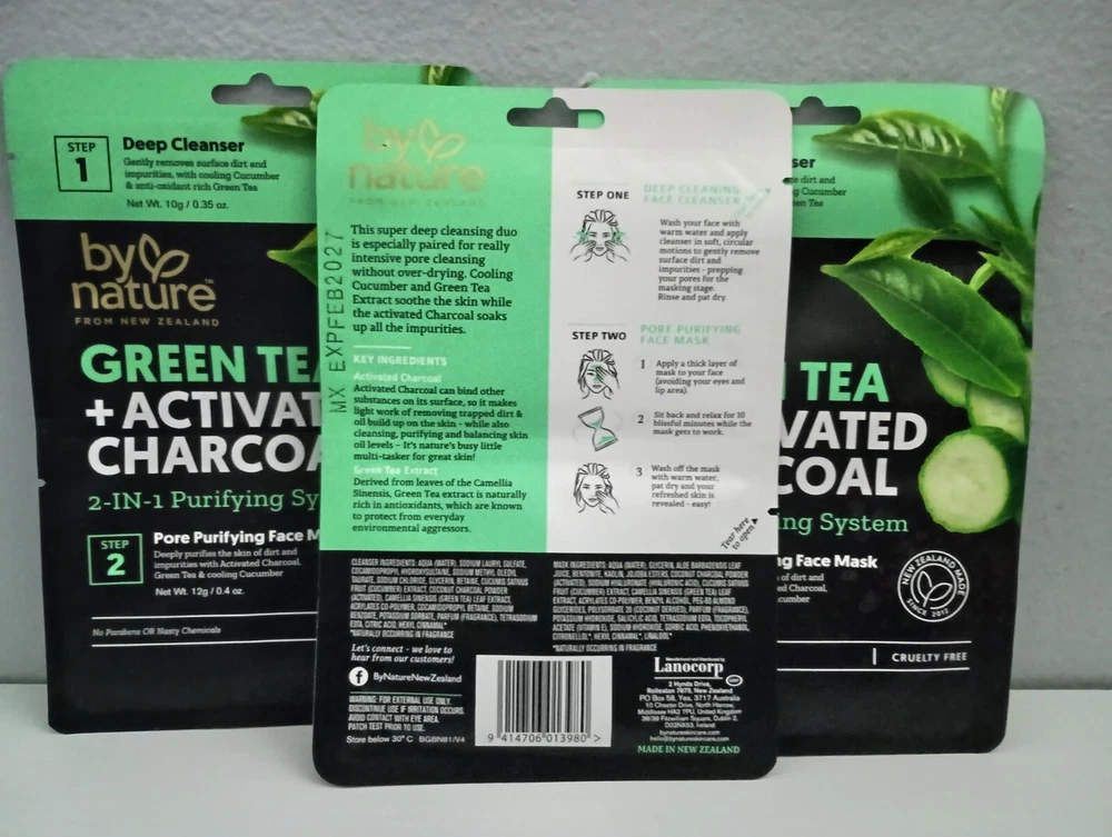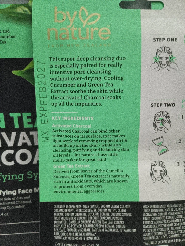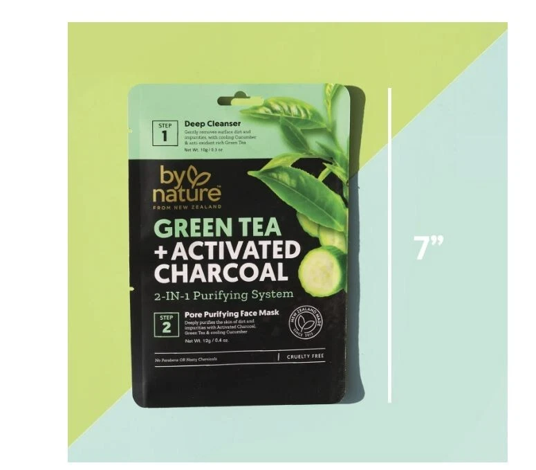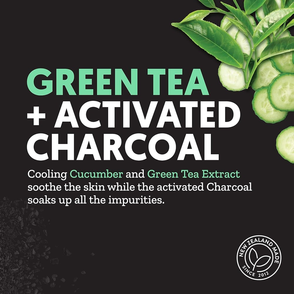 By Nature™ From New Zealand Green Tea + Activated Charcoal 2 in 1 Pore Purifying Face Cleanser and Mask (3 Pack) Vegan & Cruelty free from By Nature™ By Nature’s™ Green Tea & Activated Charcoal Two-Step Mask Kit. Green Tea Extract Derived from leaves of the Camellia Sinensis, Green Tea extract is naturally rich in antioxidants, which are known to protect from everyday environmental aggressors Activated Charcoal Activated Charcoal can bind other substances on its surface, so it makes light work of removing trapped dirt and oil build up on the skin - while also cleansing, purifying & balancing skin oil levels – It’s nature’s busy little multi-tasker for great skin! Cucumber • Vegan • No Parabens • Cruelty Free • Made In New Zealand • Wash Off Mask • Cleanses Skin This super deep cleansing duo is especially paired for really intensive pore cleansing without over-drying. Cooling Cucumber and Green Tea Extract soothe the skin while the activated Charcoal soaks up all the impurities. Ingredients Cleanser Ingredients: Aqua (Water), Sodium coco-sulfate, Glycerin, Lauryl Glucoside (Plant Based), Sodium Chloride, Betaine, Coconut Charcoal Powder (Activated), Camellia Sinensis (Green Tea) Leaf Extract, Cucumis Sativus (Cucumber) Fruit Water, Acrylates Co-polymer, Cocamidopropyl Betaine, Potassium Sorbate, Sodium Benzoate, Parfum (Fragrance), Citric Acid, Geraniol*, Limonene*, Linalool* *Naturally occurring in Fragrance Mask Ingredients: Aqua (Water), Glycerin, Aloe Barbadensis Leaf Juice, Bentonite, Kaolin, Jojoba Esters, Polyglyceryl-6 Caprylate/Caprate, Polyglyceryl-4 Laurate/Sebacate, Coconut Charcoal Powder (Activated), Camellia Sinensis (Green Tea) Leaf Extract, Cucumis Sativus (Cucumber) Fruit Water, Tocopherol(Vitamin E), Lecithin, Helianthus Annuus (Sunflower) Seed Oil, Sodium Hyaluronate (Hyaluronic Acid), Benzyl Alcohol, Xanthan Gum, Sodium Acrylates Copolymer, Sodium Citrate, Parfum (Fragrance), Salicylic Acid, Sorbic Acid, Phenoxyethanol, Sodium Hydroxide, Geraniol*, Limonene*, Linalool* *Naturally occurring in Fragrance