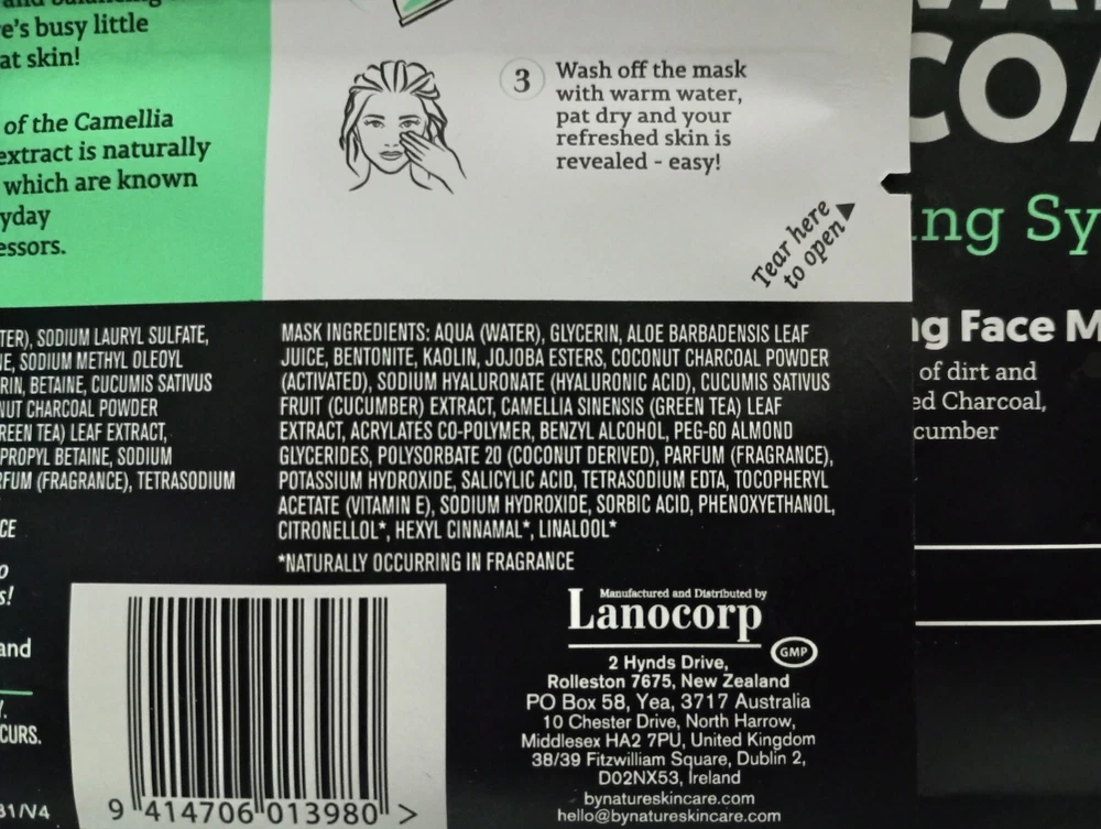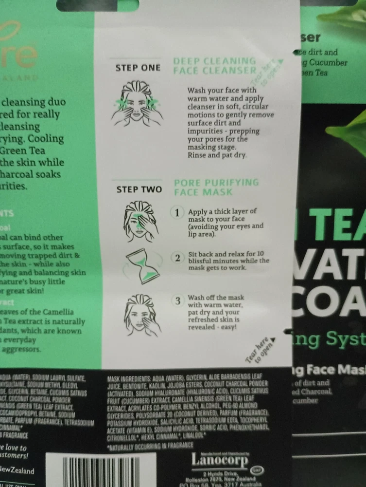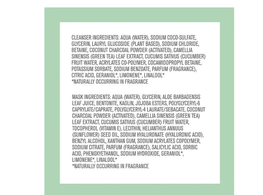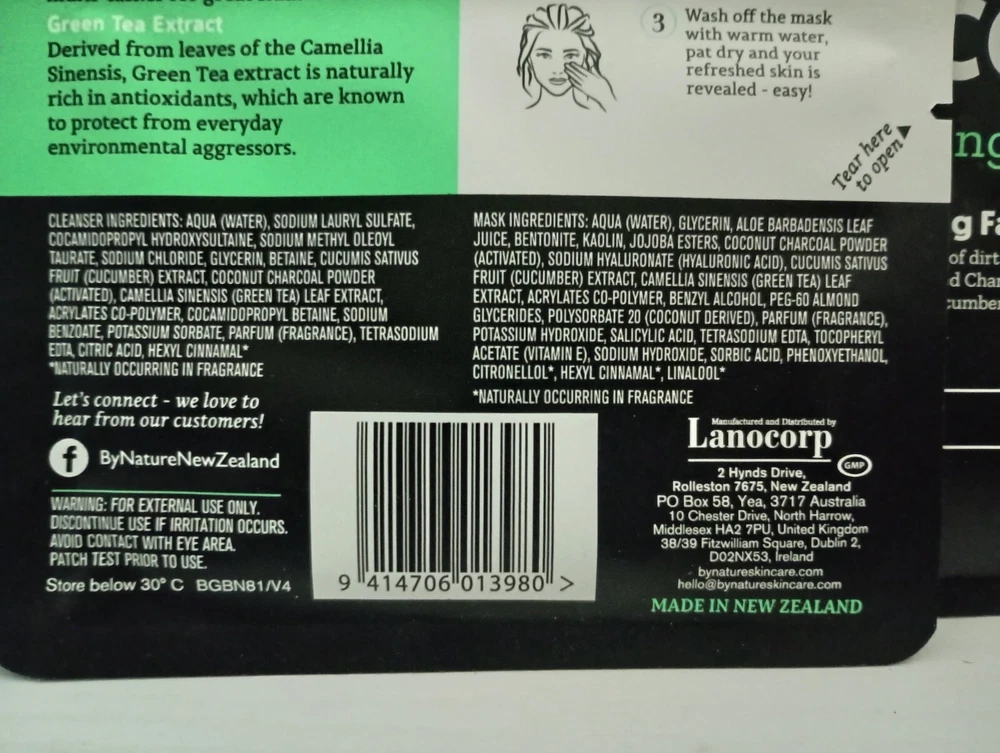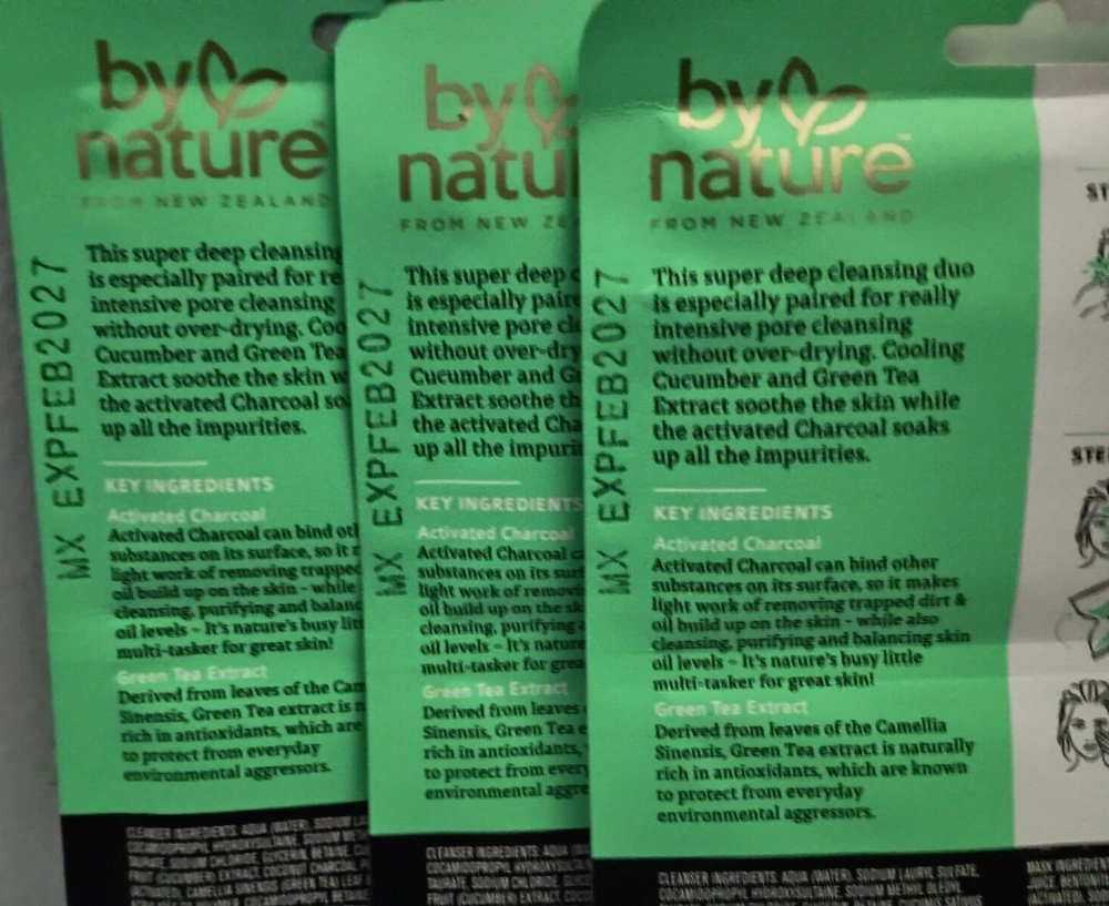 By Nature™ From New Zealand Green Tea + Activated Charcoal 2 in 1 Pore Purifying Face Cleanser and Mask (3 Pack) Vegan & Cruelty free from By Nature™ By Nature’s™ Green Tea & Activated Charcoal Two-Step Mask Kit. Green Tea Extract Derived from leaves of the Camellia Sinensis, Green Tea extract is naturally rich in antioxidants, which are known to protect from everyday environmental aggressors Activated Charcoal Activated Charcoal can bind other substances on its surface, so it makes light work of removing trapped dirt and oil build up on the skin - while also cleansing, purifying & balancing skin oil levels – It’s nature’s busy little multi-tasker for great skin! Cucumber • Vegan • No Parabens • Cruelty Free • Made In New Zealand • Wash Off Mask • Cleanses Skin This super deep cleansing duo is especially paired for really intensive pore cleansing without over-drying. Cooling Cucumber and Green Tea Extract soothe the skin while the activated Charcoal soaks up all the impurities. Ingredients Cleanser Ingredients: Aqua (Water), Sodium coco-sulfate, Glycerin, Lauryl Glucoside (Plant Based), Sodium Chloride, Betaine, Coconut Charcoal Powder (Activated), Camellia Sinensis (Green Tea) Leaf Extract, Cucumis Sativus (Cucumber) Fruit Water, Acrylates Co-polymer, Cocamidopropyl Betaine, Potassium Sorbate, Sodium Benzoate, Parfum (Fragrance), Citric Acid, Geraniol*, Limonene*, Linalool* *Naturally occurring in Fragrance Mask Ingredients: Aqua (Water), Glycerin, Aloe Barbadensis Leaf Juice, Bentonite, Kaolin, Jojoba Esters, Polyglyceryl-6 Caprylate/Caprate, Polyglyceryl-4 Laurate/Sebacate, Coconut Charcoal Powder (Activated), Camellia Sinensis (Green Tea) Leaf Extract, Cucumis Sativus (Cucumber) Fruit Water, Tocopherol(Vitamin E), Lecithin, Helianthus Annuus (Sunflower) Seed Oil, Sodium Hyaluronate (Hyaluronic Acid), Benzyl Alcohol, Xanthan Gum, Sodium Acrylates Copolymer, Sodium Citrate, Parfum (Fragrance), Salicylic Acid, Sorbic Acid, Phenoxyethanol, Sodium Hydroxide, Geraniol*, Limonene*, Linalool* *Naturally occurring in Fragrance