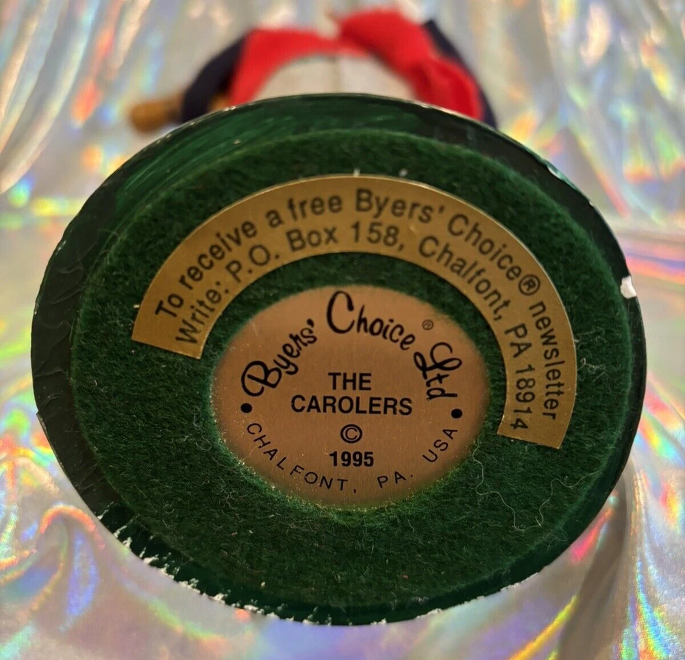This beautiful Byers' Choice figurine lot features three Victorian men with gifts. From the Carolers collection. The intricate details and original design make this a perfect addition to any Christmas decor or collection. The figurines are perfect for collectors or as a special holiday gift. Tallest is 13.5" high. Made in the U.S.A. Good previously owned condition. Man with hobby horse made in 1995, man with plaid scarf is the "Traditional Shopper", man with milk can is the "Traditional Grandparent".