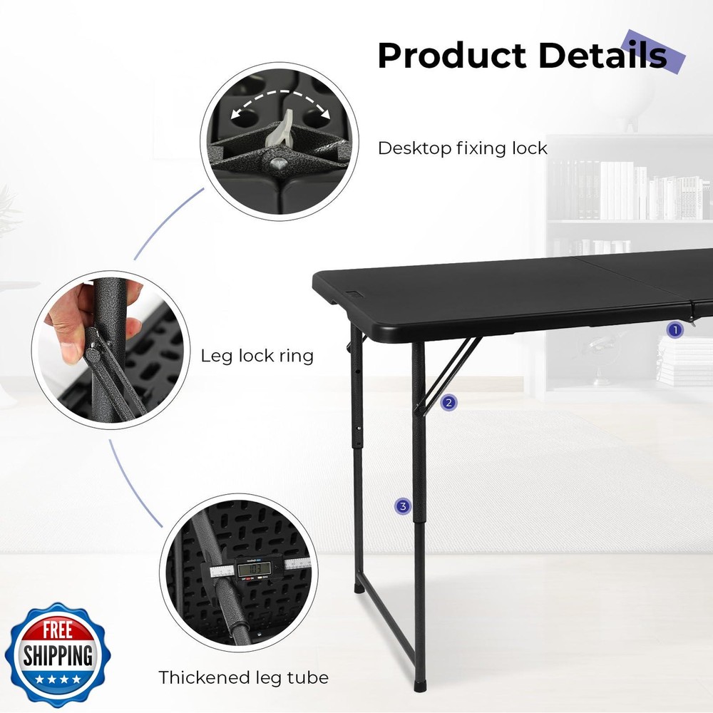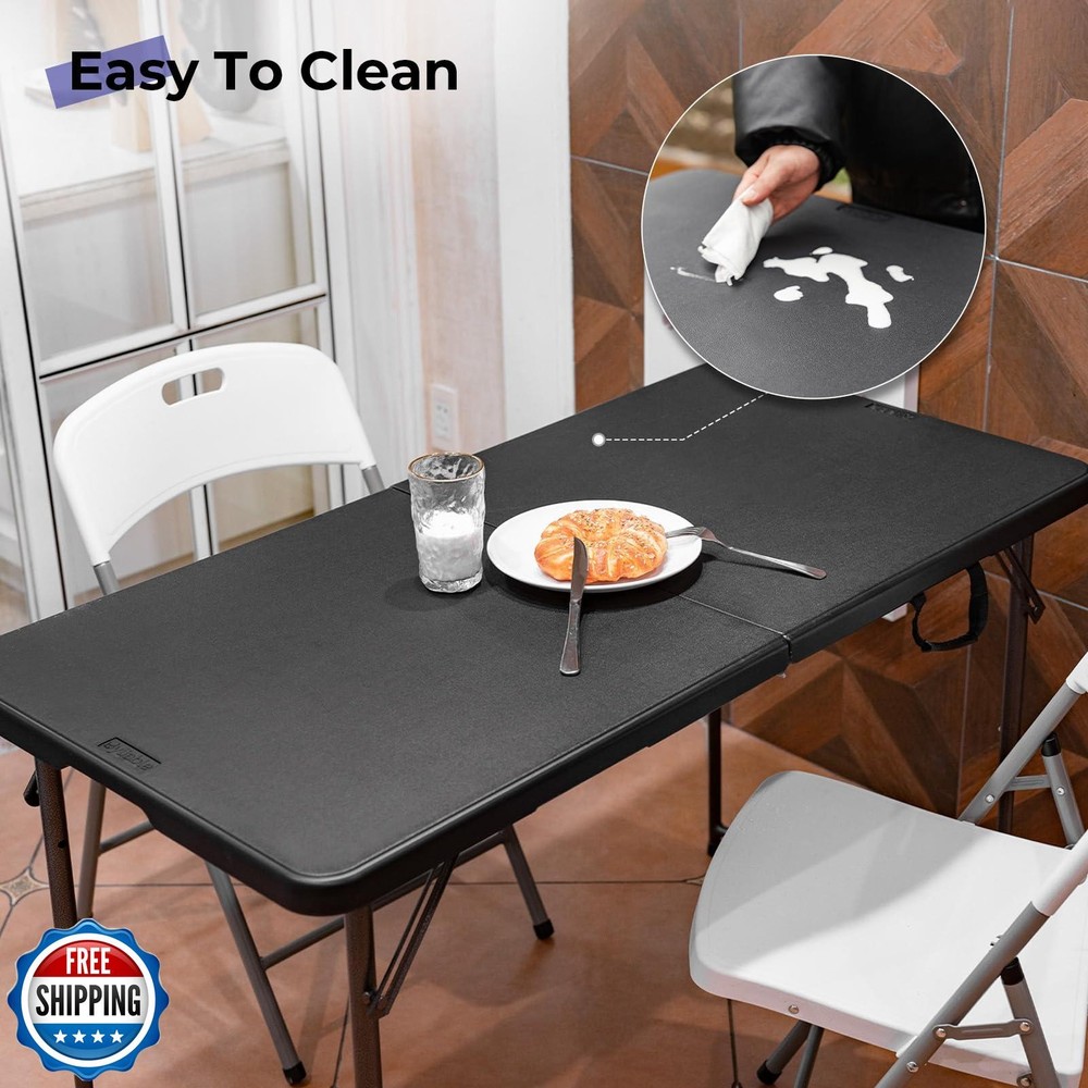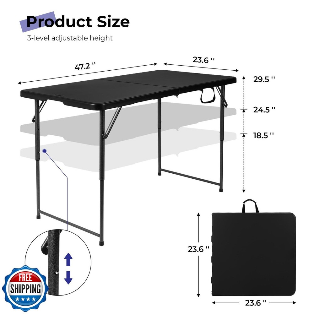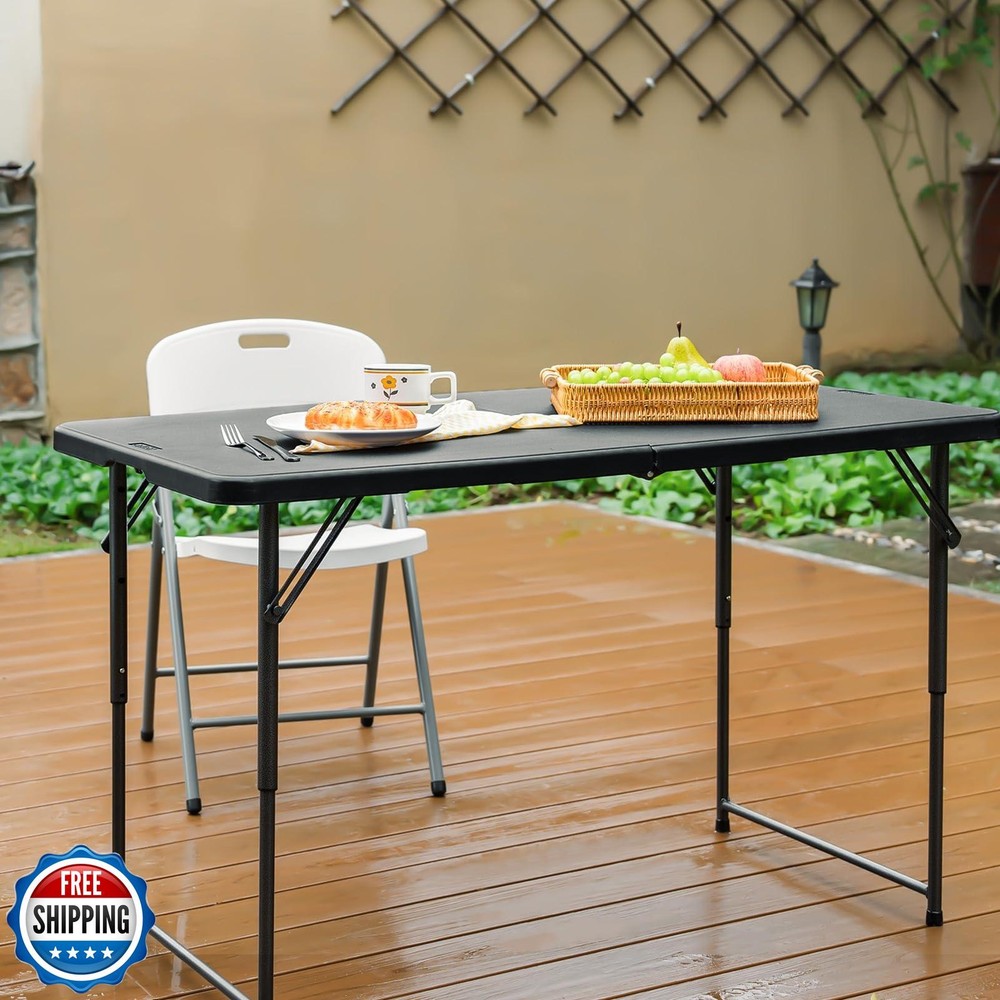 Byliable Folding Table 4 Foot Portable Heavy Duty Plastic Fold-in-Half Utility Table Small Indoor Outdoor Adjustable Height Folding with Carrying Handle, Camping and Party, Black Features FOLDABLE AND PORTABLE: Byliable 4 ft small folding table can be folded in the middle, buckled with a safety buckle, very safe, easy to store. There is a comfortable handle of the table, which is more convenient to carry. Easily fits in the car trunk RUGGED AND STABLE: Made of high-density polyethylene (HDPE), thicker and harder, have better quality. The desktop of this 4 foot folding table is waterproof and not easy to scratch. The soft beveled radius edge is also designed for both comfort and safe STRONG SUPPORT: Powder-coated steel legs and gravity locks help to completely fix the table at any time and any place. In addition, our table legs are also equipped with non-slip foot covers, which can not only protect your floor but also prevent slipping PRACTICAL AND LIGHTWEIGHT: The folding table weights 18 pounds, the unfolded size is 48" L x 24" W x 29.5" H; the folded size is 24" L x 24" W x 2.8" H. It requires no assembly and sets up or folds away in minutes, comfortably seating 4-6 adults MULTI-PURPOSE: Very suitable for outdoor picnic or birthday party table, dining fold out table, barbecue portable table, game table, or as a display plastic folding table, study table or desk for indoor activities Shipping Free & Fast Shipping: We offer free shipping to most of the USA with a normal delivery time of 3-7 days. However, due to the current situation, additional delivery time (up to 3 weeks) may be required for some items. Alternative Carriers: We may use alternative carriers (e.g., USPS, FedEx, UPS) to ensure your package arrives safely and on time. Due to the use of multiple carriers, we are unable to provide a tracking number automatically. Handling Time: Orders are processed and shipped within 1-2 business days of receiving cleared payment. Shipping Restrictions: Shipping to Alaska, Hawaii, Puerto Rico, Guam, and other US territories may incur shipping charges or delivery restrictions. Please contact us before ordering, or your order can be refunded/cancelled. State Restrictions: Certain items may not be shipped to California due to state regulations. Contact for Tracking Updates: If you require tracking updates or have any concerns about the delivery of your order, please feel free to contact us, and we will be happy to assist you. Return Policy 30-Day Hassle-Free Returns: If you are not completely satisfied with your purchase, you can return the item for free within 30 days of receiving it for a full refund or exchange. Easy Return Process: Contact us, and we will provide you with a prepaid return shipping label and detailed instructions. No Restocking Fee: There are no restocking fees for returns. However, the buyer is responsible for return shipping costs if the return is not due to a seller"s error. Refund Processing: Refunds will be processed within 1 business day of receiving the returned item in its original condition. Feedback Your feedback is extremely important to us. We strive to provide the best products and customer service possible. If you are satisfied with your purchase, please take a moment to leave us a positive review. If you have any concerns or issues with your order, please contact us before leaving negative feedback. We are committed to resolving any problems and ensuring your satisfaction. Contact Us If you have any questions or concerns, please feel free to reach out to our customer support team. You can contact us through the eBay messaging system. We are available Monday to Friday, 9:00 am to 5:00 pm EST, and we will do our best to respond to your inquiry within 24 hours. Thank you for supporting our small family business!