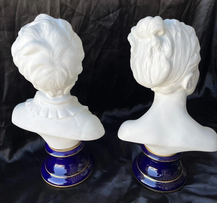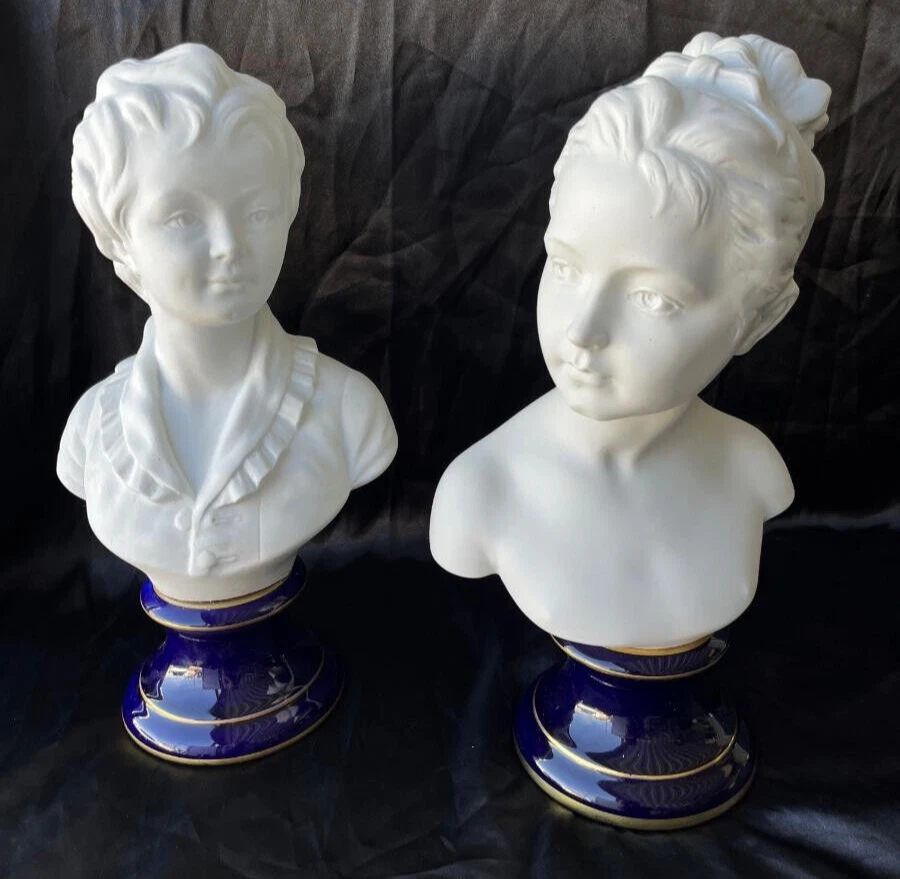 Welcome to Aultimate Antiques, your aultimate destination for all things collectable! I tend to list jewelry, glassware, silver, gold, pottery, & who knows! Enjoy your search...hope to see you again ! Large pair of the most gorgeous vintage Limoges boy & girl busts (reproductions of the original busts of Louise Brongniart and her brother Alexandre by French sculptor Jean Antoine Houdon). These are the biggest sizes Limoges ever made, standing at 15.5” tall. They are handcrafted from fine white bisque porcelain and deep dark cobalt blue bases with gold trim. There is no damage, unusual flaws, as photo'd. There is extra handling fee for insurance. I am always happy to combine shipping on items! I am always open to offers, but please be reasonable. 50% off is NOT going to happen. I like some good old fashioned negotiating, but I get turned off with cheap offers! So please understand, I AM negotiable, and wanting you to own this treasure! I know shipping is expensive! I hate paying for it too. But, I am as thrifty as I can be. Please remember, when you want ME to cut corners...to make it cheaper. It might not arrive to you in the condition I advertised. My goal is to pack it as best as possible to get it to you in the condition I sold it to you. INTERNATIONAL buyers, please understand that once the tracking shows it arrived in your home country; there is little to anything I can do to find your item. You accept all risk for lost articles once it arrives in your country. I can provide tracking history, but that is all I can do. If you are bidding on my auctions just to have fun bidding & don't intend to PAY for the item; then please don't be surprised if I don't let you bid on my auctions, thankyouverymuch. Please note: Please do your due diligence by reading the FULL description above and looking at all of the pictures! My goal is to have a happy customer with a smooth transaction. But I do NOT do returns, I work very hard to photo & describe condition to minute detail. If you don't look at pictures or read the description; it is not my fault when you are unsatisfied. PLEASE READ THE DESCRIPTION! I AM NOT RESPONSIBLE FOR WHAT YOU HAVE READ INTO IT! Personal information (ie: mailing address) is kept confidential. I only use your personal information to complete the transaction. I don't store information or sell it.