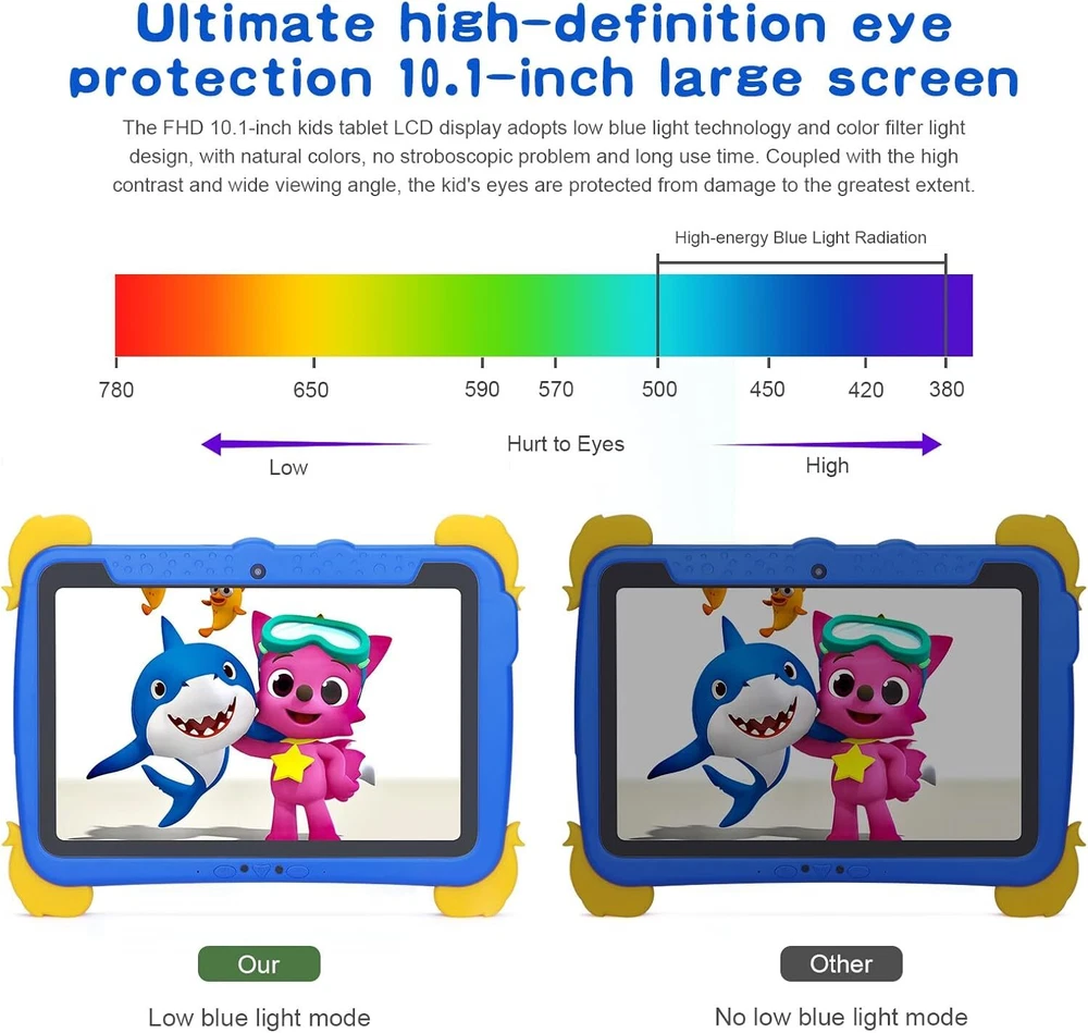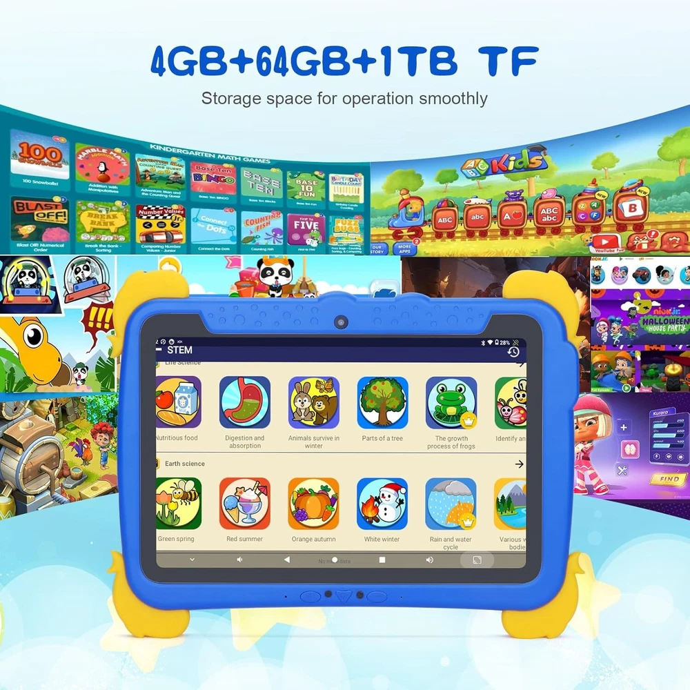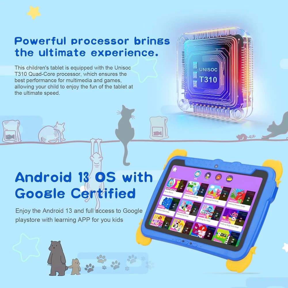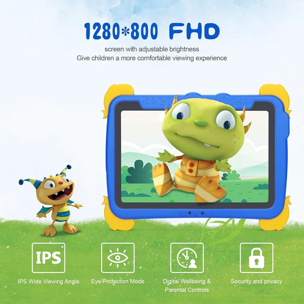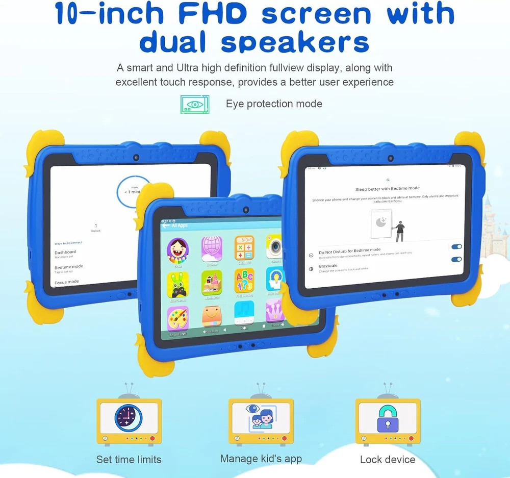 C idea 2024 Android 13 Kids Tablet,10.1 inchTablet for Kids,Children Blue Product Details Brand: C idea Model Name: P1150-Blue Memory Storage Capacity: 64 GB Screen Size: 10.1 Inches Display Resolution Maximum: 1280*800 Pixels 【10.1-inch Full-Fit Technology with Eyes Protection】The C idea Kids tablet has a 10.1inch large touch screen, providing you with enough screen space. There is also a stunning full HD widescreen, with a peak screen brightness of 400 nits, which presents bright displays, abundant colors from all angles, protecting your kids eyes while allowing them to enjoy an immersive entertainment experience. 【Quad-Core Processor + Android 13】This child tablet is equipped with the Unisoc T310 (Quad-Core) is extremely fast and energy. with Android 13 system which is passed GMS certification and is pre-installed with the iwawa app, specially designed for children. Effective games and apps designed to provide innovative digital educational content for kids aged 3-15, learning from having fun. 【Parent or Kids Account】10.1 inch children tablet with parental control mode, creating and customizing profiles for kids’ accounts, filtered content for your kids, control screen time, and surfing safe websites that all is controlled by you. These security settings can be adjusted for kids grow with content tailored to their age on the Parental Control mode. Appropriate Age Grade Over 3 years old kids. The 6000mAh large battery last more than several hours, suitable for long-distance trips. 【Having Fun Of Learning For Children】C idea 10.1 inch kids tablet with 4GB RAM and 64GB ROM and 6000mAh capacity battery life, Really a perfect choice for kids entertainment and online learning.what’s more the Micro SD card (up to 1TB) expand storage allow to download the latest educational apps from the Google Play Store, including YouTube Kids, Netflix and more. 【Durable Kid-proof Case】C idea child tablet comes with a cover case, Durable and lightweight. The tablet case is made of child-safe and non-toxic EVA foam bubble material with adjustable stand to support your kids tablet. It prevents screen breakage from drops and falls. This kids tablet is suitable for toddlers from 3 to 15 years old.