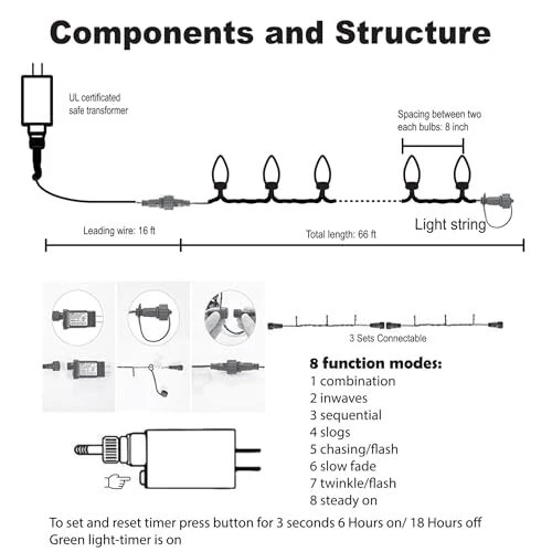 Menu 1. We require immediate payment. 2. We currently accept payment via eBay managed payments only. 3. Once payment is cleared, we will dispatch your shipment within 1-3 business days. Please refer to the "Shipping" tab for more information regarding shipping speed to your destination. C9 Christmas Lights, 100 LED 66 FT Christmas String Lights Outdoor with 8 Modes Timer Waterproof Connectable for Indoor Yard Xmas Tree House Decorations (Red and White) Product description LIGHT SPECIFICATIONS: With 100 LED C9 string lights, each Christmas string lights is 82.5 ft long in total, wire with LED bulbs is 66 ft, lead wire without lights is 16.4 ft, spacing between per LED bulb is 8 inch. LOW SAFETY VOLTAGE: 29V low voltage, keep at a low temperature state after lighting up for hours, ensure the safety.The C9 string light bulb covers are made of high quality material is sturdy. END-TO-END CONNECTABLE: Each C9 string lights come with male and female connectors, connect up to 3 sets together, expandable up to a long 198 ft length, allow you to decorate your lighting area with the desired length.(NOTE:If wanna more brighter when connects, Please do remove the Leading Wire.) 8 MODES WITH TIMER: This C9 Christmas string lights offer 8 distinctive lighting modes, including a combination, wave, sequential, slow glow, chg/flash, slow fade, twinkle/flash, and steady on.(NOTE:Long-time press the button on the adapter, when shows green lights, timer works.) IP44 WATERPROOF: Lights can be utilized both indoor and outdoor without worry of rainy weather, convenient to place it anyw as you like. Please note: the power plug should be protected from water. PLEASE MESSAGE US IF YOU HAVE ANY OTHER QUESTIONS, AND MANY THANKS FOR READING ALL OF THIS. Copyright ©#. All Rights Reserved.