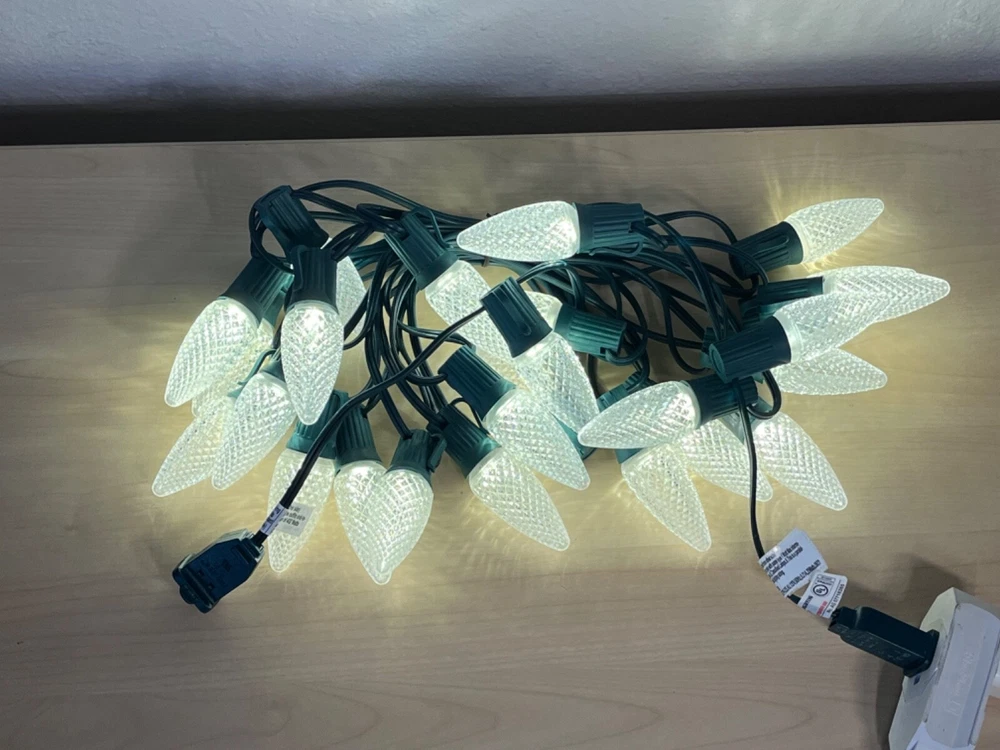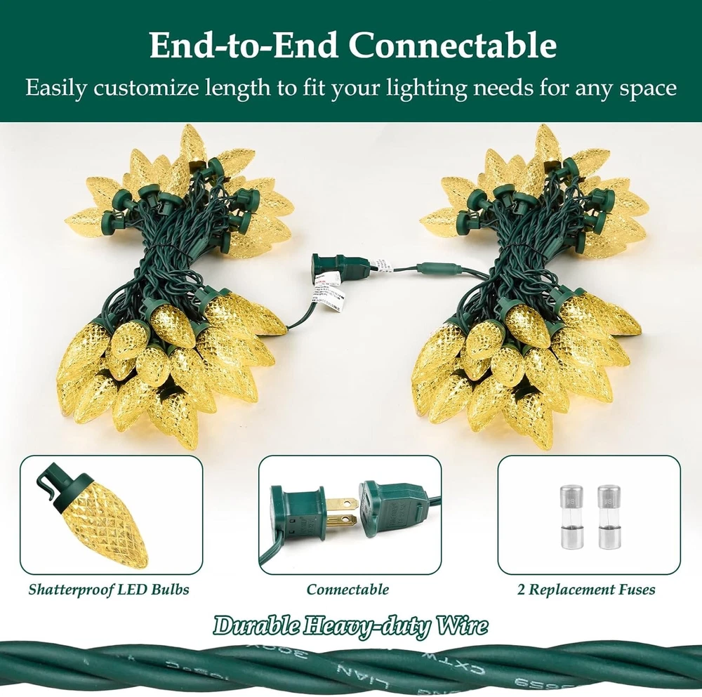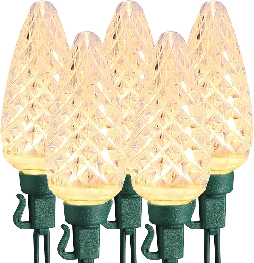 - C9 Christmas String Lights Outdoor 25 Feet 25 Led Fairy Lights Faceted Strawberry (1 Spare) 17 Sets Extendable UL Certified for Party Holiday Wedding Indoor Decoration (Multicolor) - *Brand New - DOES NOT INCLUDE ORIGINAL BOX* Product details Color Multicolor Brand Brightown Indoor/Outdoor Usage Outdoor, Indoor Light Source Type LED Power Source Corded Electric Theme Holiday,Christmas,Wedding Super Bright and Rectified: Each bulb with built-in 2 pieces high brightness SMD LED beads and highly water sealing husk, the rectifier equipped inside the bulb base for preventing strobe lighting and extend the bulb lifespan Connectable and Dimmable for Accent Lighting: Up to 17 strings (425 feet) by end to end connection for satisfying your wide range decoration, no need to elongate it by any tools.This C9 Christmas lights string adapts to PWM dimmer, freely adjustable brightness for various occasions like birthday, wedding, party, bride shower, marriage, anniversary UL Certified: UL listed and commercial grade for avoiding electric shock or fire risk, 1 spare fuse and 1 spare bulb included for easy replacement, fantastic for bistro, bar, pub, coffee shop and mall decor Shatterproof and Parallel Wiring: Highly impact proof bulbs can withstand accidental falling off from hanging position, and the parallel wiring will provide you reliable lighting, if one bulb dead, the others will still keep lighting Waterproof for Indoors and Outdoors: Perfect indoor and outdoor Christmas lights decoration for dressing up your house roof line, patio, garden, porch, backyard, Christmas trees, fence, railing, awning, banister, handrail, cafe. Note: the power plug should be protected from water NOTES: A25