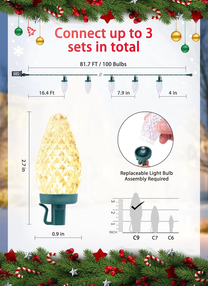 Special Features: LED C9 Strawberry-Shaped Bulbs, Christmas Tree Decorations, 8 Lig UPC: 313037556595 Power Source: Corded Electric Occasion: Village Rustic Yard Porch Room House Garden Voltage: 120 Volts Type: Does not apply Bulb Base: E17 Brand: Does not apply Water Resistance Level: Waterproof Control Method: Remote Number of Light Sources: 100 Batteries Required?: No Item model number: JT-EL/FC300V0200-C Color: Warm White Package Dimensions: 7.17 x 7.17 x 6.46 inches Indoor/Outdoor Usage: Outdoor Light Color: Warm White Light Source Type: LED Size: 1 Pack Controller Type: Remote Control Color Temperature: 2.6E+3 Kelvin Special Feature: function(f) {var _np=(window.P._namespace("DetailPageProductOverv Included Components: 102 LED C9 Christmas Lights (2 spare bulbs) Material: Plastic Style: Antique Seasons: Christmas Number of Items: 100 Theme: Halloween Day, Thanksgiving Day, Christmas Day, New Year Usage: Indoor & Outdoor Christmas Decorations Use Bulb Shape Size: C9 gtin13: 313037556595 Item Weight: 3.23 pounds